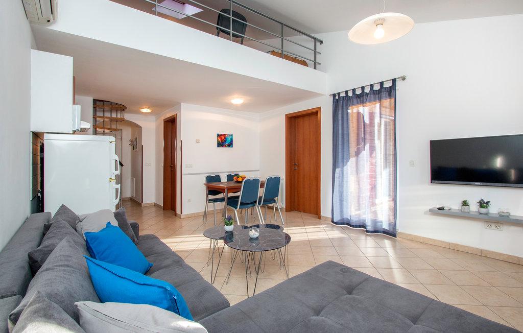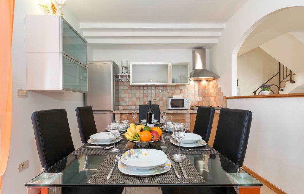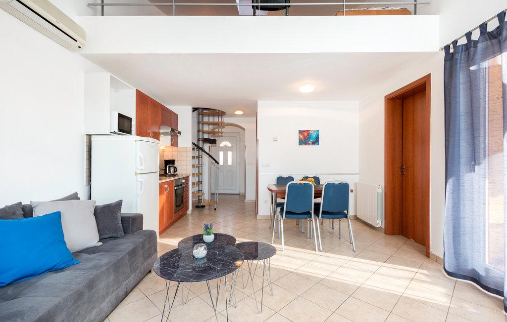 APARTMENT OLIVA IS simply and practically furnished, located on the first floor of a small building located in a quiet part of the tourist town of Volme. The accommodation has internal communication in the form of spiral staircases that connect the first floor with the attic where there is a gallery and one room. The pool and garden are common to all tenants of the building, and on the ground floor there are covered common paths where you can spend a pleasant time in the shade. ISTRIANA HOUSE is a holiday house located in the same village. The ground floor has a kitchen, living room and bathroom. On the first floor are two bedrooms and another bathroom. In one bedroom there is a double bed for two people. The second room has three beds and another extra bed, and this room can accommodate 4 people. In the living room can sleep two more people on a sofa bed. The house can accommodate a total of 6 people. The house has its own yard with grill, parking, satellite TV, two air conditioning units, use of shared pool and internet.