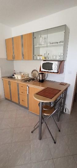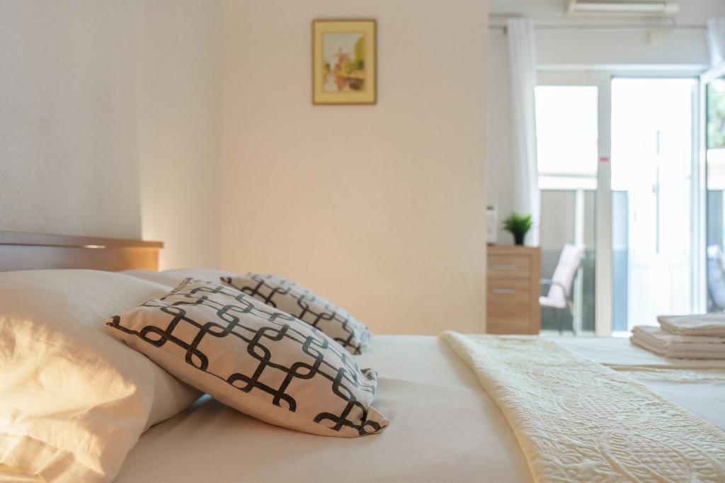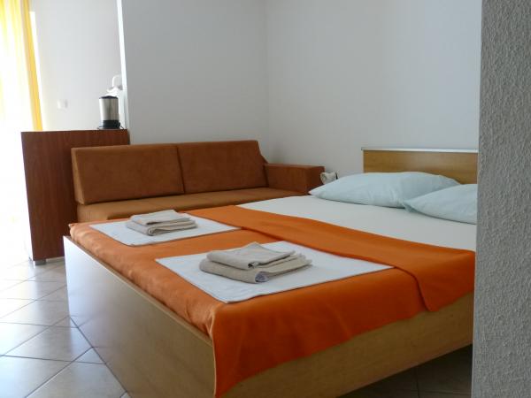 House in a quiet part of town in a cul de sac with little traffic. Distance from the beach is about 500m (about 5-10 minutes walk). The house has several apartments that are equipped to accommodate 2, 3, or 4 people. All apartments are air conditioned and modernly equipped with everything you need for a comfortable stay. Year of construction is 2008. Most apartments have a sea view. Parking spaces are provided for all guests. Tourist tax 1 € per person per day All other costs are included in the price