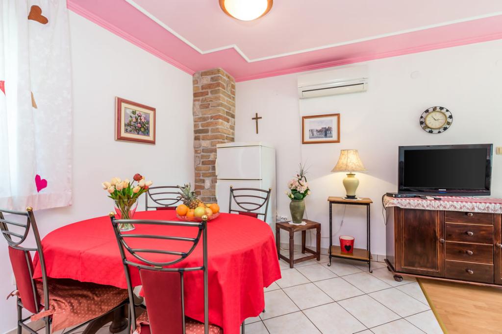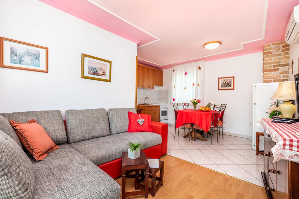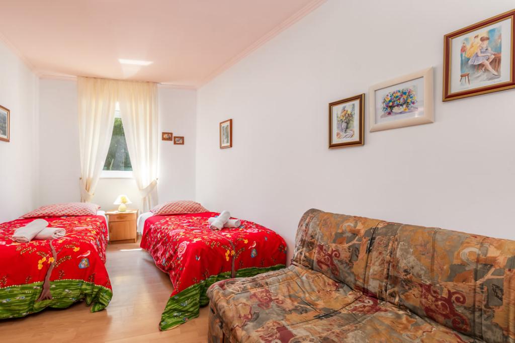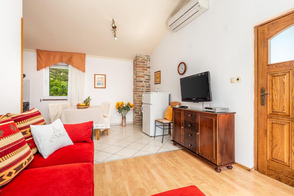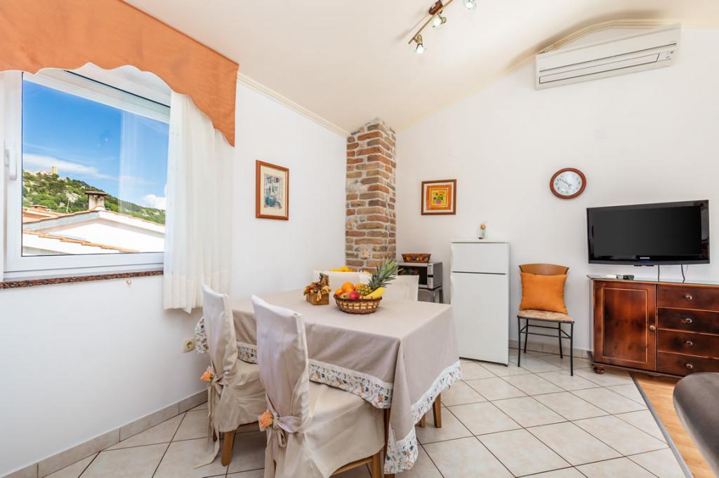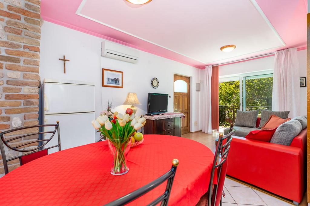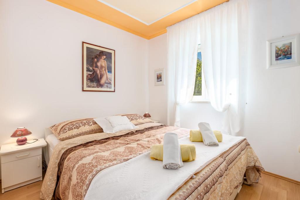 Apartments Patricia are located in a quiet location close to the center, a 5 minute easy walk (350 meters) to the beach, which has a European blue flag. The apartments are 60 square meters, equipped for 4-7 persons. The apartments are newly renovated, consist of one bedroom with double bed, one room with two to three beds, bathroom with WC, spacious and fully equipped kitchen, and living room with armchair and satellite TV. Each apartment has a balcony. Guests of the apartment have a barbecue with a terrace surrounded by greenery and a parking space in front of the house. The apartment has air conditioning and internet.