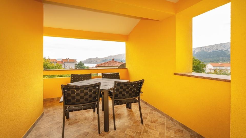 Apartment in a quiet part of Baška on the island of Krk, the facility is located 400 meters from the beach and 200 meters from the center. It has a terrace overlooking the sea. The wi-fi is included in the rental price. covered parking and air conditioning.