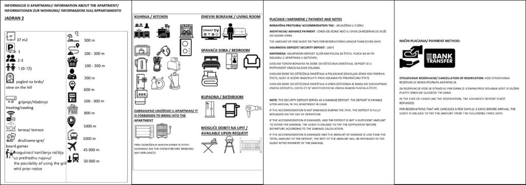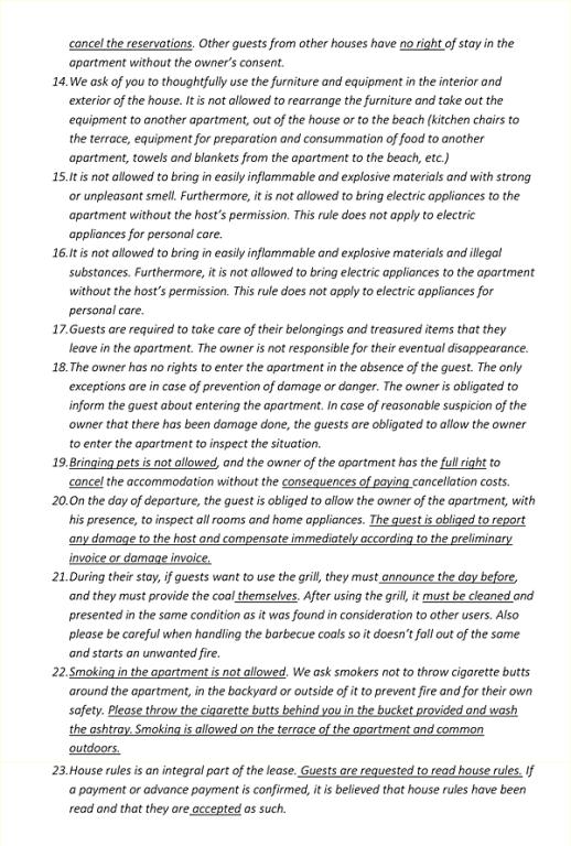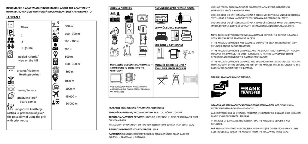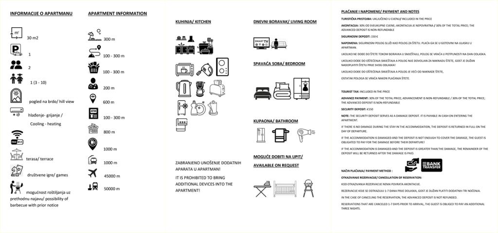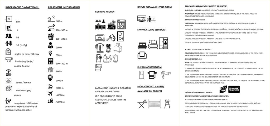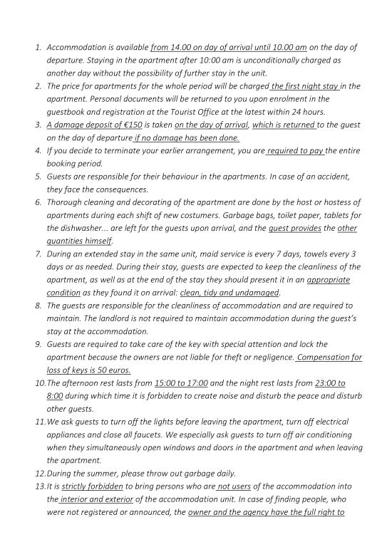 Residential tax is included in price.Advance payment is the amount paid by the guest to the account of the owner of the apartment and it is the amount that guarantees the arrival of the guest to the owner of the apartment and the reservation of the apartment to the guest for a certain date and a certain number of people, and is compensation in case of non-arrival of the guest; an advance payment of 30% of the total price is taken and is non-refundable. The rest of the amount is paid by the guest upon entering the apartment, and after payment and check-in, the invoice is given and the documents are returned. Upon arrival, the guest pays a deposit in case of damage in the amount of €150, which is returned to him on the day of departure if he has not caused any damage. In case of damage, the deposit remains with the owner of the apartment to cover the damage in the amount of the damage. If the amount of damage is greater than the deposit, the guest is obliged to pay immediately. If the guest decides to end his stay early, he is obliged to pay the full amount. In case of violation of the house rules, the agency or the owner of the apartment has the right to cancel the reservation, and the amount from the next day until the end of the stay is returned