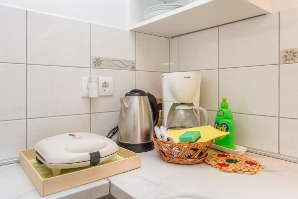 Villa Mirica 4 stars - has 4 modern, fully and contemporary equipped apartments (2 and 2). Area: 40 m², and 10 m2 covered private terrace in a quiet area of Baška with a view of the garden and a quiet street. The facility is located within a 5-minute walk to Vela Beach and all amenities. The beautiful Mirica apartments have one double bedroom, bathroom with shower, hairdryer, washing machine and detergent, kitchen with dishwasher, refrigerator and hair dryer, living room with sofa bed and 5 cm mattress topper for comfort, ironing board and iron, toaster, kettle, microwave, hot air fryer. One apartment can accommodate up to 4 guests. The apartments are modernly equipped, with free Wi-Fi, free parking covered with solar panels, air conditioning, private terrace, TV, SAT, safe, bed linen, towels. All 4 of our apartments are identically and identically equipped. There is an electric vehicle charging station on request in the parking lot. There is a barbecue in the garden that guests can use. A cot and high chair are available on request.