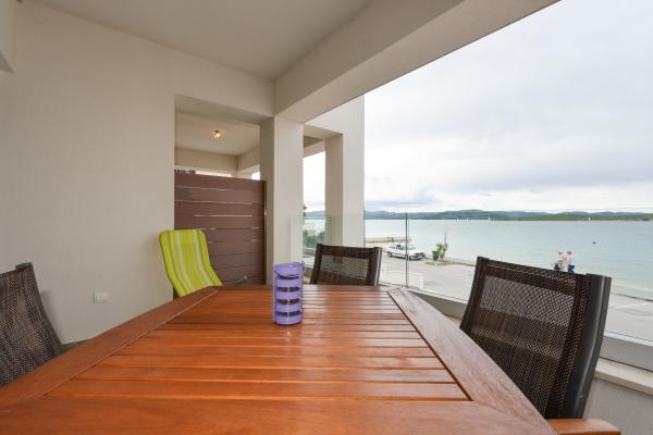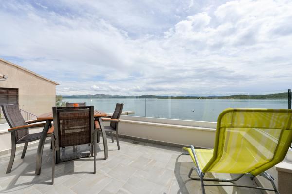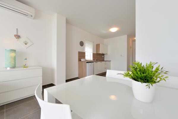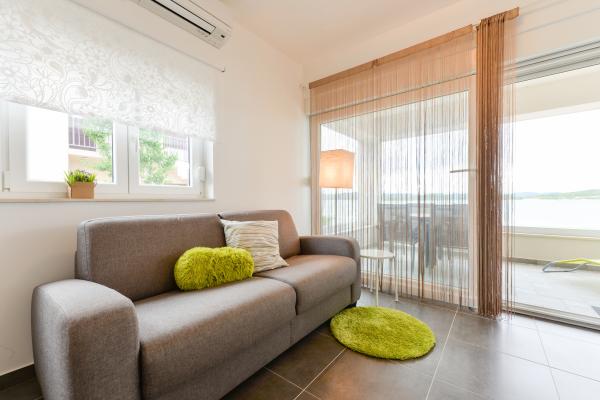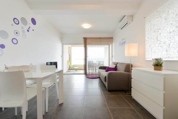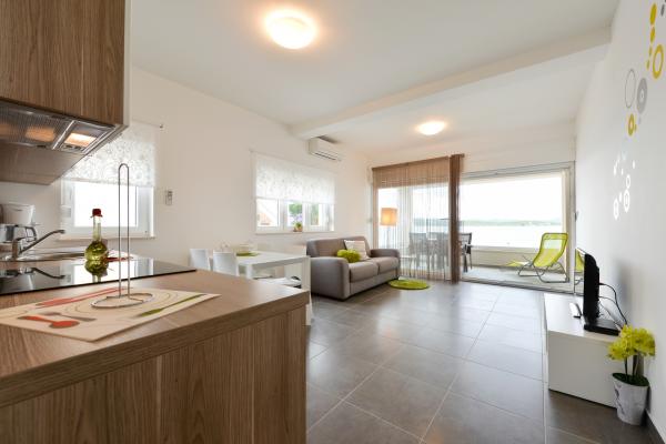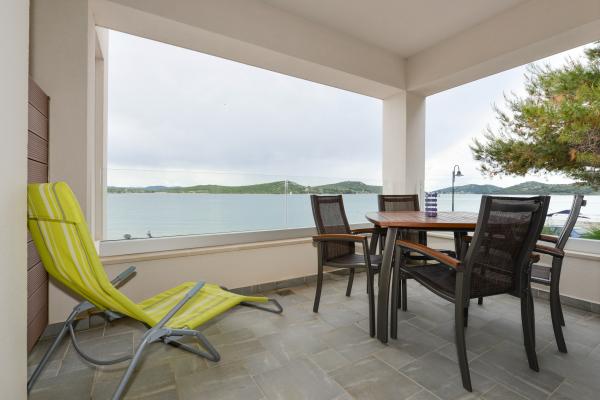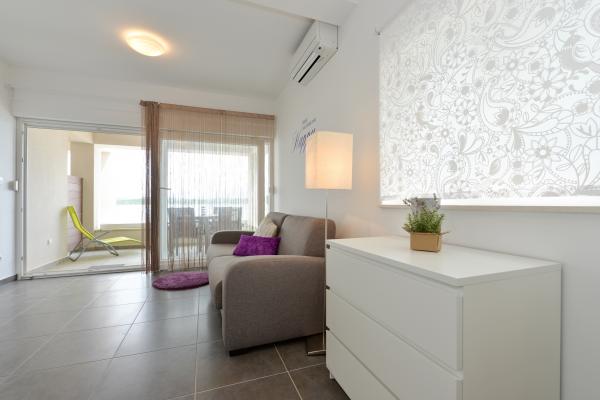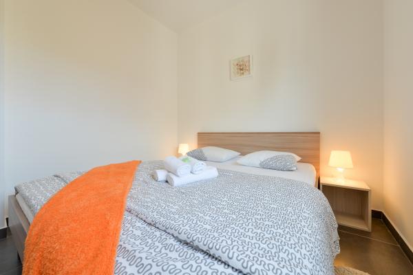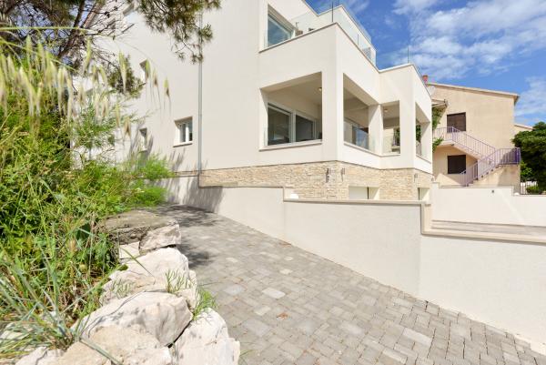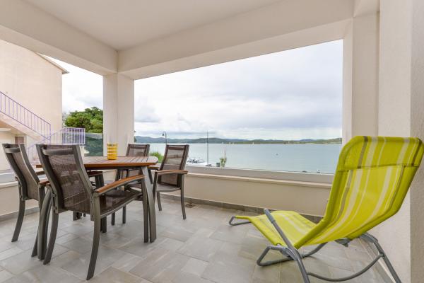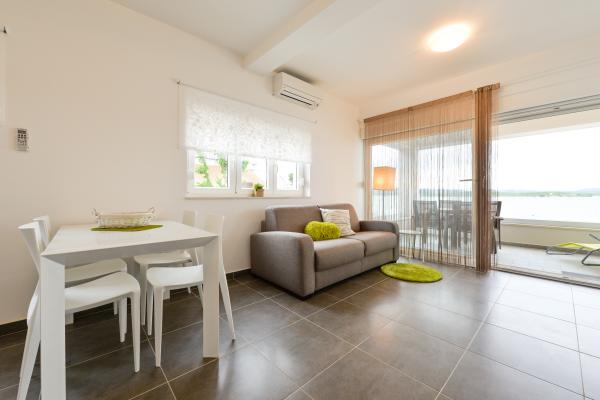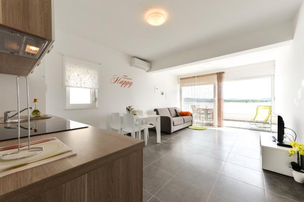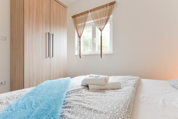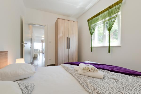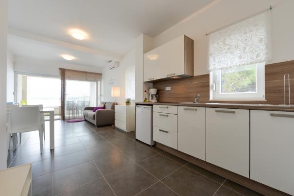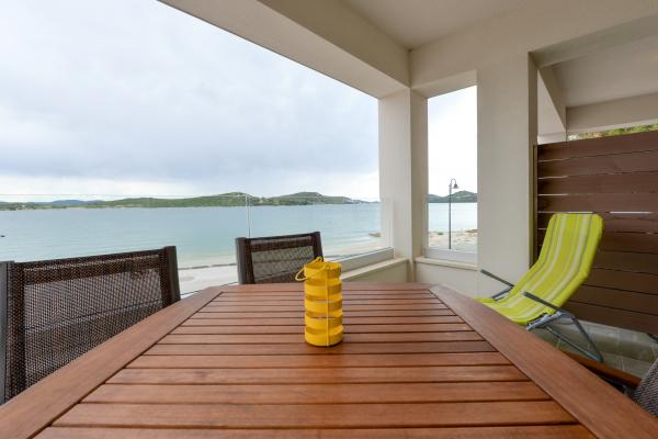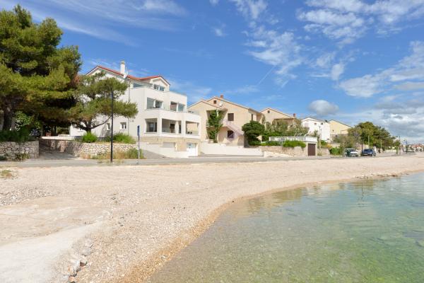 We will welcome you in the new build house located first row by the sea with four equipped and comfortable apartments of 40 m2 with 2 2 beds. You can use bikes for morning shooping, the barbecue and place for relaxation and fun in the garden. You have your own parking place and the possibility to use sun luongers and parasols for the beach. To the nearest sandy or rocky beach you will just have to cross one non-traffic street wich you can use, over the evening hours, for long walks or bike riding. At a distance of 300 m there are bars, restaurants, shops, the post office and the pharmacy.