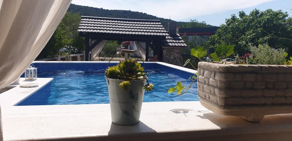 On the shore of Prokljansko Lake (bay) we rent three fully furnished apartments with a pool for a total of 12 people. The facility is located close to the beach, playground for cafe bars, restaurants and mini market. You can also enjoy the National Park Krka and Kornati. APARTMENTS 1 and 2 are for 8 persons and are located on the floor of a family house, fully equipped, each consisting of one bedroom with double bed and a spacious living room with two extra beds for two persons, kitchen, bathroom and terrace. APARTMENT 3 is for 4 persons and is located on the 2nd floor of a family house, fully equipped and consists of one room with a double bed and the other two extra beds for two persons, kitchen, bathroom and spacious terrace. Apartments have their own fenced parking. All accommodation is air-conditioned and equipped with washing machine and dishwashers and has WiFi.