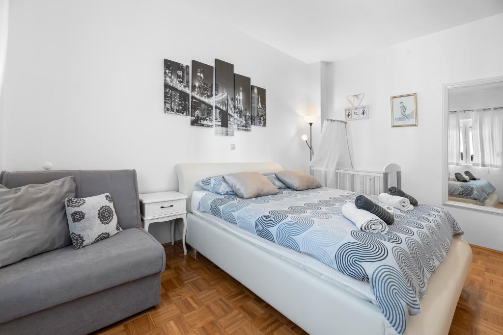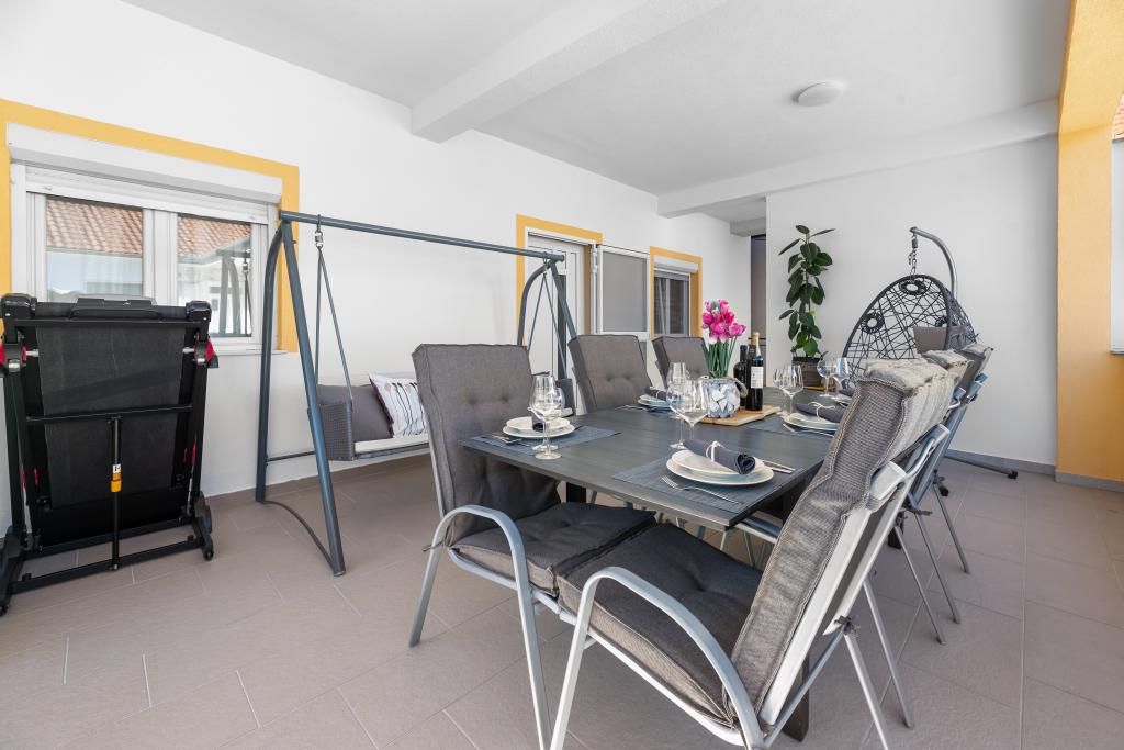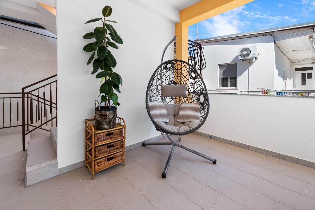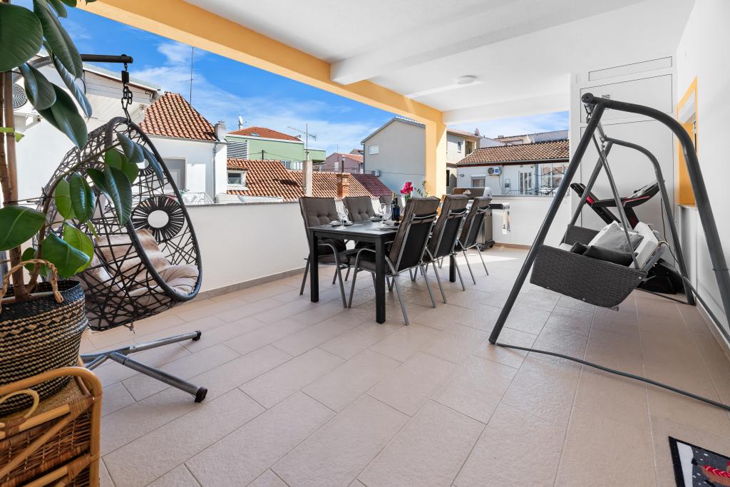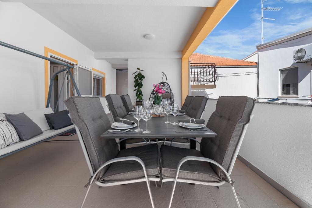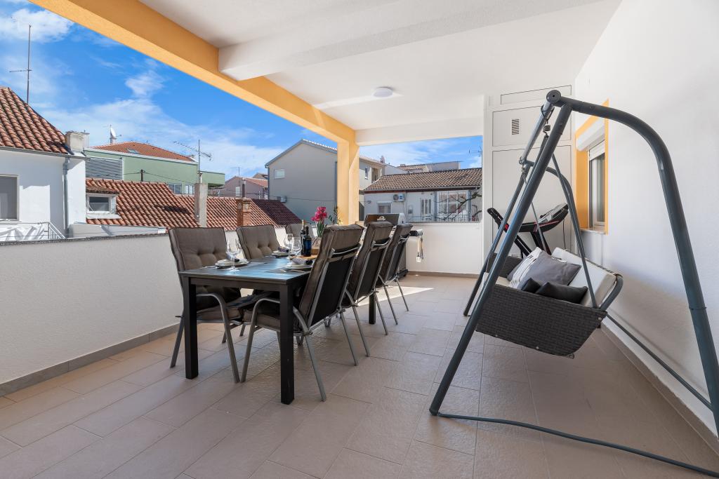 Apartment for rent in the very center of Biograd na Moru. We have been dealing with tourism since 1950. The apartment is fully equipped: air conditioning, refrigerator with freezer, oven, washing machine, dishwasher, max TV, Netflix, wifi, etc... In the immediate vicinity of 100 meters is Dražica beach, which is also the most beautiful beach in Biograd, and has been awarded blue flag for the most beautiful beaches of the Adriatic. There are also numerous shops, cafes, restaurants, banks and everything else around us. The apartment has 3 stars and secured parking. Apartment ZARA is for max. 8 people and is located on the first floor of a family house and has two bedrooms and a large living room with a sofa bed. In front is a large terrace with a table and chairs, and a beautiful swing for resting and enjoying the sun. We have a cot if needed.