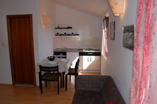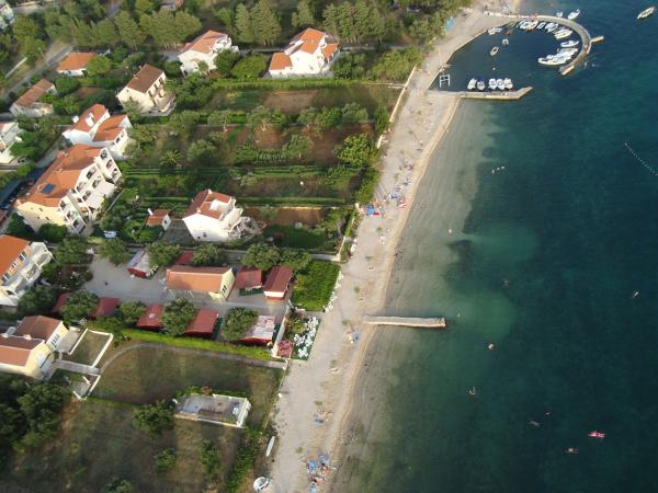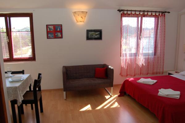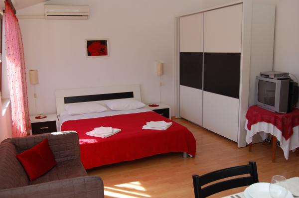 Our residence includes 8 apartments for 2+2 people , and 4 studio apartments for 2 people. All apartments have one bedroom for 2 people (with a double bed), bathroom with shower, spacious fully equipped kitchen and living- room (with a comfrotable sofa-bed for 2 people) and balcony with magnificent sea view. Each apartment has SAT/TV, air condition, internet Wi-Fi and parking place all included in the price. Studios offer standard accommodation for 2 people. It is a room (with a double bed) with fully equipped kitchen and bathroom with shower. Studios have no balcony and no sea view. Each studio has SAT/TV, air condition, internet Wi-Fi and parking place all included in the price. The accommodations are surrounded by garden full of greenery and in the privacy of the property there is open grill available for outdoor pleasure.
