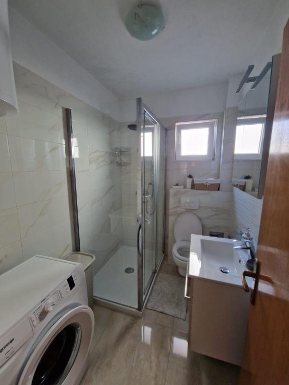 We are renting a three-room apartment in Biograd na Moru. The apartment consists of: two bedrooms, two bathrooms with showers, two balconies (one in each room) and a large balcony in front of the entrance to the apartment, a living room with a large sofa bed, a new and modernly equipped kitchen and a hallway. As for household appliances, the apartment is equipped with a washing machine if necessary, all kitchen appliances and a new refrigerator, in the living room there is a plasma television with foreign programs and other things. There are three air conditioners in the apartment, and each room is equipped with its own air conditioner to make hot temperatures easier to bear. The apartment is located 5 minutes from the beach, in the city center with all the necessary facilities nearby (shops, health center, station, city parks, etc.). Parking spaces are also available in the yard in front of the apartment.