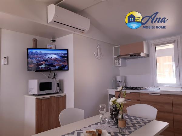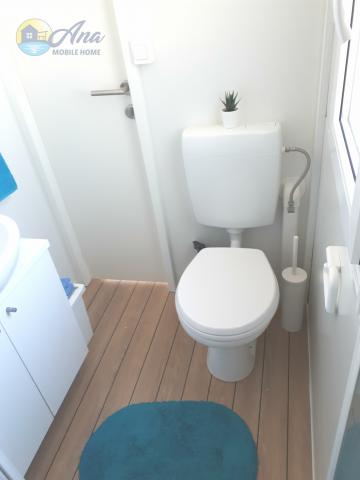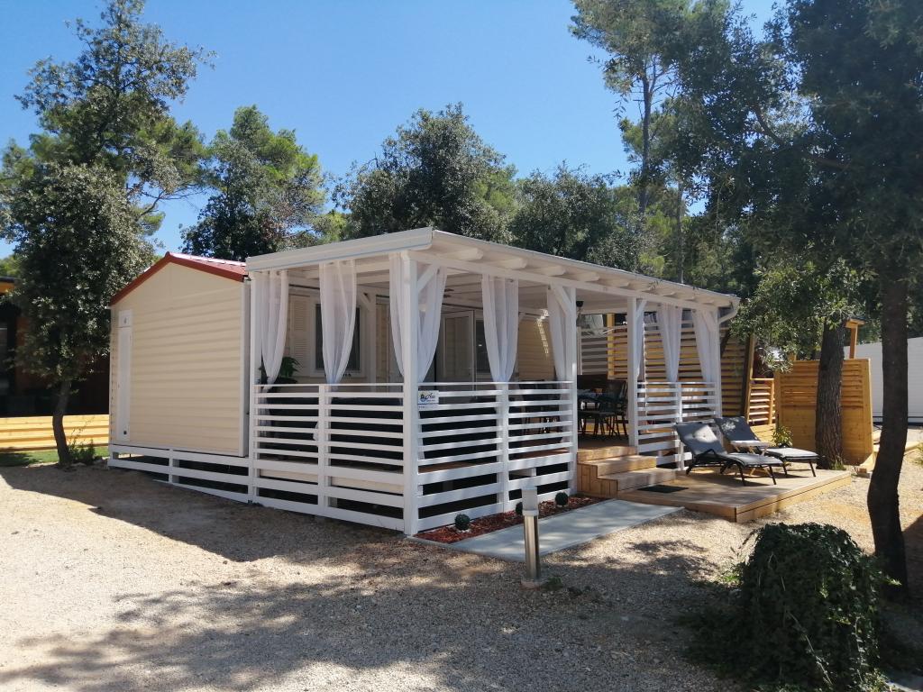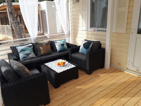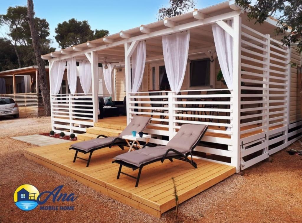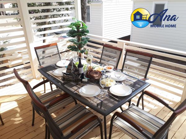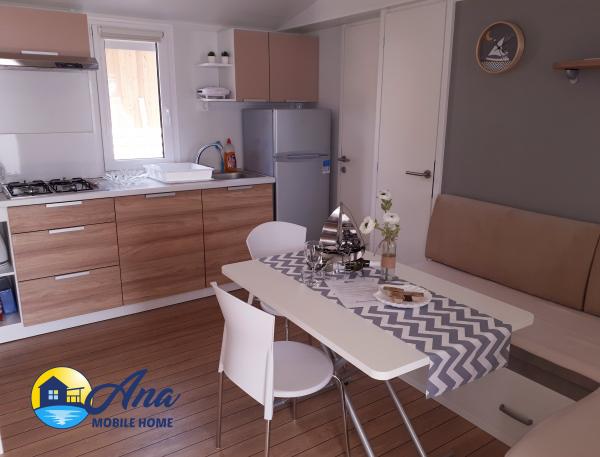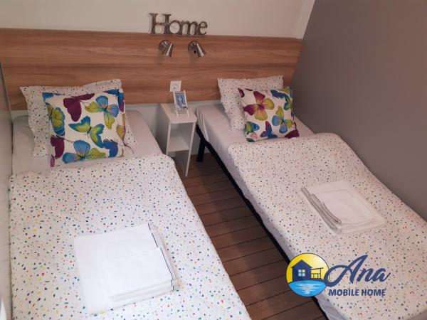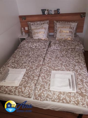 Mobile Home Ana is a new, complete and modernly equipped mobile home. The cottage has a bedroom with a double bed, a bedroom with separate beds and two bathrooms with spacious showerheads with towels. The kitchen is fully equipped with air conditioning, microwave, water cooker, coffee maker, toaster, iron, fridge with freezer and accessories needed for a comfortable stay. In the living room there is a three seater and a table with 2 chairs. On the spacious terrace there is a three-seater, armchair and day table, and part with relaxation lounges and a part with a table and six outdoor dining chairs or just drinking taps and a large outdoor fan suitable for a comfortable stay. The terrace is also equipped with airy curtains that give fresh air. On the terrace there is also an electric barbecue and baking tray. Parking space next to the cottage, distance to the sea 5 min easy walks. Within the camp there is a wonderful children's playground, shop, Internet / Wi-fi, smart tv and satellite program