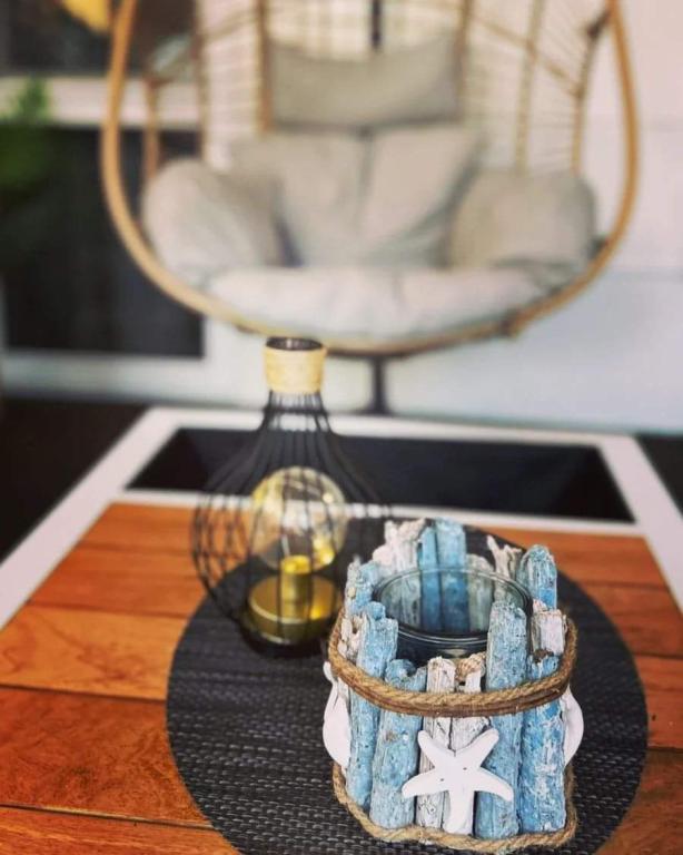 The house contains: 2 bedrooms, kitchen (complete small inverter), dining room, bathroom, fully equipped covered terrace 32 m2, baby cot, baby feeder, iron, hair dryer, coffee machine, kettle, barbecue, toaster, Microwave oven, Hot air fryer, Stick mixer, Mixer, Nutri bouquet mixer, Towels, Bed linen...