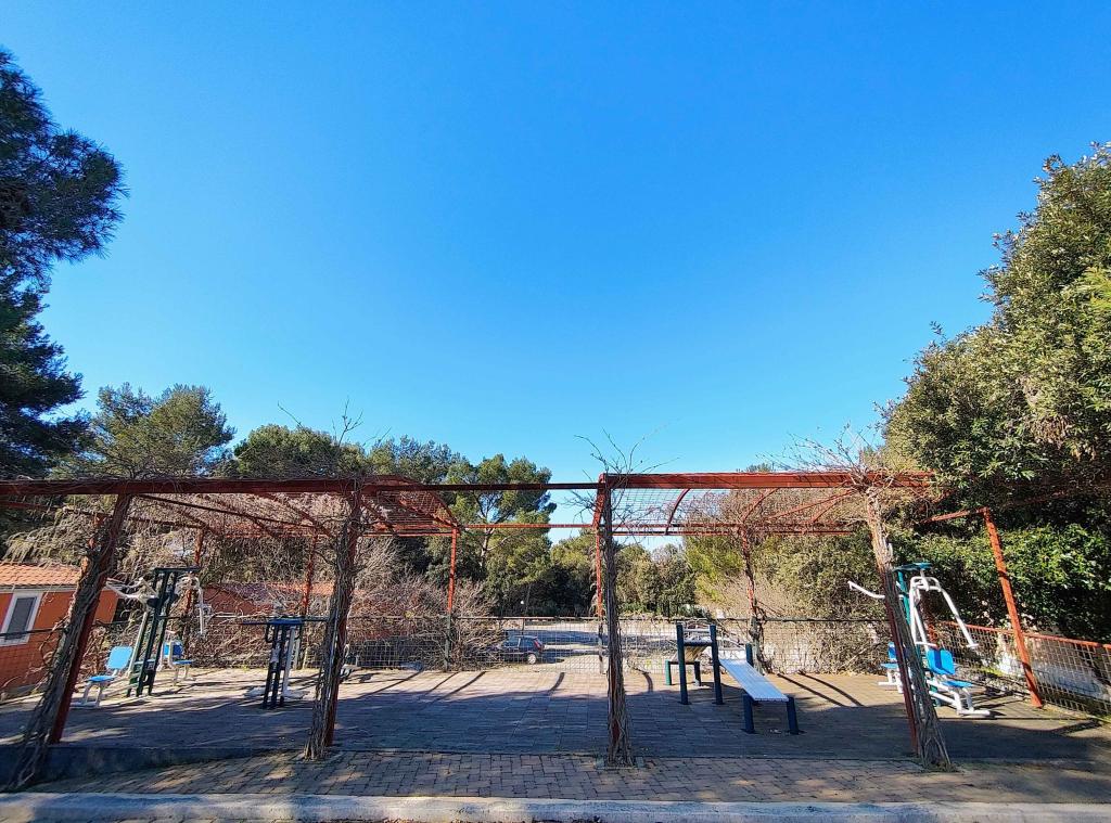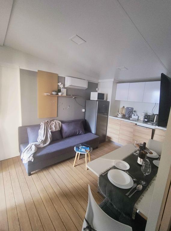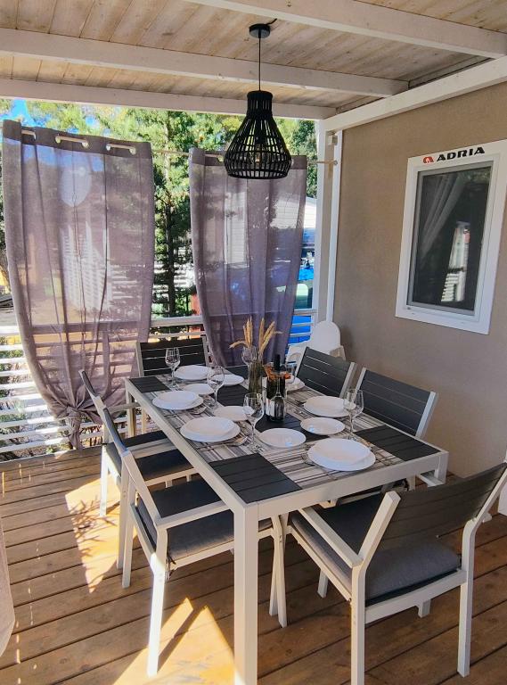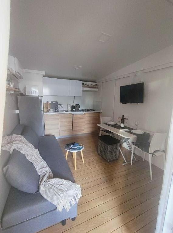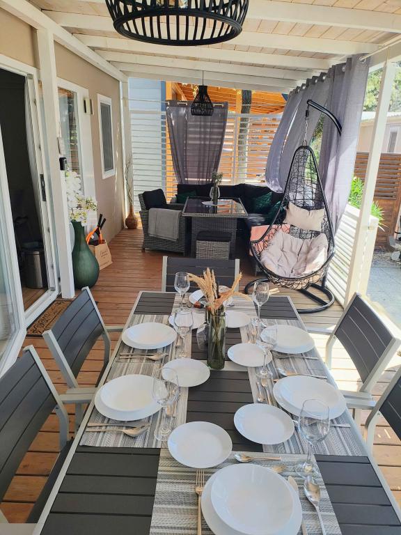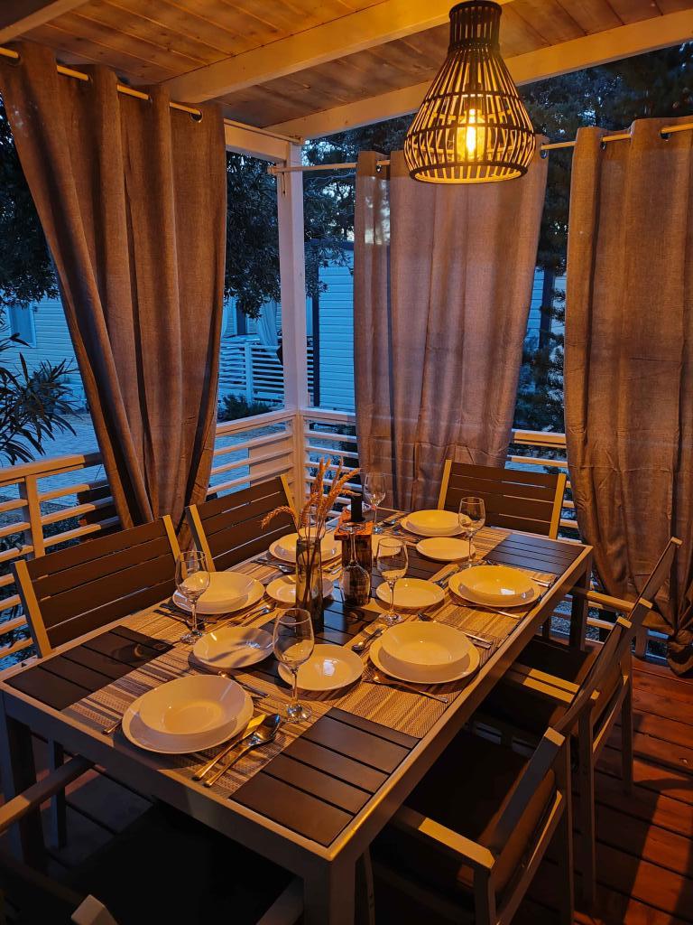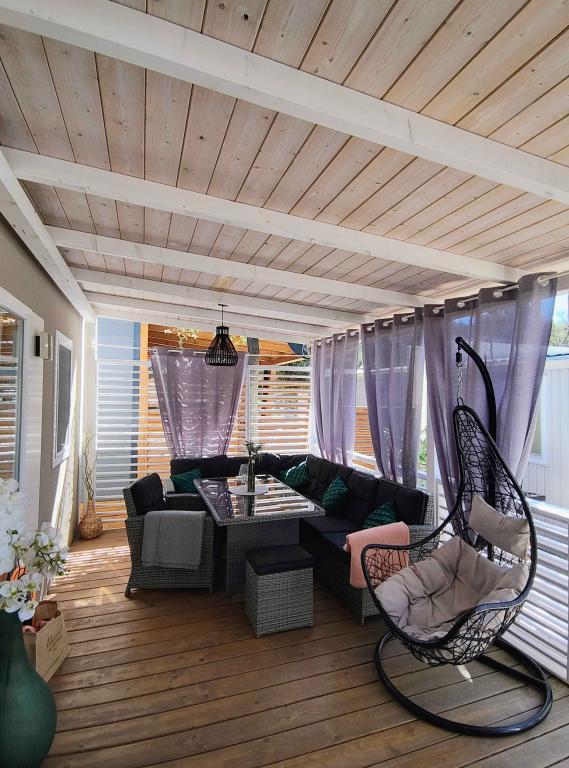 Our modernly equipped mobile home offers comfortable accommodation for up to 7 people, with 2 spacious bedrooms, a living room with a sofa bed and 2 bathrooms. Enjoy the large covered terrace equipped with a dining area and an outdoor living area, ideal for long evening gatherings, while grilling on our large gas grill and outdoor stove. The covered terrace is surrounded by pine trees and a gentle breeze from the sea. On one side of the terrace there is a spacious dining area, and on the other side, our outdoor living area offers a comfortable seating area, and there is also an "egg swing" for complete enjoyment. Also, in the open area, you can enjoy the sun or shade, on a large comfortable deck chair with a small table, where you can also enjoy cocktails or a cold drink, or read a book. The house is located 3 minutes from the beautiful beach.