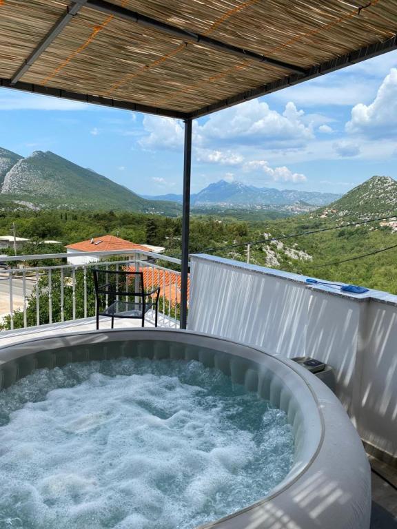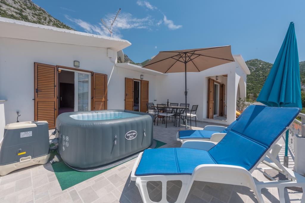 Fully equipped, newly renovated, comfortable apartment - 105m2 in a quiet environment - 4 km from the sea, 10 km from the famous Punta Rata Brela beach (free parking ticket for our guests). Max. 4 adults + 1 child. Fully air-conditioned building (3 air-conditioning units), 2 bedrooms, 2 bathrooms, kitchen and living room, 2 terraces, 1 panoramic 45 m2, large with jacuzzi. In front of the house in the yard - parking for 2 cars in the shade. The spacious apartment occupies the entire 2nd floor of the house and provides complete privacy, beautiful sunsets, a panoramic view of the surrounding small towns and the Biokovo Nature Park will make your vacation unforgettable.