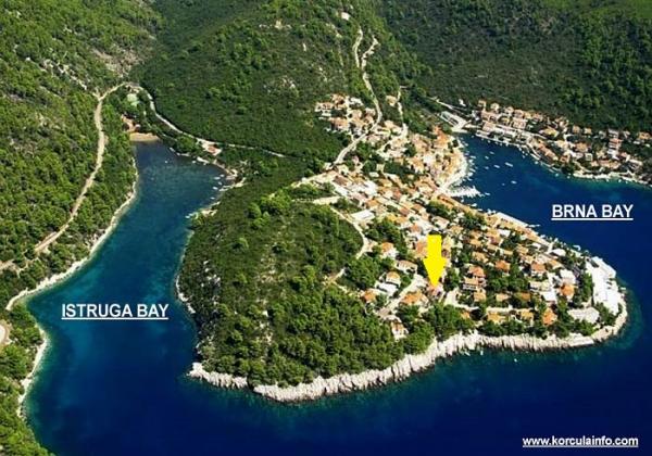 The apartments are located in a quiet bay Brna on the south side of the island. We offer three apartments and a studio. Studio is suitable for 2 people, located on the ground floor, room and toilets, kitchen and terrace. Apartment 3 +1 and 2 +2 persons are suitable for families with children, while Suite 4, which has two bedrooms and is suitable for families and couples. The apartments are located near the sea and out of the city center, allowing guests to enjoy the peace and quiet. Center Brna from the apartment is 150-200 meters, there are shops, restaurants, post office, cafes and tourist office. Near Brna is the sandy beach Istruga known for its healing mud, which occurs naturally and I use to treat rheumatic diseases. Istruga offers sporting facilities and so is suitable for children.