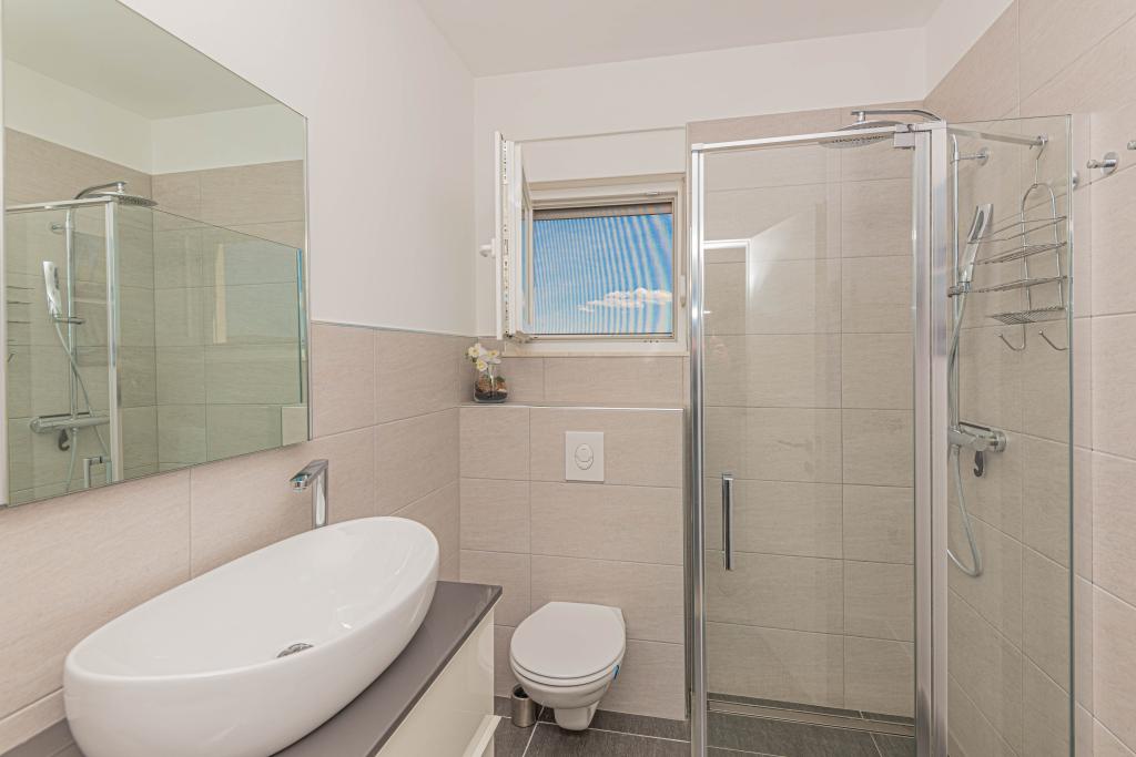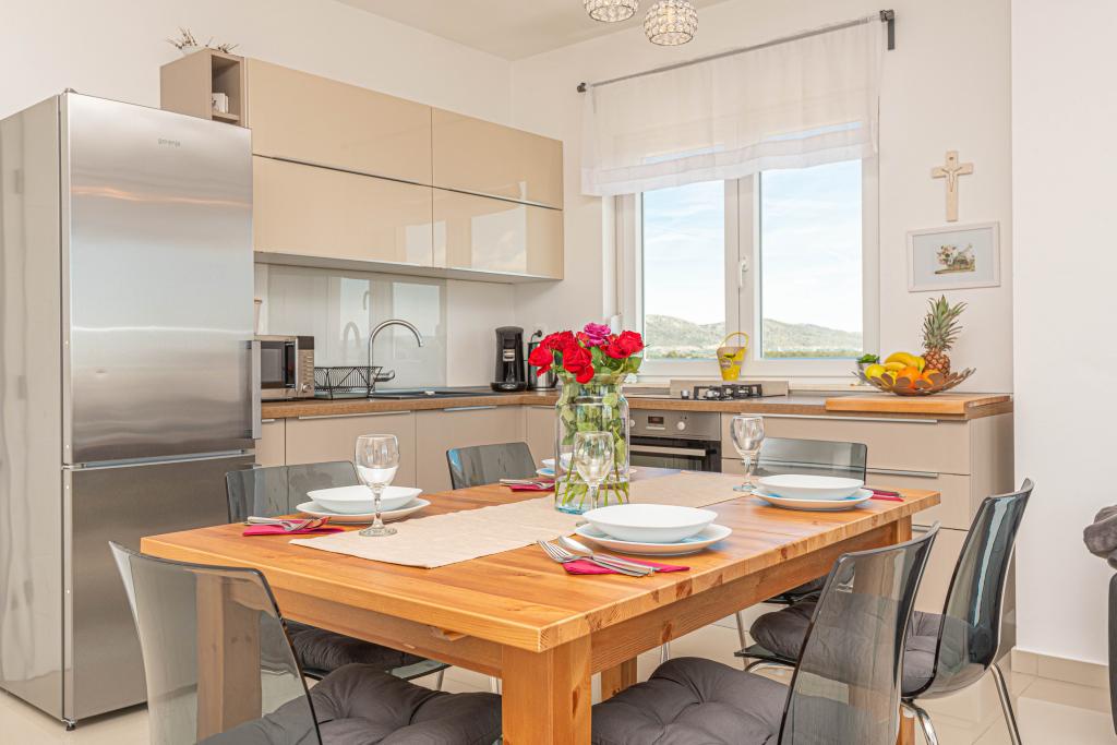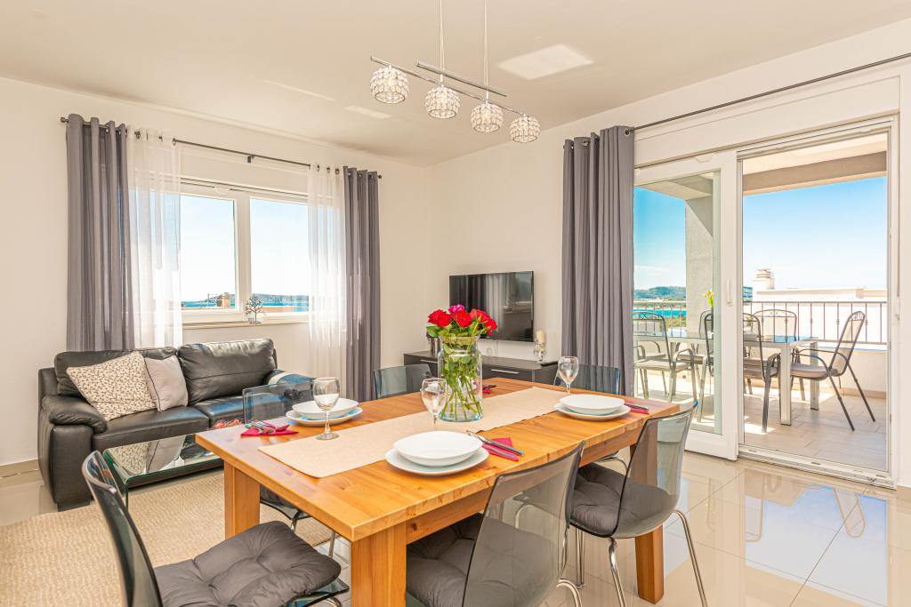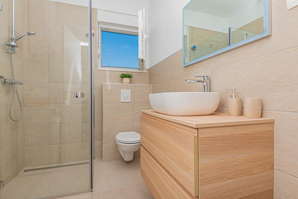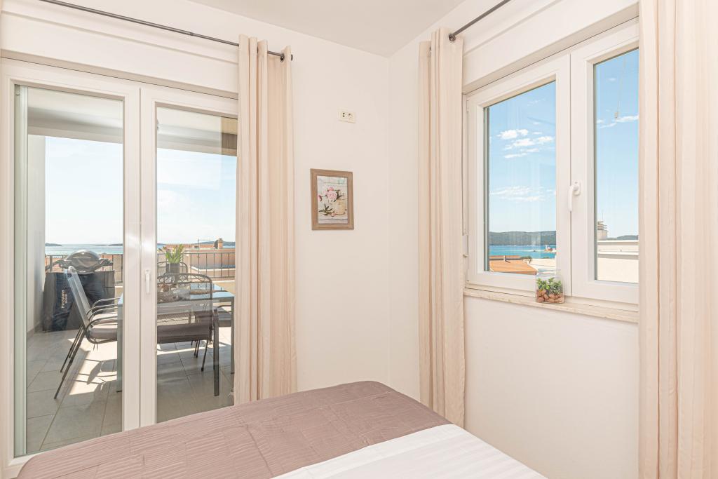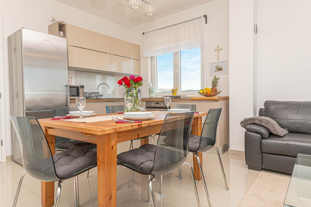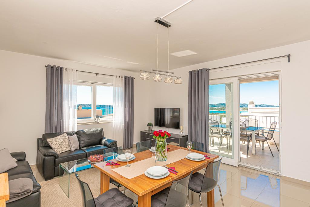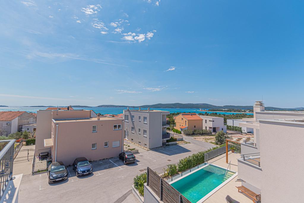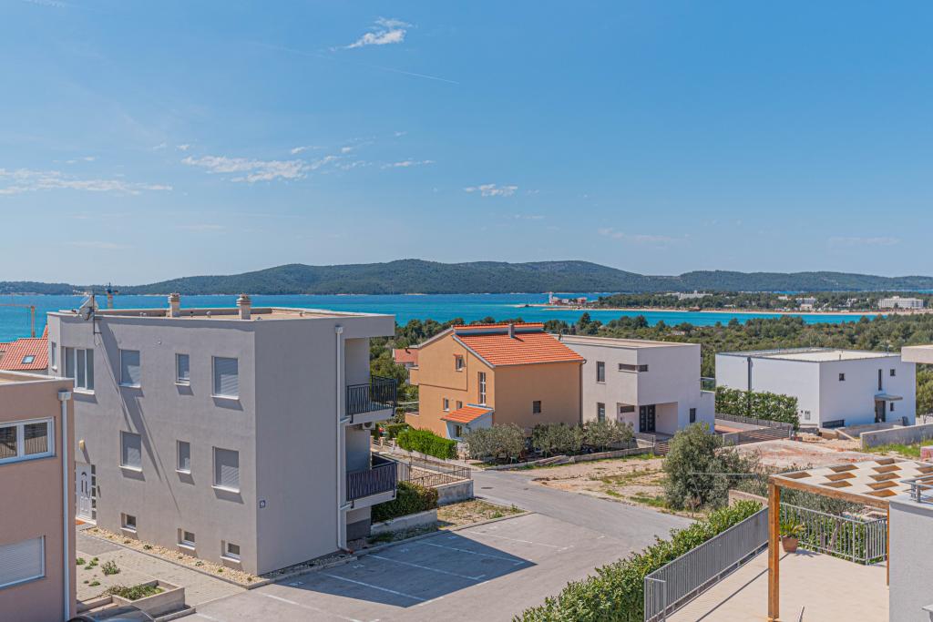This modern accommodation is perfect for an unforgettable family vacation with a wonderful view of the archipelago and a unique sunset. Brand new apartment with terrace and sea view includes 3 bedrooms, living room, flat screen TV, equipped kitchen and 2 bathrooms with shower. Towels and bed linen are included in the apartment. It is located 500m from the beach and 2 km from the Solaris aqua park and 3 km from Šibenik. There are shops, pizzerias and top restaurants nearby. Parking is private and free, as is the WIFI network. The nearest airport is Split Airport, 55 km away. The apartment is fully air-conditioned. A large terrace with a table and chairs for enjoying the evening hours in a very quiet part of Brodarica.