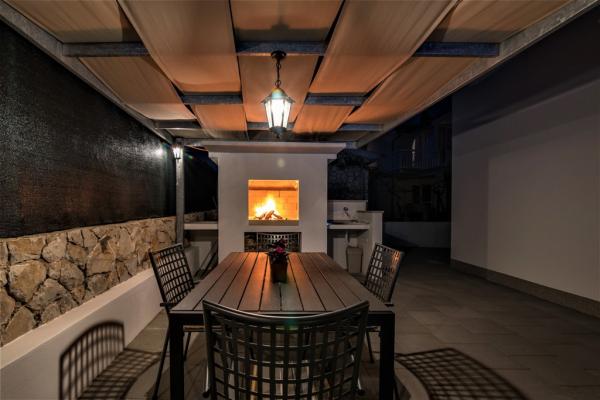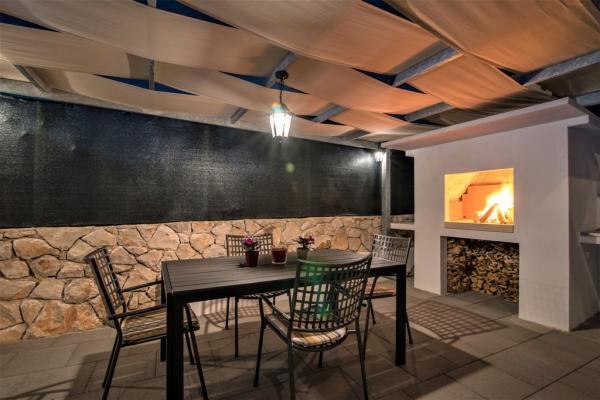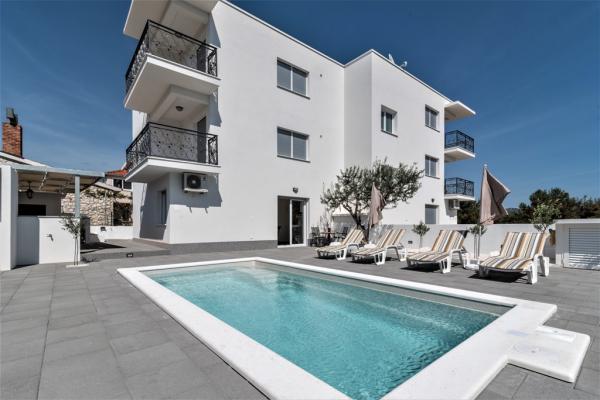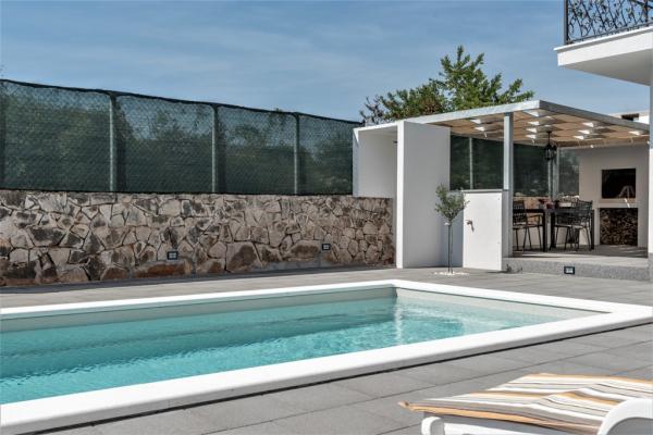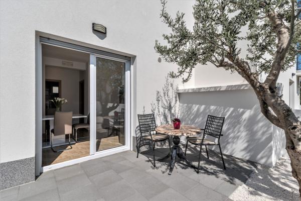 Residential tax is included in price.Apartment is located on the ground floor. Apartment has two bedrooms, living room, kitchen, bathroom and a yard of 220 m2 with private barbecue and private swimming pool and parking.