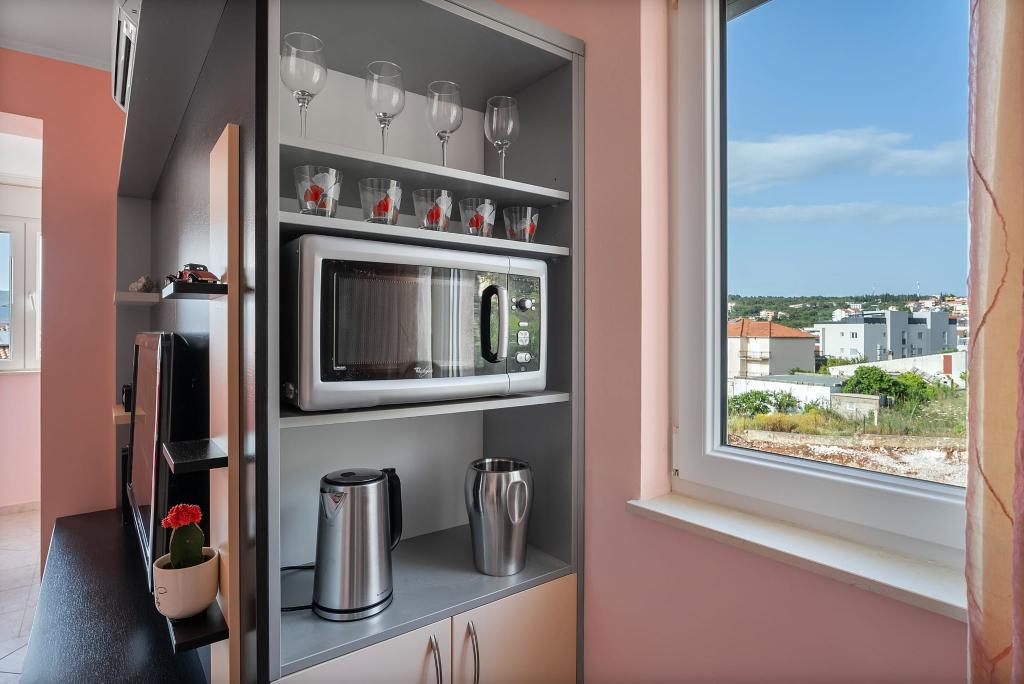 On the nearby beach, you can rent a boat, scooter, pedal boat, sunbeds and umbrellas or go on organized trips to nearby islands. There is also a boat line that goes to Trogir every day every 20 minutes.