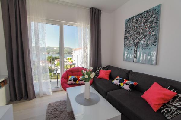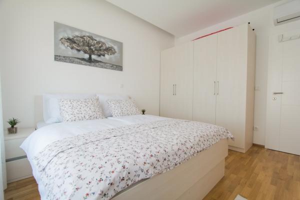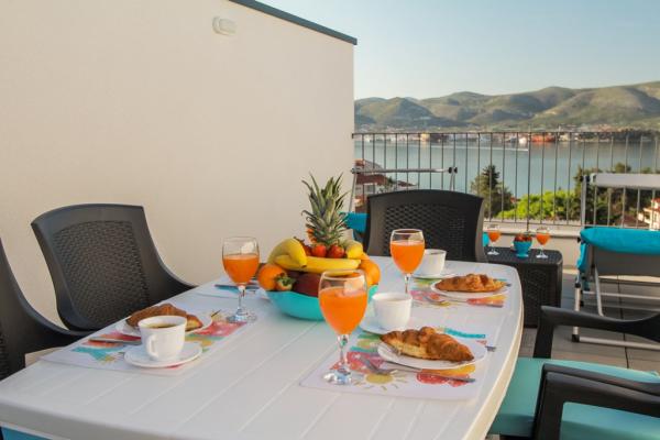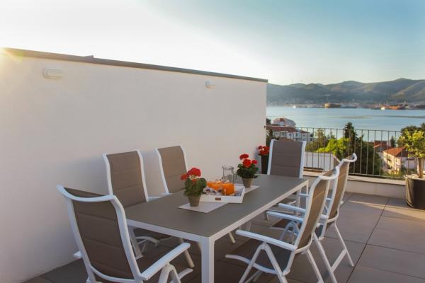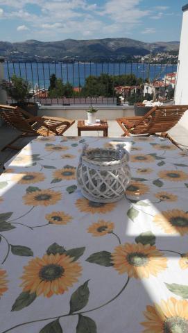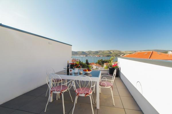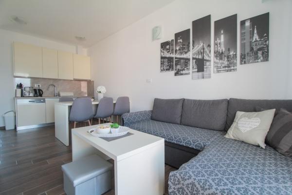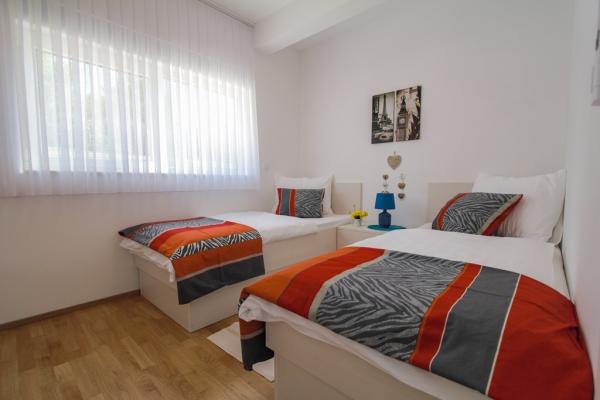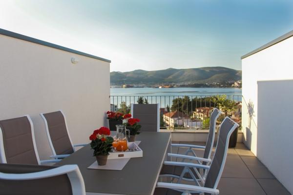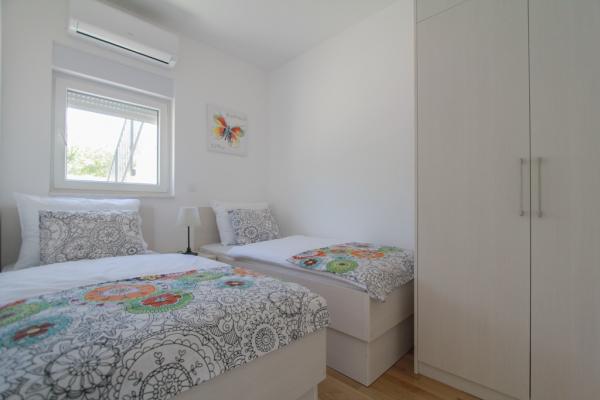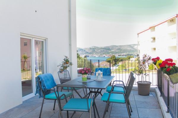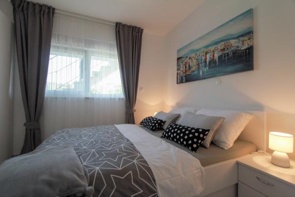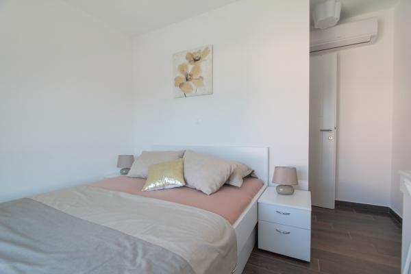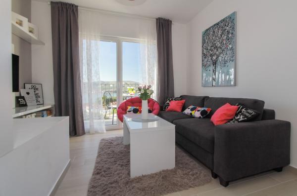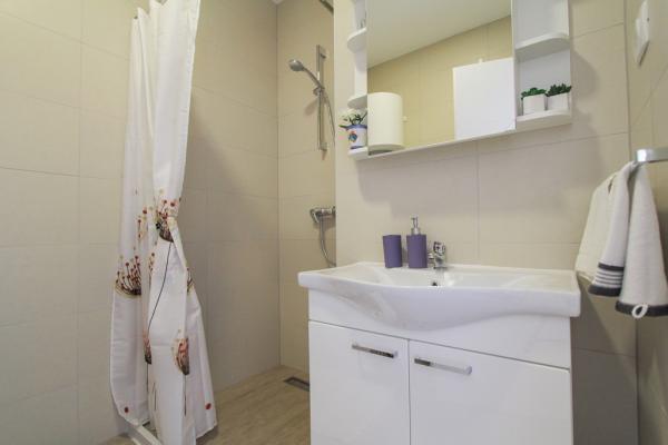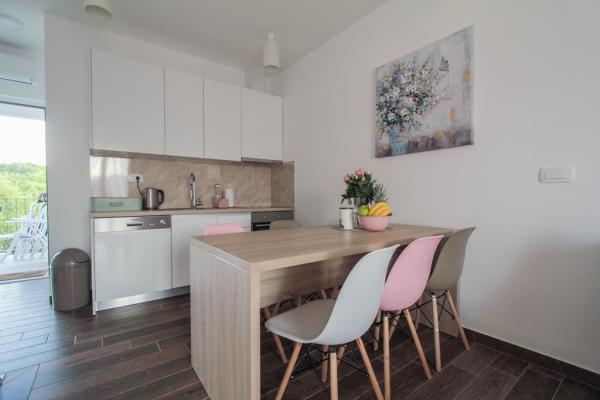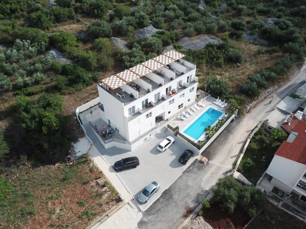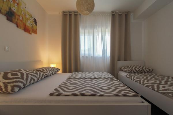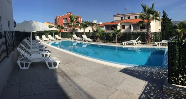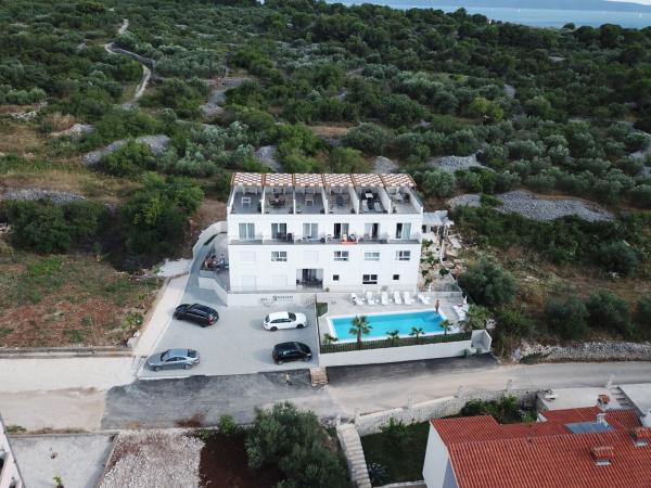 New two-bedroom apartments are located in a quiet part of Okrug Gornji, only 5 minutes walk to the beach in Okruška bay and 10 minutes walk to the beach of Tatinje. . Apartments are modernly furnished, with fully equipped kitchens. The six-floor suites each have their own 25 m2 roof terrace with a beautiful sea view, and there is a barbecue and a seating set. Two apartments on the ground floor also have a terrace with sea view, barbecue and seating furniture. In front of the building is a swimming pool with salt water of 50 m2. In May and October water in the pool will be heated. Beplatan wifi. In the yard of the building is one parking place for each apartment.