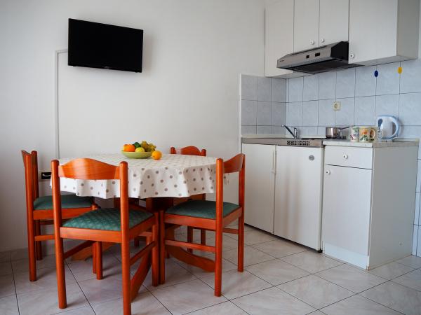 The apartments are located on the south side of Ciovo in Okrug Gornji. They are located about 100 m from the sea, the first line of the road. There are 4 apartments with 4 beds (2 2). Each apartment has a separate entrance and a balcony with a beautiful view of the blue sea and surrounding islands. The apartments consist of one bedroom with two beds (double bed), living room, kitchen and two foldable beds, hall and balcony. Apartments are equipped with air conditioning, satellite / TV and wireless internet connection (Wi-Fi). The kitchen is equipped with 2 electric plates, refrigerator and set of dishes for cooking and serving 6 people. In the courtyard is dominated gentle Mediterranean vegetation with olive trees, and there are also outdoor enclosed shower and stone barbecue with whom he set up a table for eating and socializing. Nearby there are rocky beaches and a large pebble beach in the town center where all ages can enjoy.