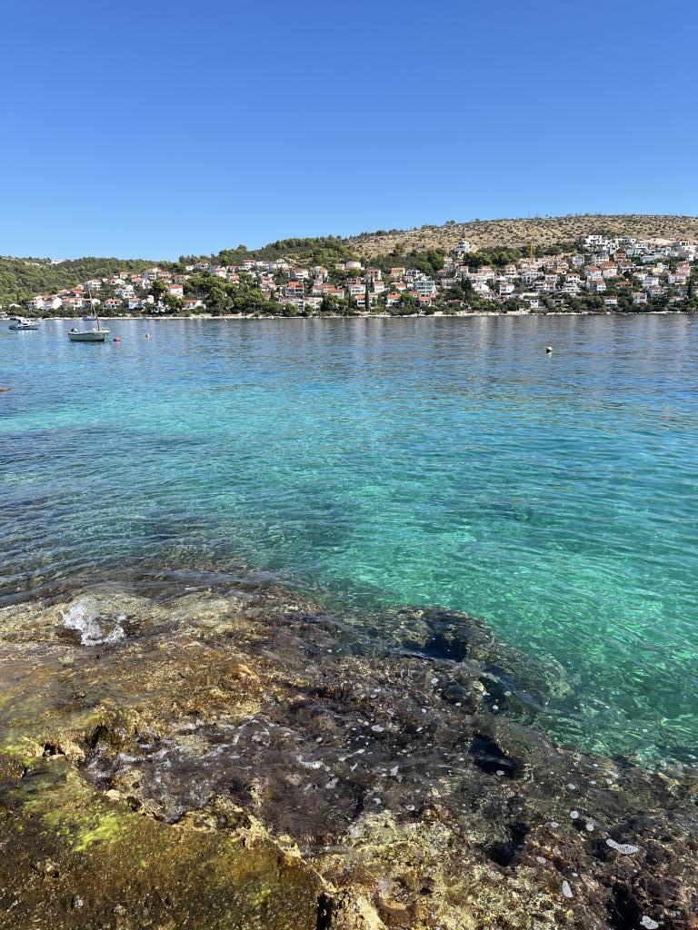 Morning walks along a sea so blue it hurts, breakfast on the balcony with a magical view, modern fresh light with a nice patio by the pool where we had several dinners. Salt baths directly below the house from small saunas/rocks. Nice pebble beach approx. 250 m from the house, perfect for smaller children, small cute grocery store around the corner. No paxa sunbeds or Eurodisco by the pool, just to enjoy. Fantastic host who helps with everything with great patience, the neighbor has a taxi company and drove us wherever we wanted, to/from flights, excursions into Trogir, etc. Highly recommend.