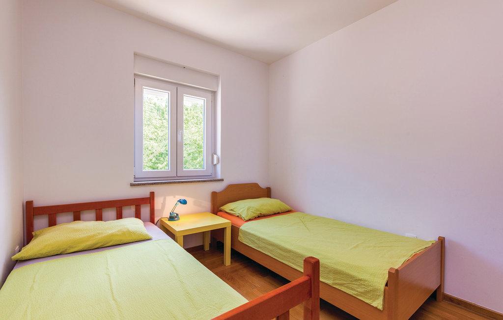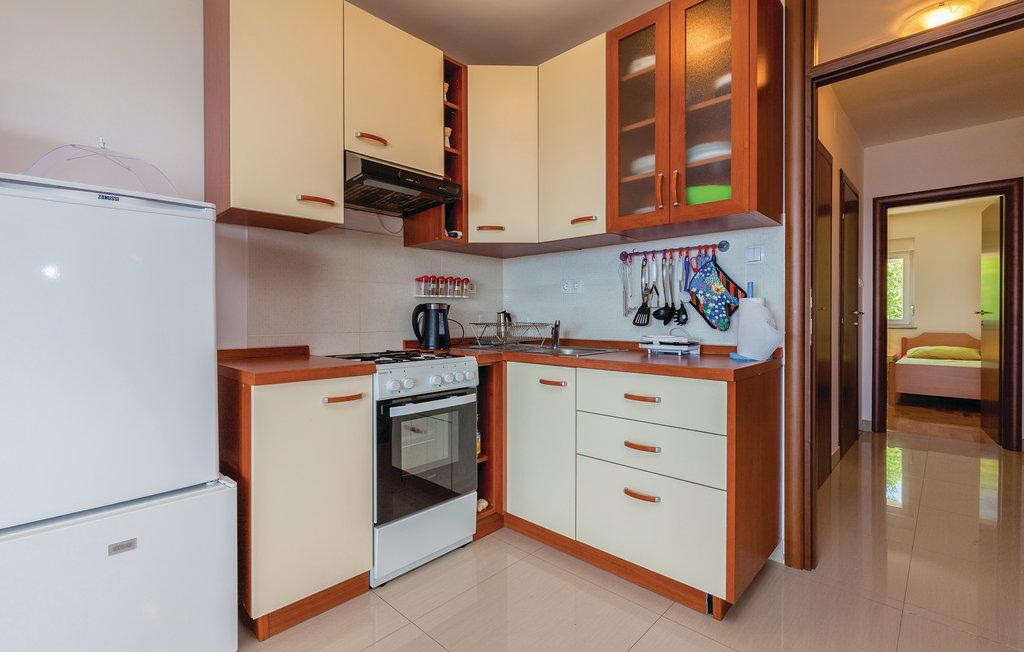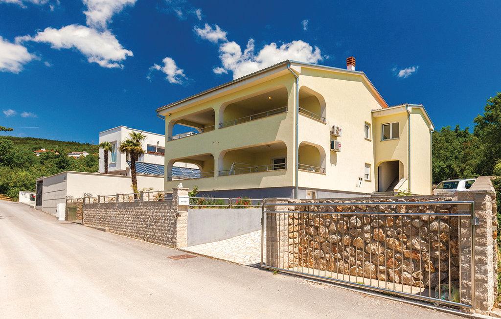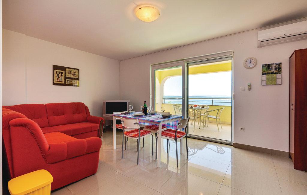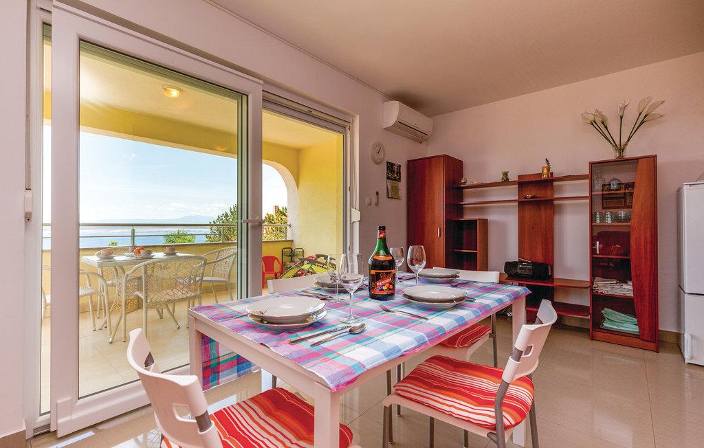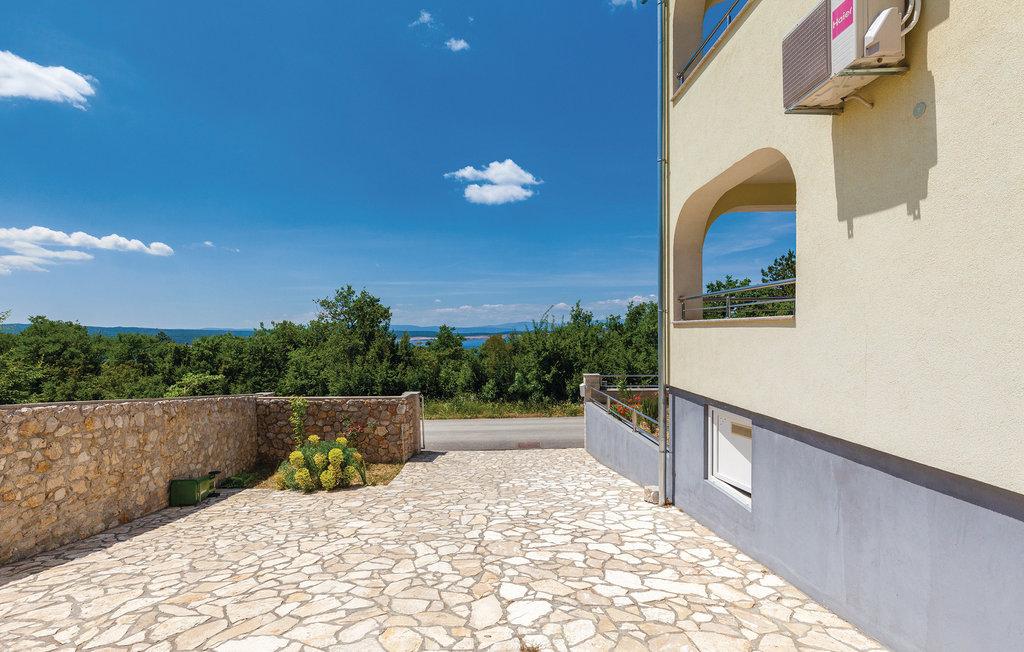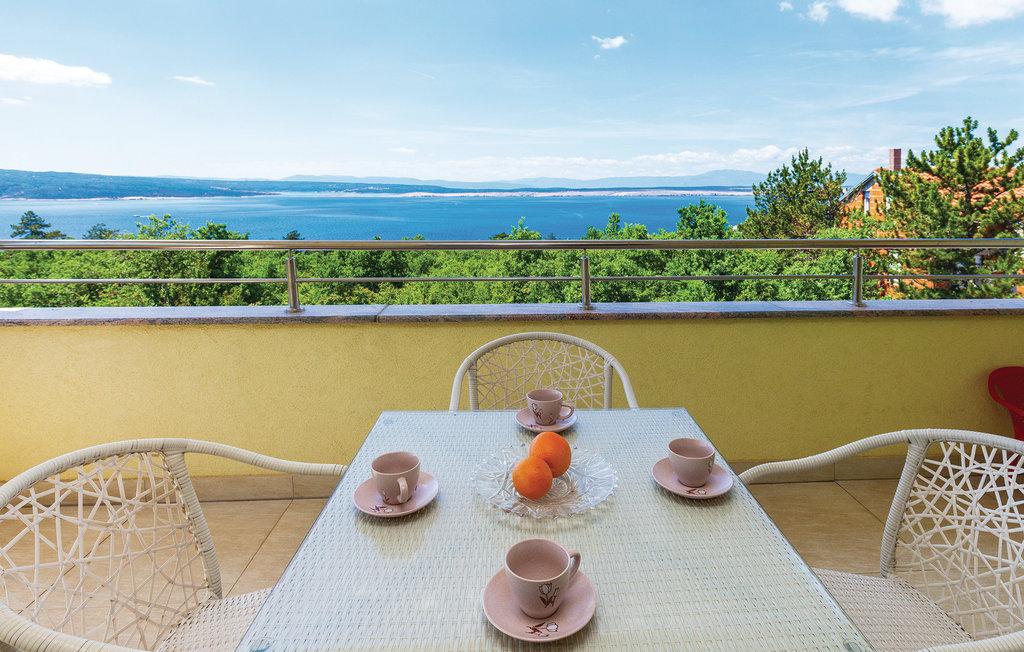 Apartment with a view of the entire Kvarner Bay that extends from a large terrace. The apartment is located on the first floor of a newer building. It consists of an adjoining dining room and living room with three bedrooms, one bedroom with a double bed, a second bedroom with two single beds and a third bedroom with a bunk bed. The shower is separate from the bathroom.