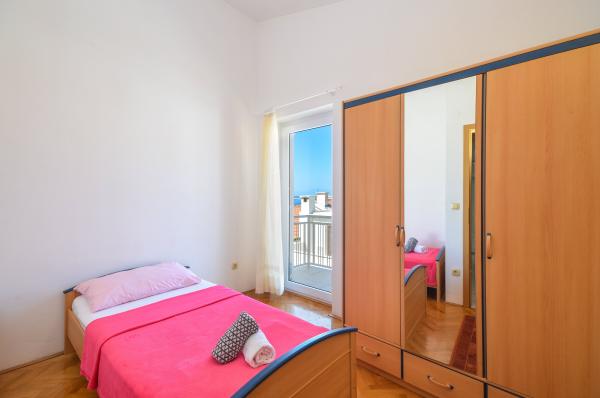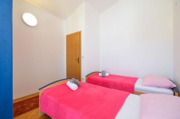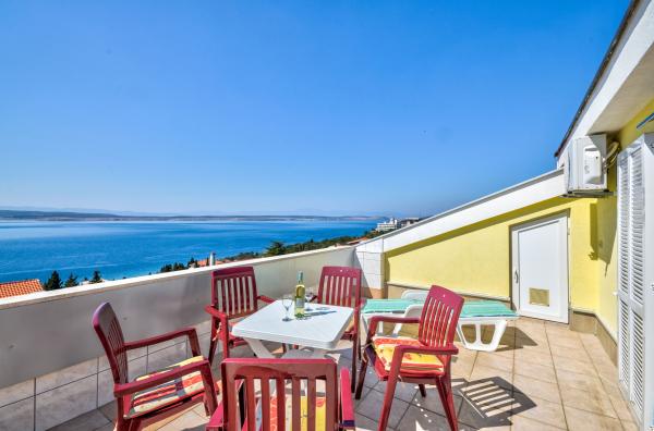 Apartment Tanja is located at the entrance of Crikvenica and is situated on top of a residential building with a large terrace and an excellent panoramic sea view. From the beach is only 350m away, and 650m from the city center. Close proximity is the famous supermarket "Lidl" and the shopping mall "Duga Mall". Restaurants offering quick and savory snacks are right next to the beach. The apartment has two separate bedrooms, one with a double bed and one with two single beds. The bathroom has a large massage bathtub, a washing machine and a washbasin with a toilet. The kitchen is fully equipped with utensils, the fridge has a freezer, and there is a water cooker, oven, electric stove and coffee machine. In the same room there is a dining area and an angular sofa bed for two persons. For breakfast, or for a relaxing dinner with a glass of wine, there is a terrace with a set of 5 people, overlooking the sea. With air conditioning, wi-fi access, TV and secured parking in the garage, the apartment provides a comfortable stay.