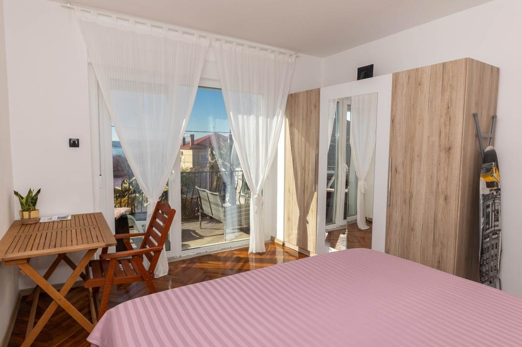 This room is located on the first floor of the house, which is 80 m from the sea as the crow flies, and has a wonderful view both from the terrace and from the bed, so that as soon as you wake up in the morning, say hello to the sea. The size of the bed is 180x200, and there is the possibility of renting the adjacent room with a bed of 140x200, so that three adults can enjoy the comfort in the wonderful location of the black jetty and the sandy beach of the same name, which is a 5-minute easy walk away. The room has a small fridge and a kettle. Our guests have a discount for renting reed-covered plots next to the maritime property, i.e. a beautiful natural naturist beach, which is 5 km to the south, and many of our tourists cycle 4.5 km and then another 500 m along the hiking trail to the beach mentioned above. For many, this one-day trip is the most beautiful part of the year, and it is also possible to organize a boat ride. Call, ask, at least it doesn't cost anything.
