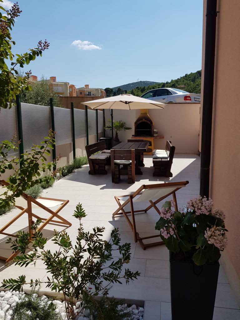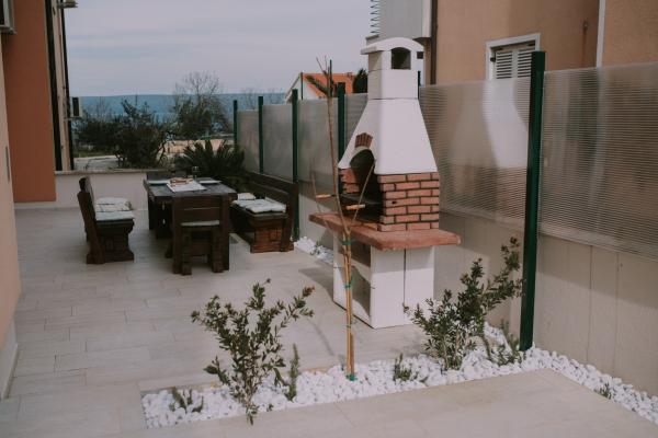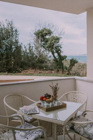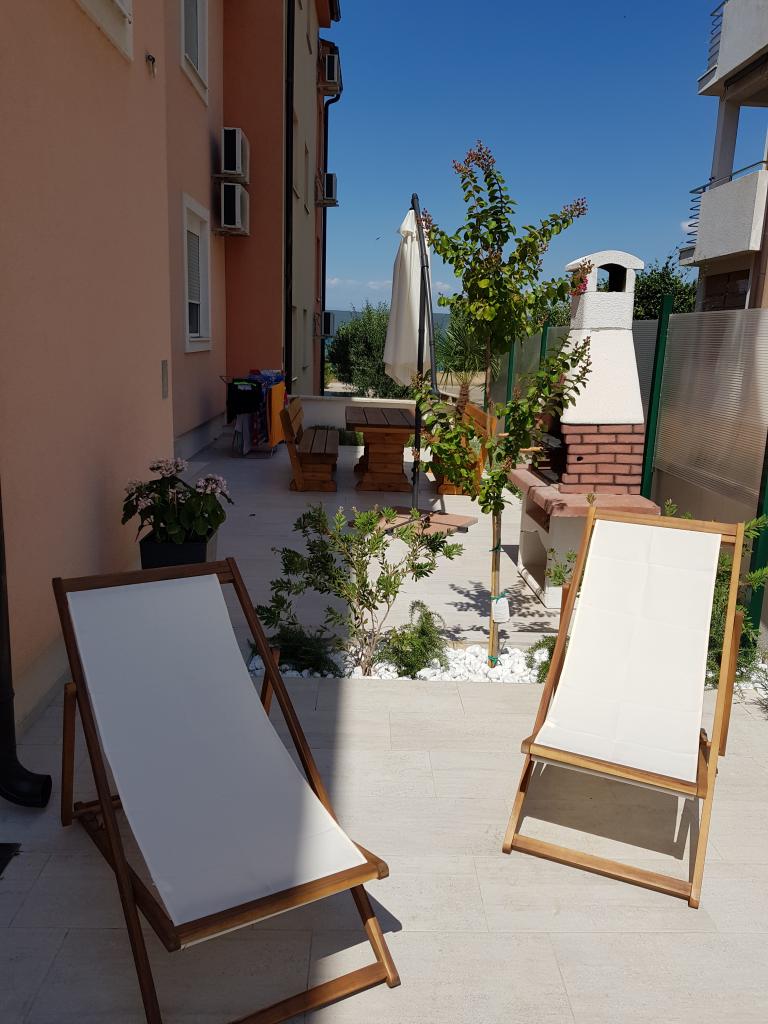 New modernly equipped apartment, minute walk to the beach, ground floor with balcony and large terrace with a view. Ideal for younger children and families looking for peace and quiet with twigs of cricket and sum of waves!