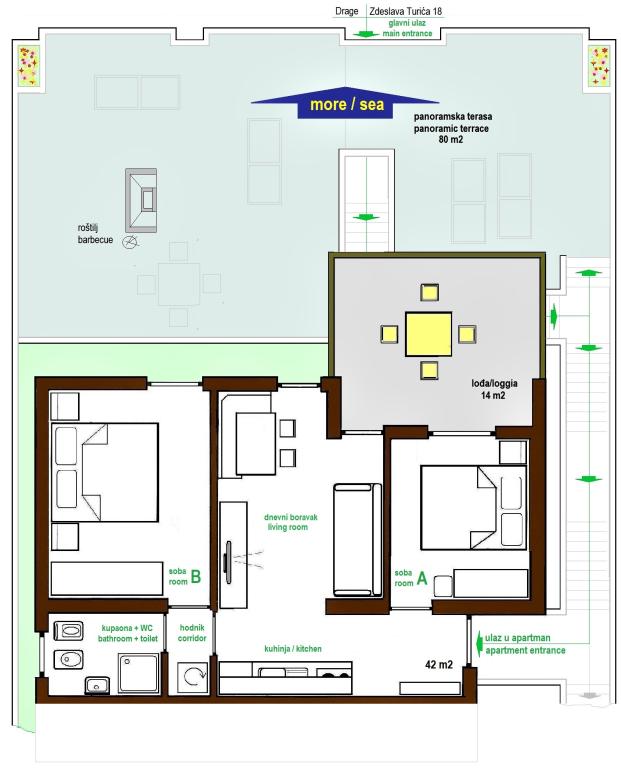 Read more Accommodation unitsWhen reserving an apartment, the Guest pays the agreed amount of advance payment of the total rental price of the apartment, and the Host, upon receipt of the advance payment, delivers a written confirmation of the reservation (voucher) to the Guest. The Guest's check-in time is from 2:00 p.m. and check-out time is until 10:00 a.m. The Guest pays the remaining part of the total rental amount to the Host upon entering the apartment. The stated price of the apartment rental includes a stay of up to 4 people, and the surcharge for the stay of a 5th person is 20 EUR/night. Tourist tax is included in the price of the night. Use of the parking space, panoramic terrace and barbecue are included in the price of the night. Consumption of electricity and water are included in the price of the night. Use of air conditioning and internet services are included in the price of the night. Final cleaning of the apartment is included in the price of the night.
