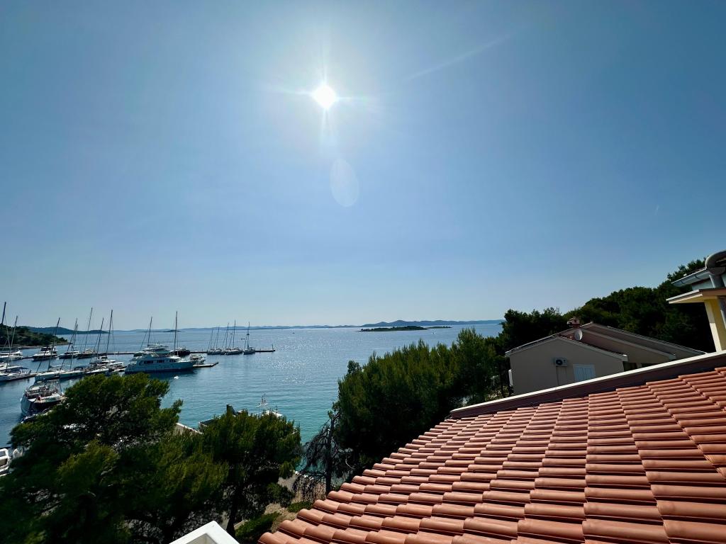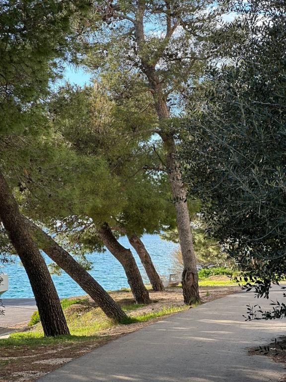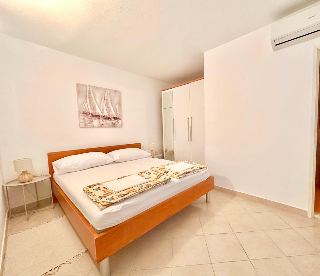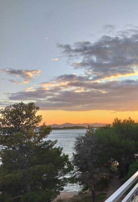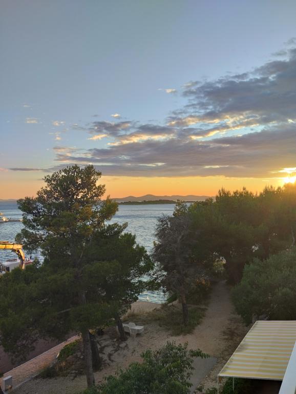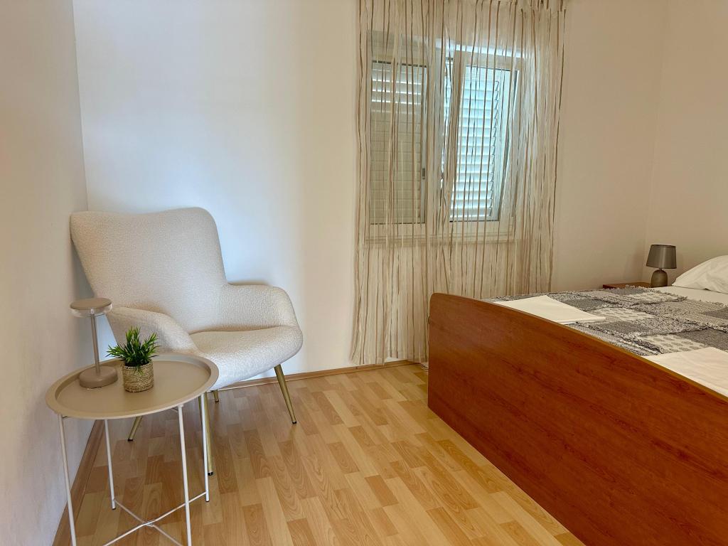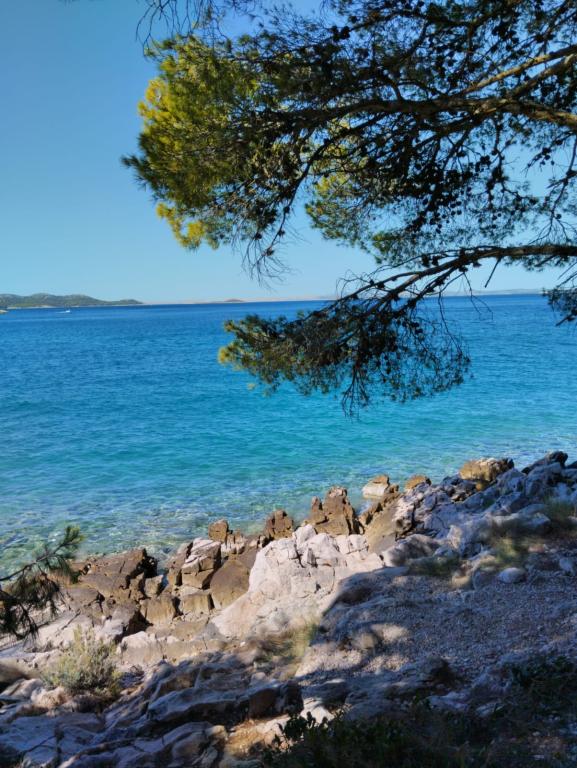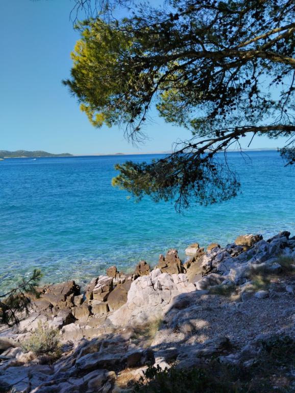 Peace and privacy – accommodation for adults only (max 2). Our accommodation is not suitable for children – both because of the wild beach nearby and because of the equipment of the apartment. Please send all inquiries exclusively via the contact form. The price list is up-to-date and correct. Apartments "Mustel" are located in Drage, 10 km from Biograd n/m, in the first row to the sea, next to the new Marina Drage. The nearest beach is natural, located in a pine forest (see pictures) and is just a few steps away from the accommodation, in the direction of Pakoštane. A promenade through the forest connects our facility with Pakoštane, providing peace and privacy in the shade of pine trees. Drage also offers other beaches, and the first public pebble beach (Plaža Porat) is located 800 m away, with a large parking lot, restaurant and bar. All apartments are equipped with a separate bedroom, kitchen, living room, bathroom, balcony/terrace, air conditioning, WiFi, bed linen and towels. Each apartment has one parking space