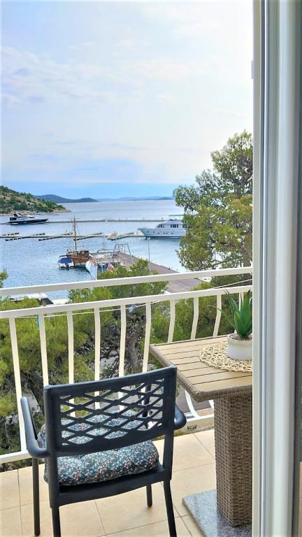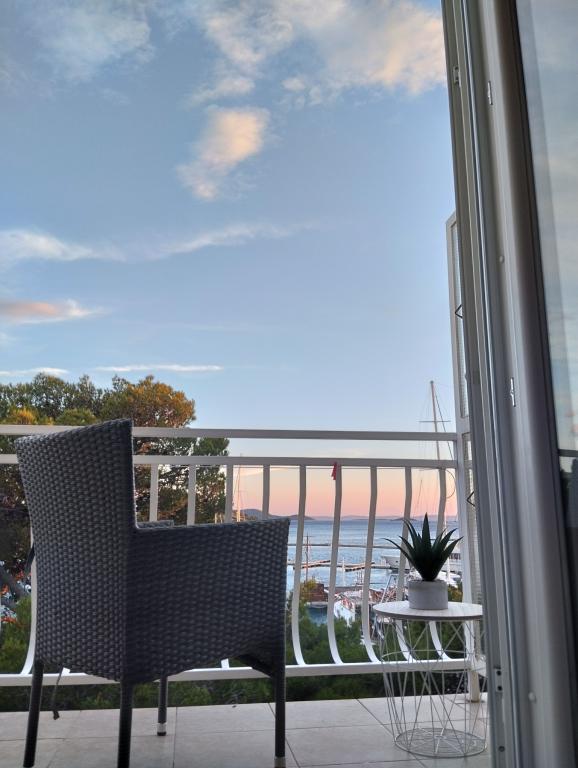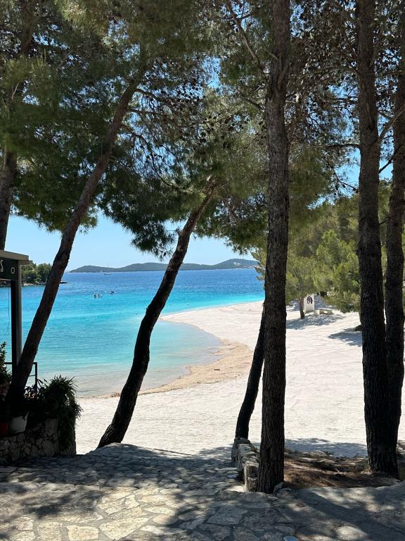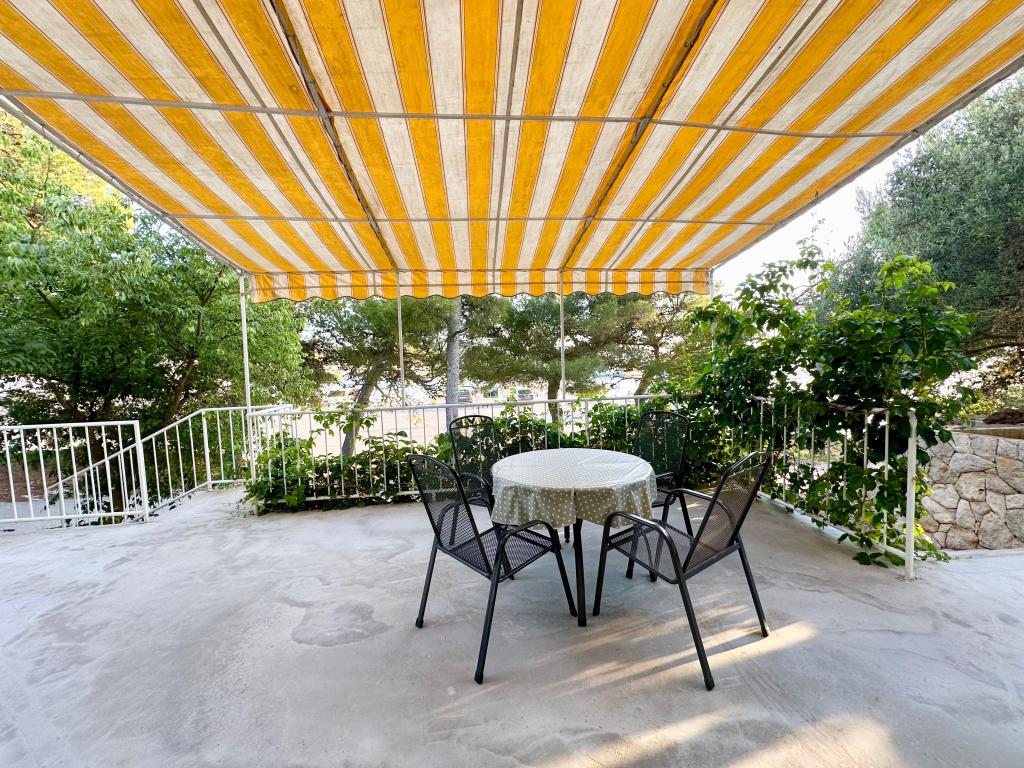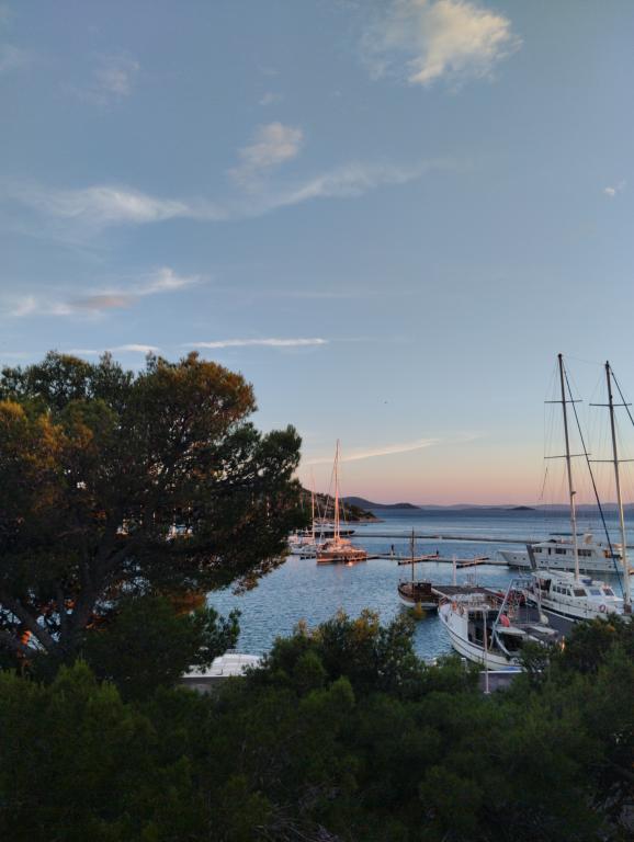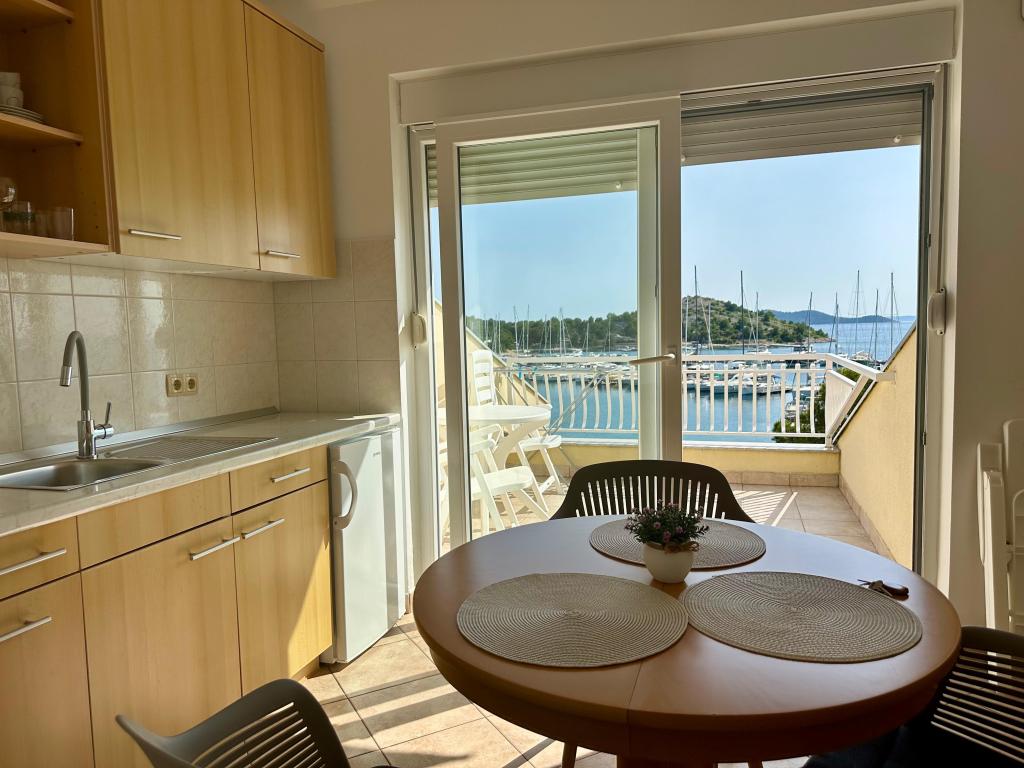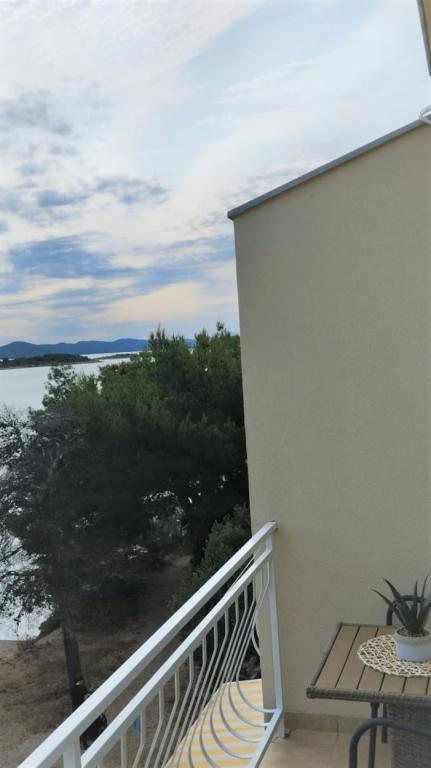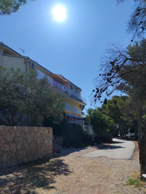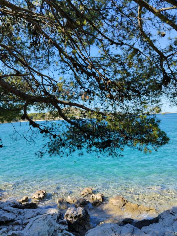 Peace and privacy – accommodation for adults only (max 2). Our accommodation is not suitable for children – both because of the wild beach nearby and because of the equipment of the apartment. Please send all inquiries exclusively via the contact form. The price list is up-to-date and correct. Apartments "Mustel" are located in Drage, 10 km from Biograd n/m, in the first row to the sea, next to the new Marina Drage. The nearest beach is natural, located in a pine forest (see pictures) and is just a few steps away from the accommodation, in the direction of Pakoštane. A promenade through the forest connects our facility with Pakoštane, providing peace and privacy in the shade of pine trees. Drage also offers other beaches, and the first public pebble beach (Plaža Porat) is located 800 m away, with a large parking lot, restaurant and bar. All apartments are equipped with a separate bedroom, kitchen, living room, bathroom, balcony/terrace, air conditioning, WiFi, bed linen and towels. Each apartment has one parking space