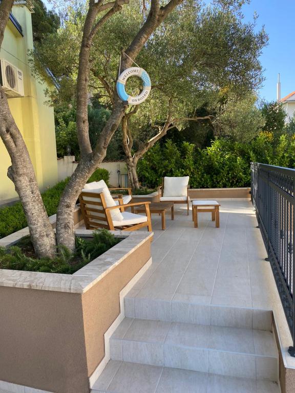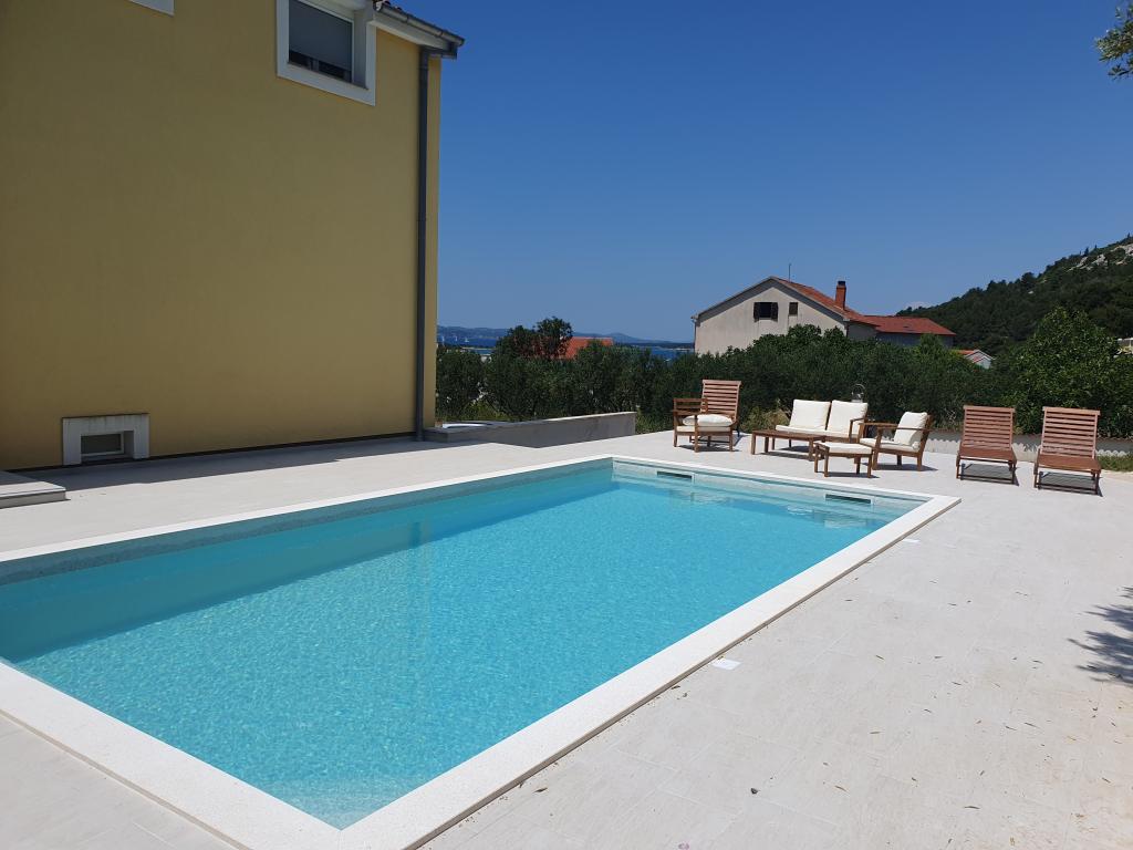 New, fully equipped apartments with sea view, swimming pool, SAT TV, air conditioning, kitchen, toilet shower, 2-3 minute walk to the sea. The property is located in a beautiful olive grove that extends over about 2500 m2, with lots of flowers and greenery. Newly built 32m2 swimming pool with 200m2 swimming area and sea view. Grill available for shared use. Apartment number 1 consists of: 3 rooms (of which 2 bedrooms), 55 m2, 4+2 persons. Entrance on the ground floor, via the terrace into the living room. Ground floor: bedroom 1 with double bed, living room with kitchen and seating area, bedroom 2 with double bed and sofa bed, toilet/shower, terrace. Apartments 2 and 3 consist of 2 rooms of which 1 bedroom, living room with kitchen and seating area, toilet/shower, balcony. Relax House consists of 3 rooms, including 2 bedrooms, in the living room there is a kitchen and a sofa bed, toilet/shower, terrace. Holiday house consists of 3 rooms, including 2 bedrooms, living room and toilet/shower, terrace.