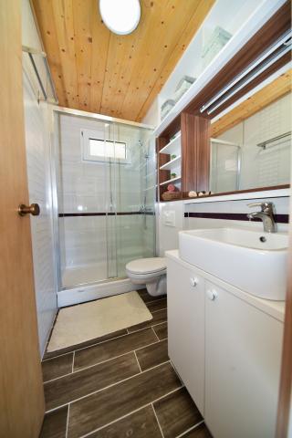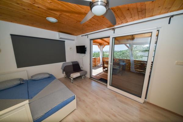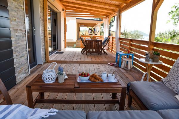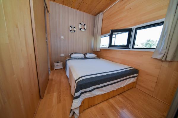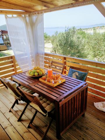 New, modernly equipped mobile home in a quiet family camp near Pakostane. The house is intended for up to 5 persons, ideal for families with children, since there is a children's playground in the immediate vicinity and a peaceful pebble beach is only 50 meters away. The house has 1 bedroom, a bathroom with a shower and a spacious living room with a kitchen. The kitchen is equipped with a gas cooker, napkin, fridge with freezer, and accessories and dishes for preparing food and serving meals and drinks. The living room is equipped with LED TV and air conditioning, comfortable sofa and armchair that are converted into spacious beds for 3 people. The living room is separated by a glass wall from the spacious, fully-roofed terrace. The terrace offers a view of the sea and the sunset, and is equipped with a table for 6, and a comfortable lounge set. Towels and bed linen are available. The parking space is by the house and is free of charge. There is free WiFi in the campsite.