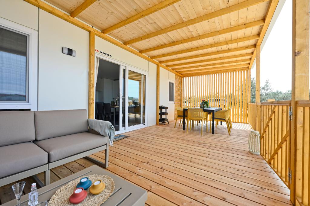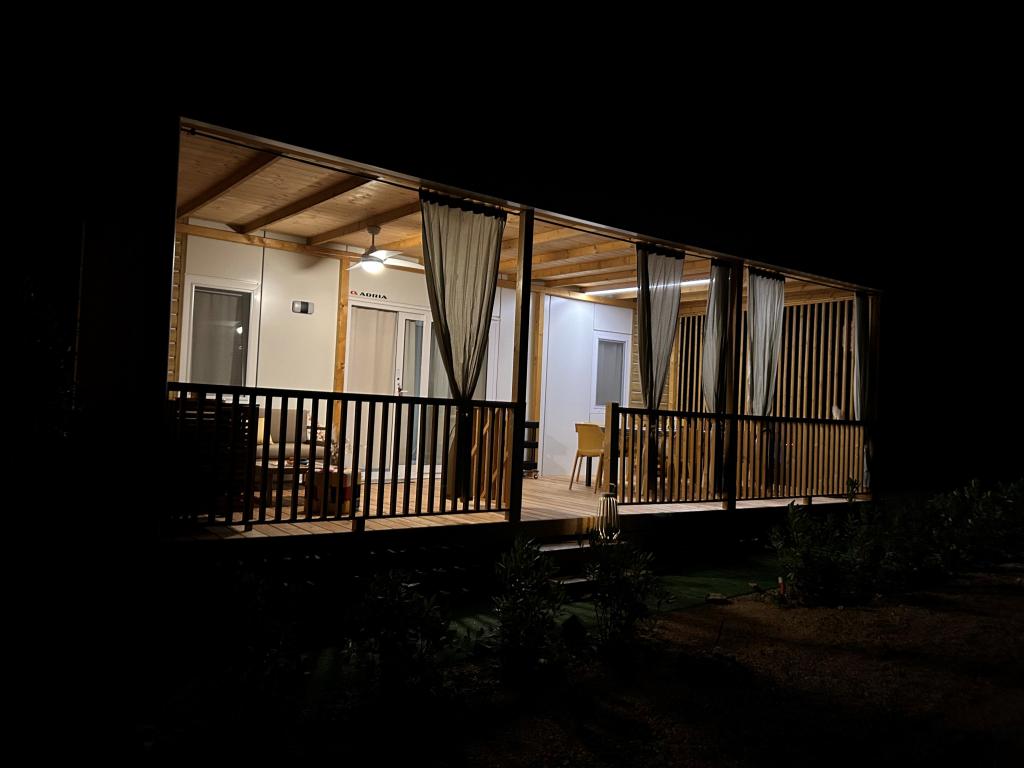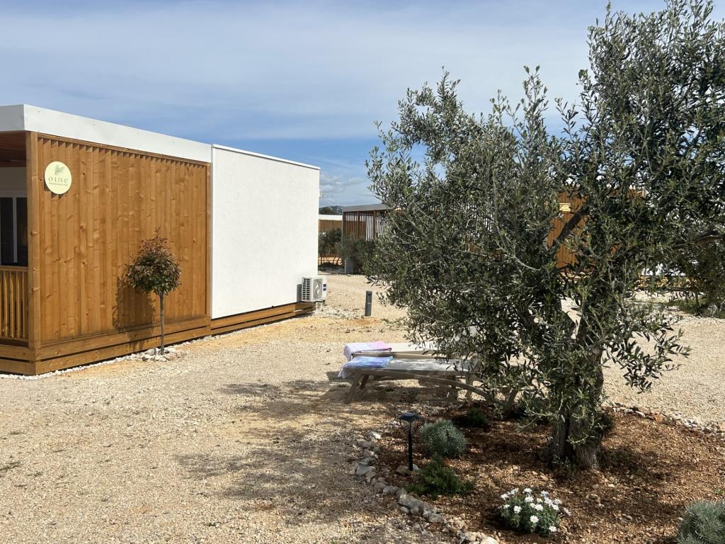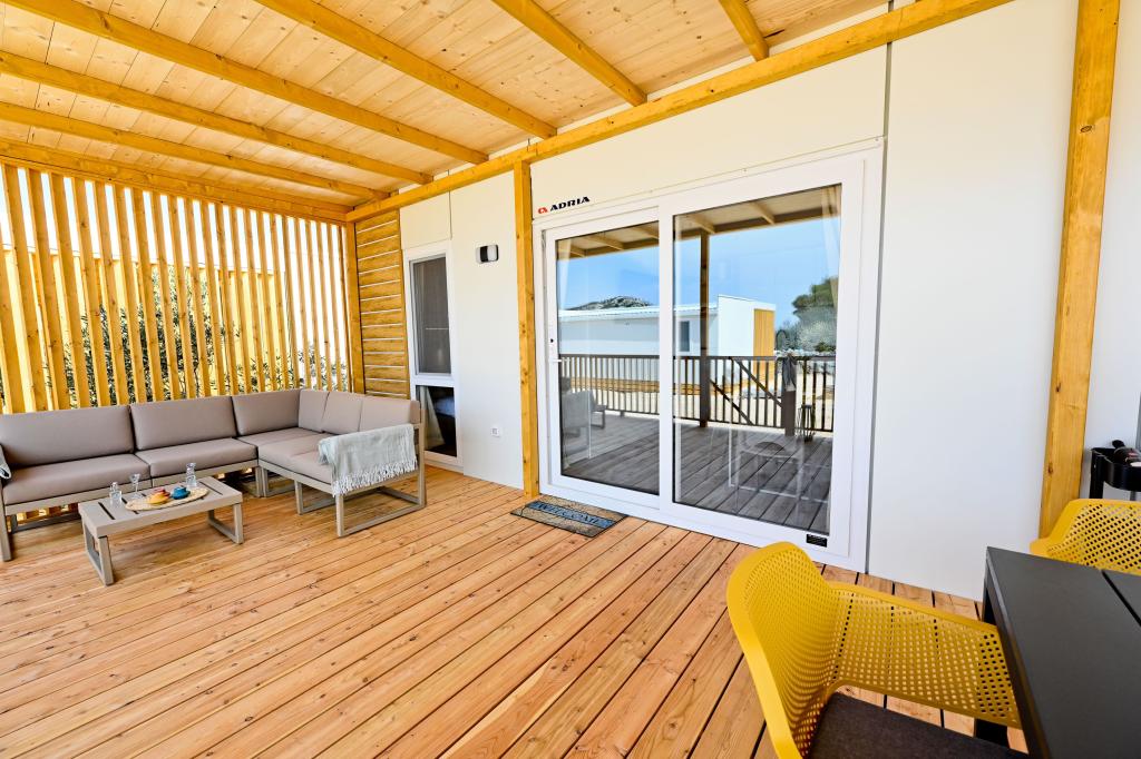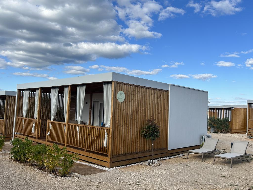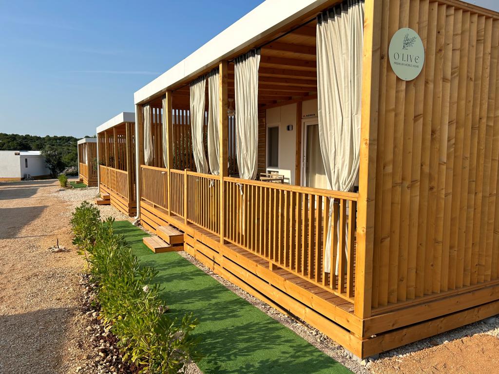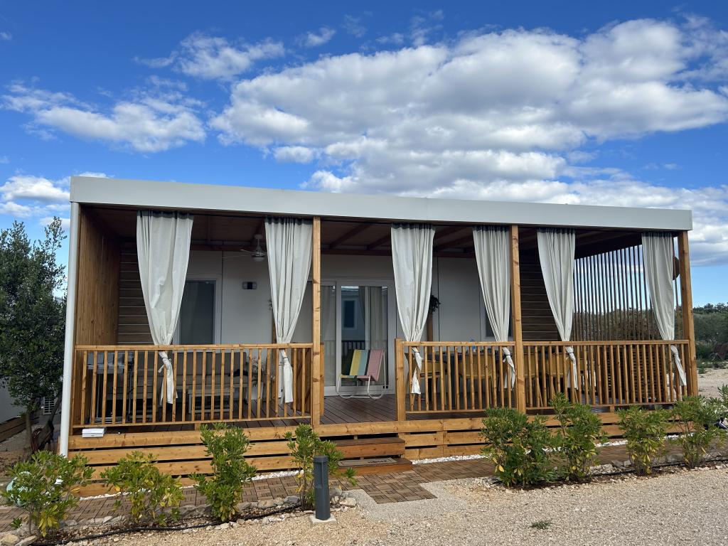 O'LIVE Premium Mobile Home, a new mobile home from spring 2023, ideal for a vacation in the peaceful oasis of Lučica, with an unforgettable view of the Kornati islands. Come for a vacation for body and soul! The house is fully equipped and has a modern design, the size of 63 m2 with an outdoor covered terrace. The house contains a richly equipped kitchen with a dining area, one bedroom with a double bed 160x200 with a bathroom, one bedroom with two beds 90x200, an additional bathroom (both bathrooms are fully equipped - toilet, shower, towels, hair dryer) and a part next to the dining room. in which there is a sofa bed with dimensions for sleeping (possibility of a bed for two additional people). The covered terrace contains furniture for relaxing and a dining table. Next to the house there is a solar shower, gas grill, lounge chairs and a parking space. The final cleaning fee is included in the price of the night. Registration and residence tax is done directly in the camp at the reception, where the key to the cottage is collected.