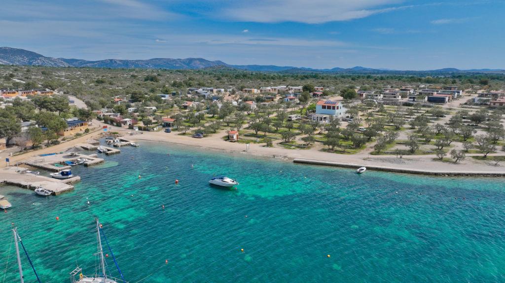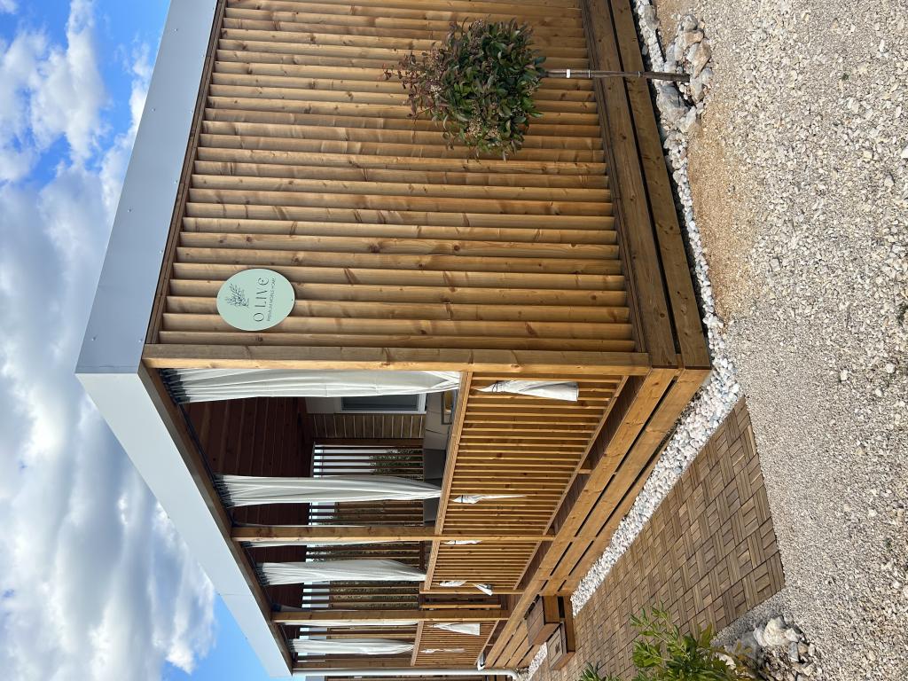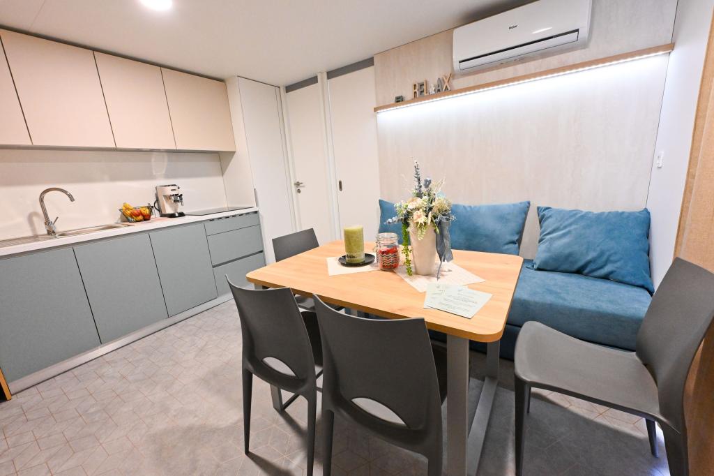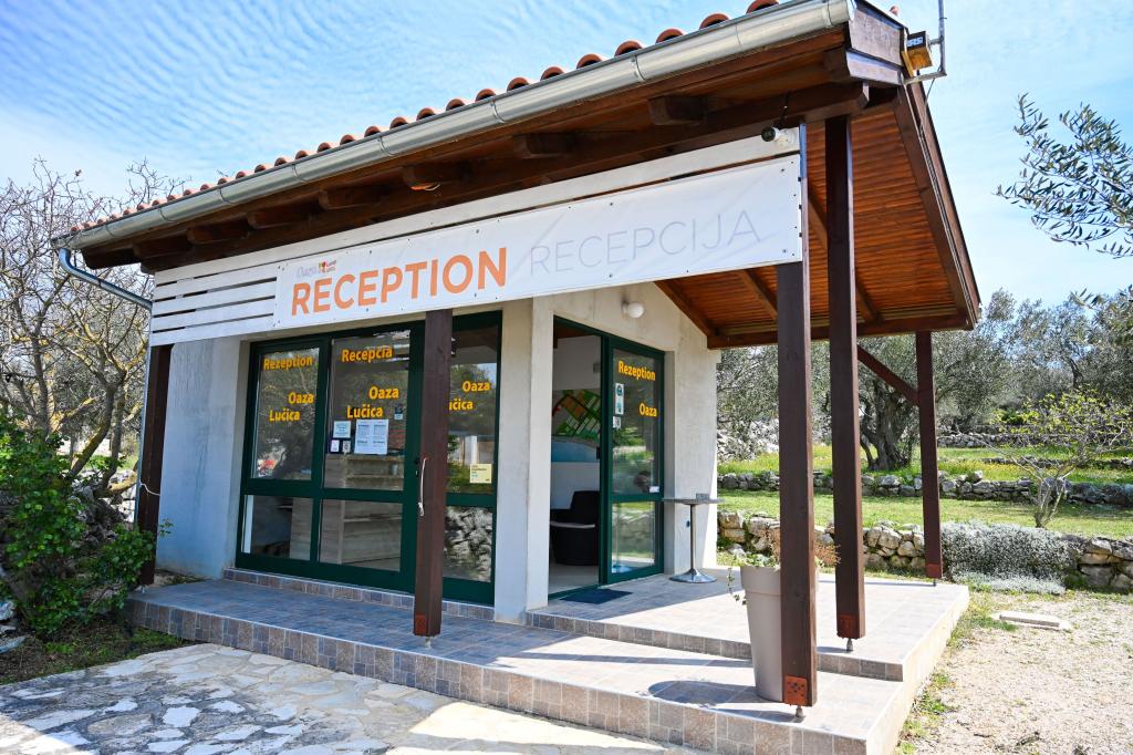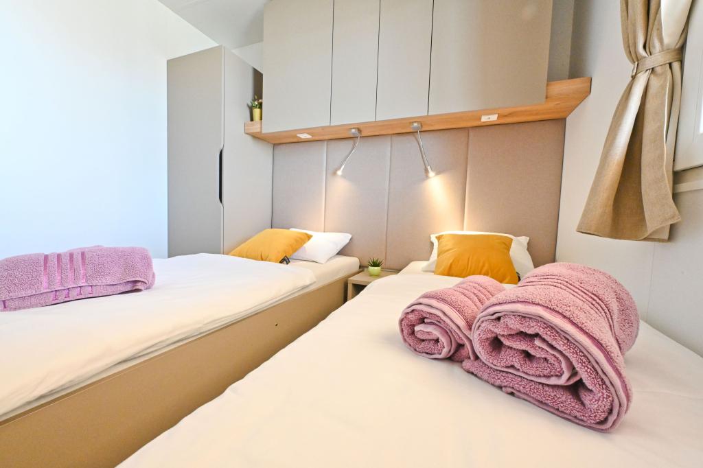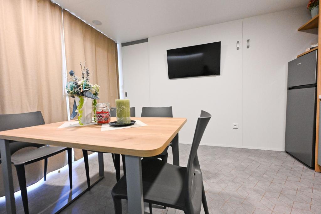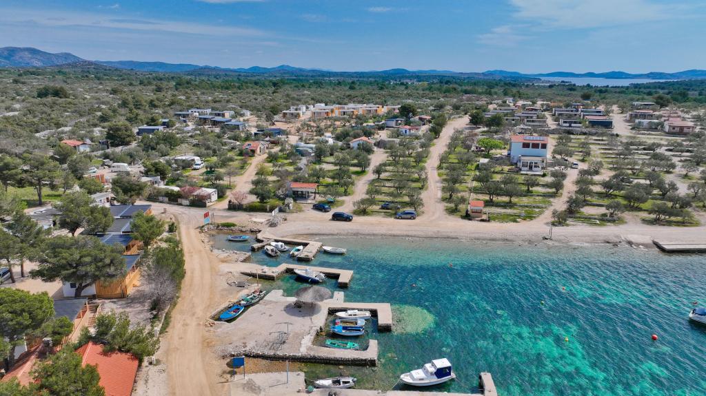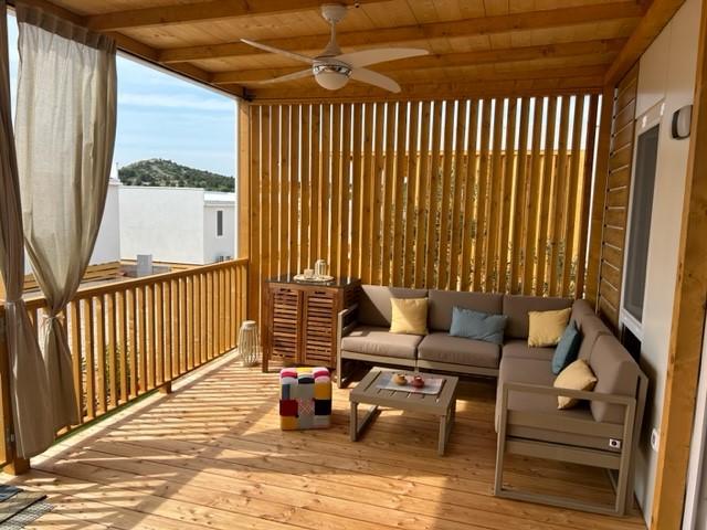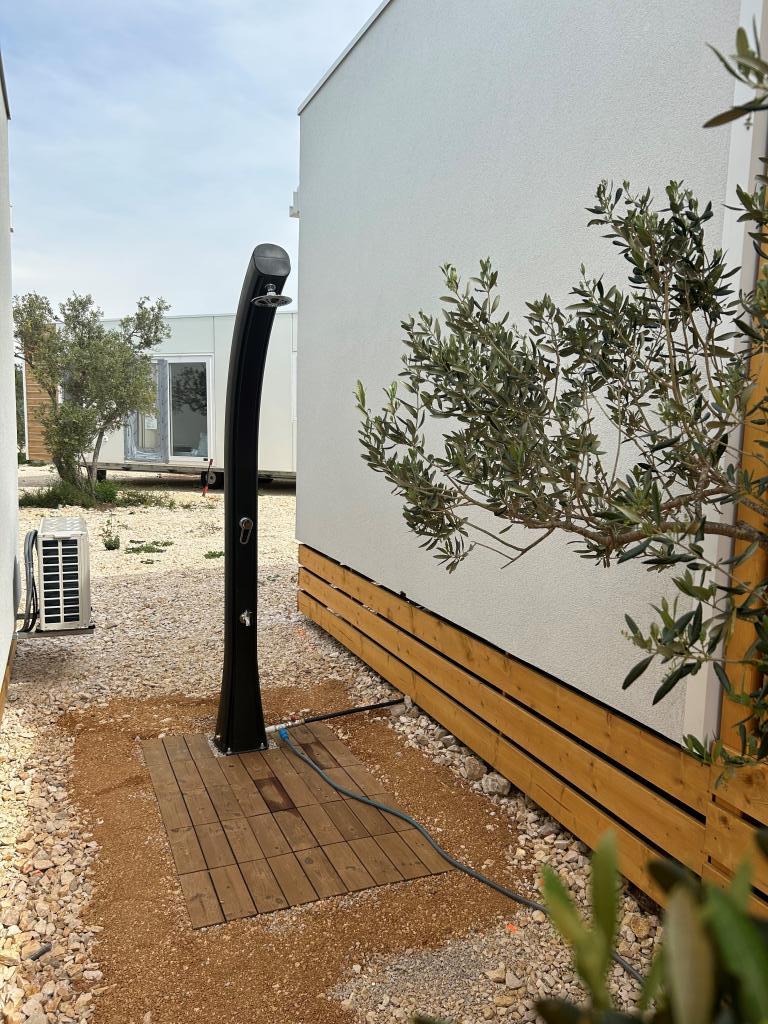 O'LIVE Premium Mobile Home, a new mobile home from spring 2023, ideal for a vacation in the peaceful oasis of Lučica, with an unforgettable view of the Kornati islands. Come for a vacation for body and soul! The house is fully equipped and has a modern design, the size of 63 m2 with an outdoor covered terrace. The house contains a richly equipped kitchen with a dining area, one bedroom with a double bed 160x200 with a bathroom, one bedroom with two beds 90x200, an additional bathroom (both bathrooms are fully equipped - toilet, shower, towels, hair dryer) and a part next to the dining room. in which there is a sofa bed with dimensions for sleeping (possibility of a bed for two additional people). The covered terrace contains furniture for relaxing and a dining table. Next to the house there is a solar shower, gas grill, lounge chairs and a parking space. The final cleaning fee is included in the price of the night. Registration and residence tax is done directly in the camp at the reception, where the key to the cottage is collected.