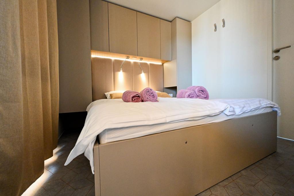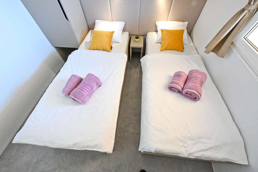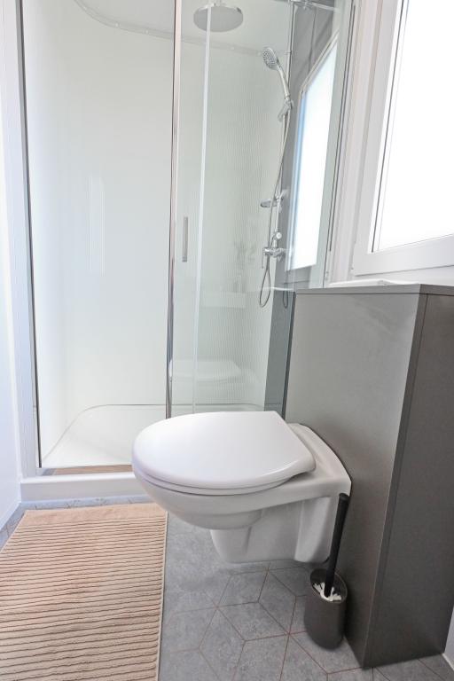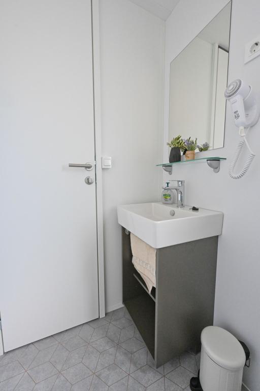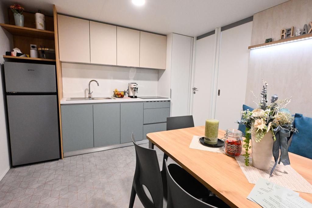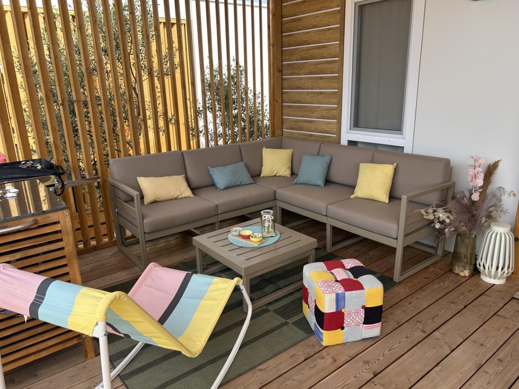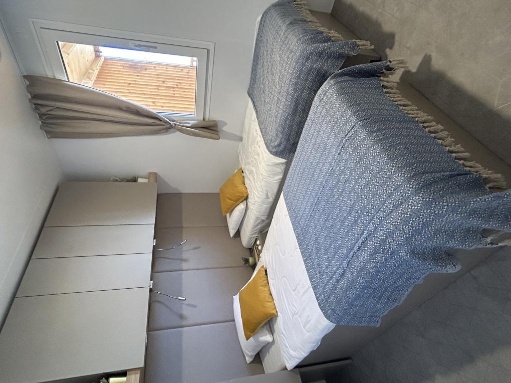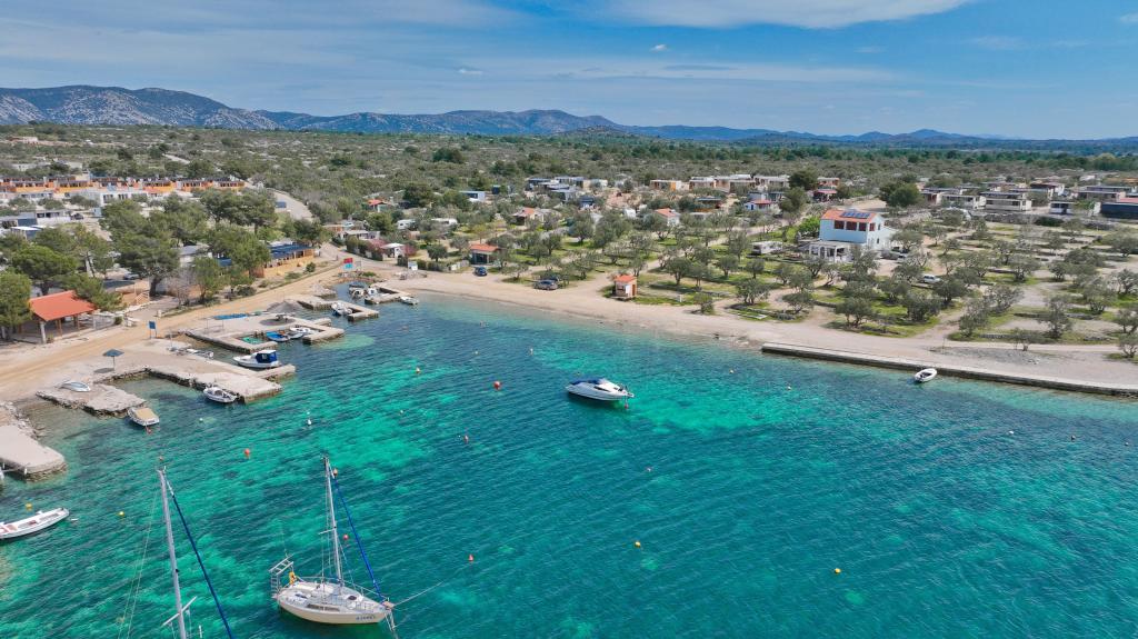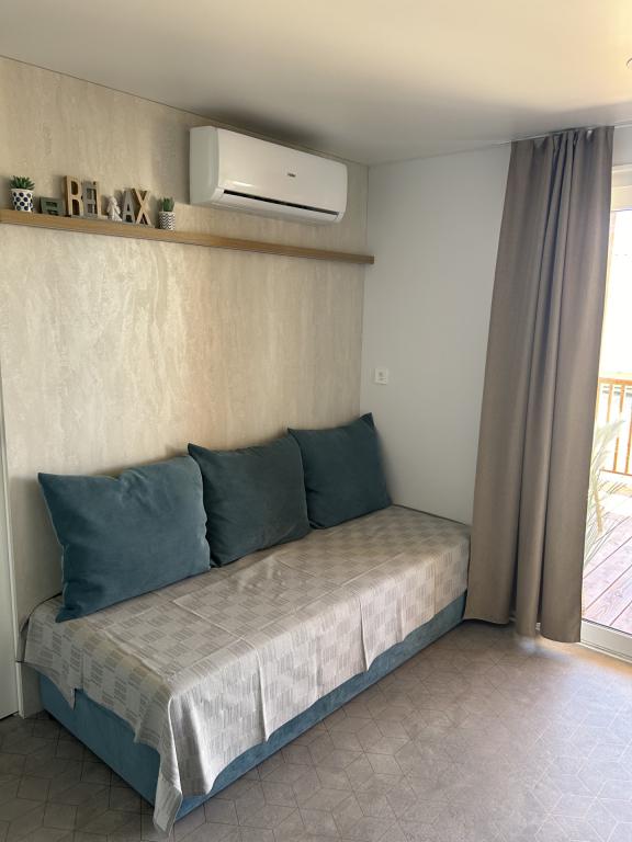 O'LIVE Premium Mobile Home, a new mobile home from spring 2023, ideal for a vacation in the peaceful oasis of Lučica, with an unforgettable view of the Kornati islands. Come for a vacation for body and soul! The house is fully equipped and has a modern design, the size of 63 m2 with an outdoor covered terrace. The house contains a richly equipped kitchen with a dining area, one bedroom with a double bed 160x200 with a bathroom, one bedroom with two beds 90x200, an additional bathroom (both bathrooms are fully equipped - toilet, shower, towels, hair dryer) and a part next to the dining room. in which there is a sofa bed with dimensions for sleeping (possibility of a bed for two additional people). The covered terrace contains furniture for relaxing and a dining table. Next to the house there is a solar shower, gas grill, lounge chairs and a parking space. The final cleaning fee is included in the price of the night. Registration and residence tax is done directly in the camp at the reception, where the key to the cottage is collected.