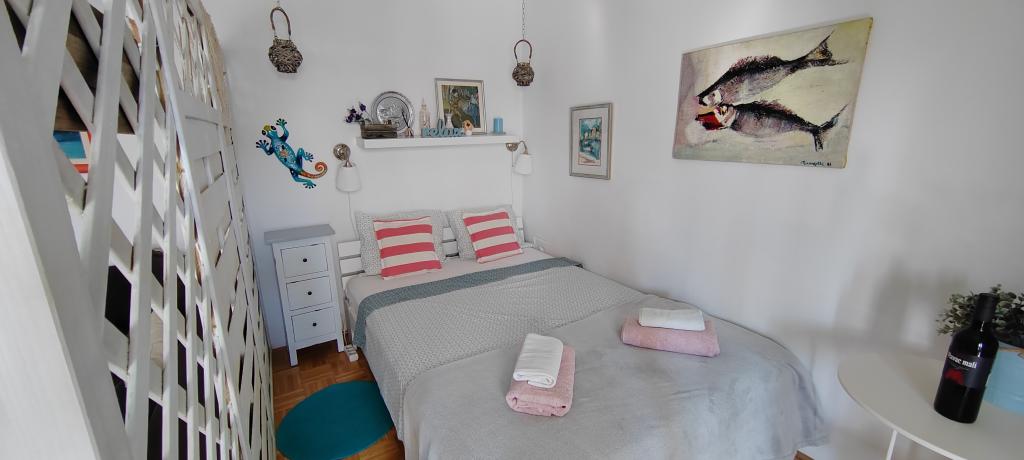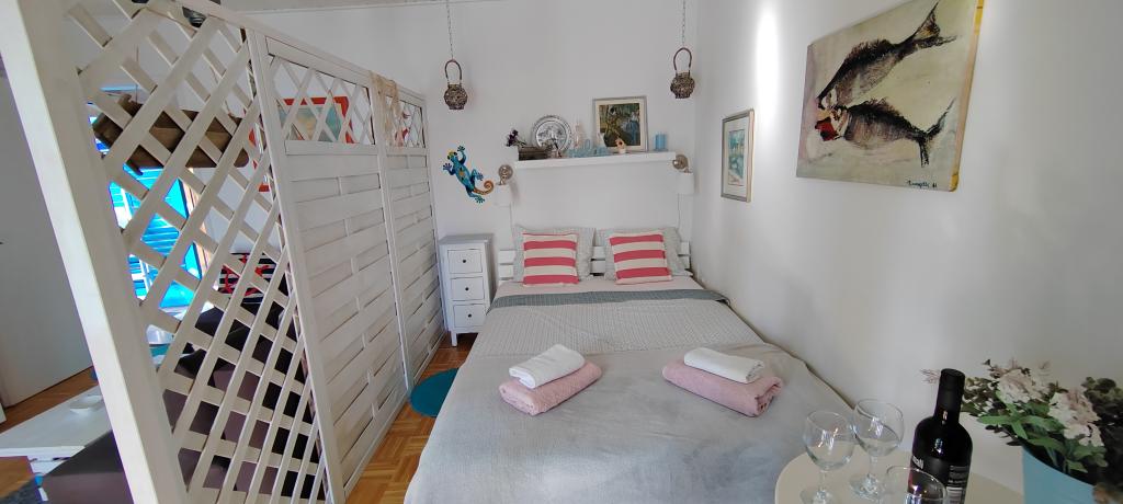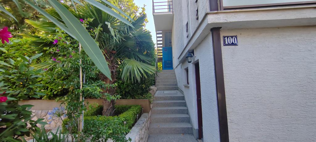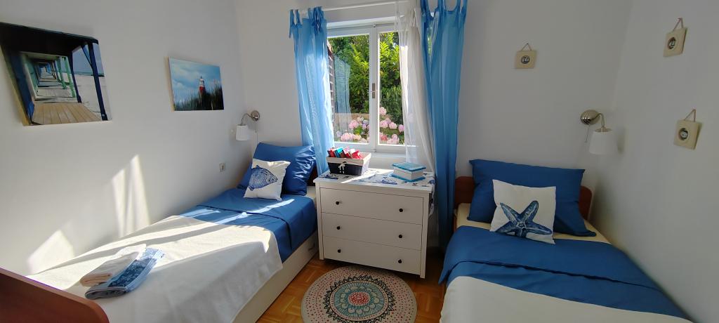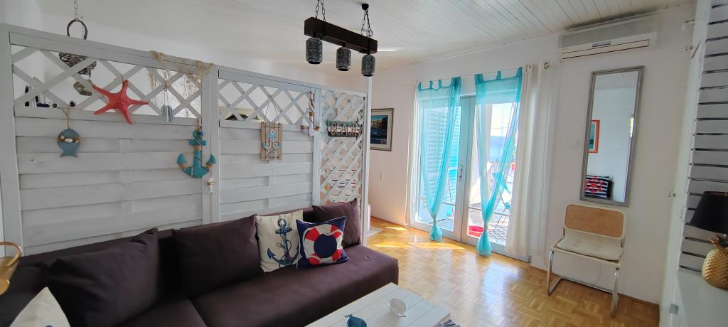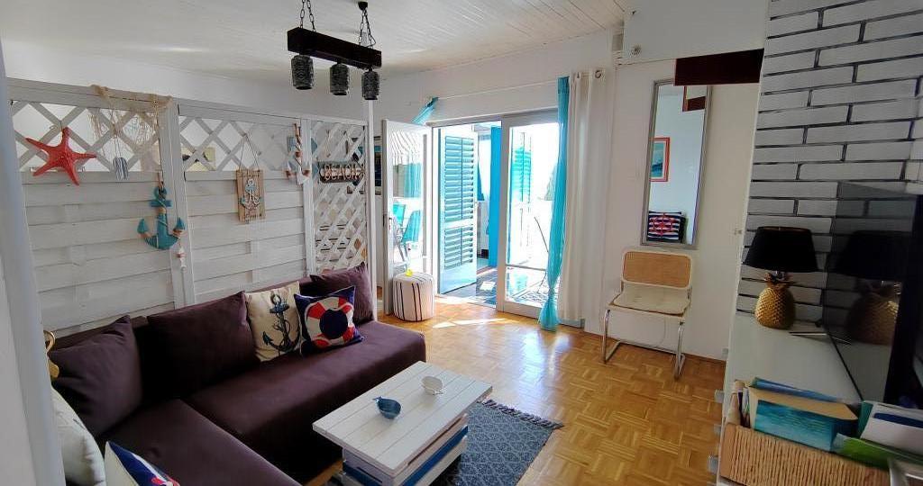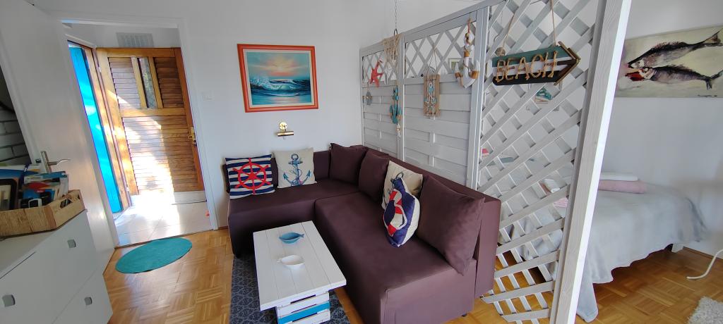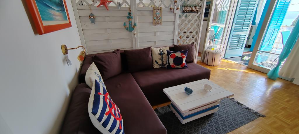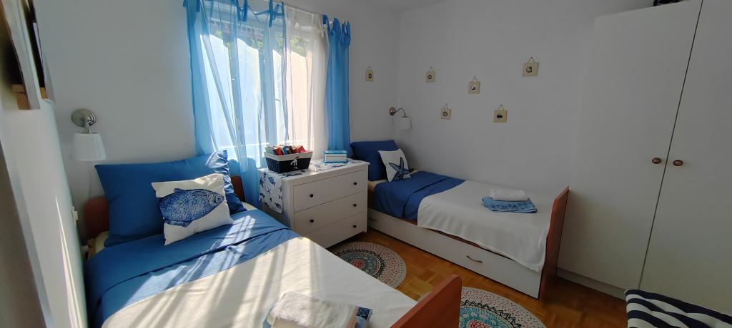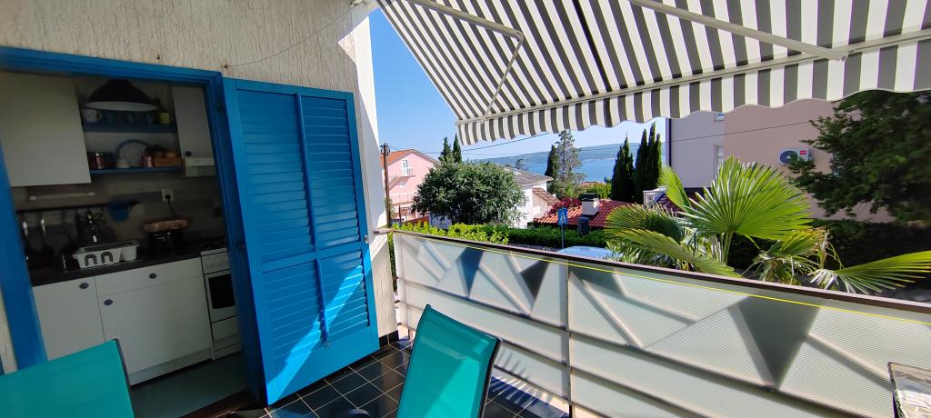 The apartment is located in a quiet place Dramalj, 2 km from the town of Crikvenica. The distance to the beach is 250 m and you have a choice: pebble beach, concrete, and rocky. The shop is 100 m from the accommodation, and there is a stop for the tourist train that goes to Crikvenica, Selce and Kačjak. You can also walk to Crikvenica along the coastal promenade, the walk takes about 20 minutes. The apartment is located on the first floor and consists of a living room, a separate bedroom with a double bed with access to a beautiful terrace with a sea view, which includes a kitchen and another room with separate beds and a bathroom. Parking is provided for guests.