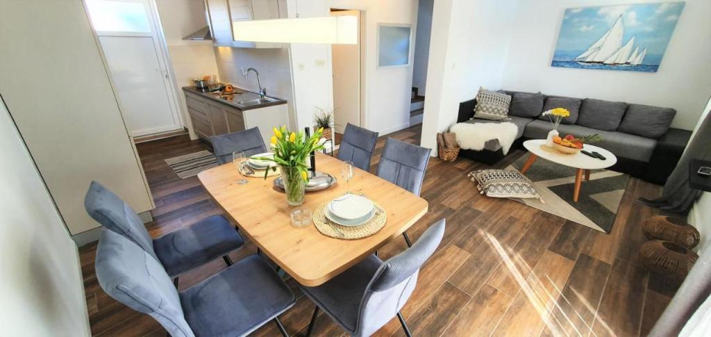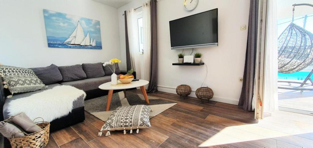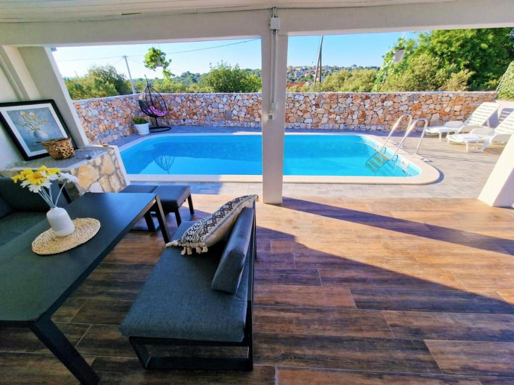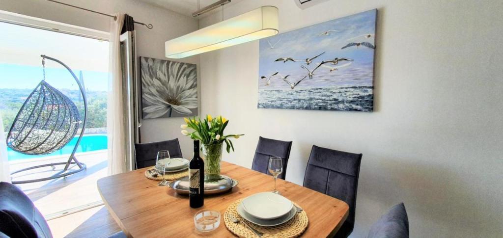 Holiday house Ana Laguna is located on the island of Drvenik Mali near Trogir and offers air-conditioned accommodation with a private pool. It is located 200 meters from Vela Rina beach. The house has 3 bedrooms, 2 bathrooms, linens, towels, a flat-screen TV with cable channels, a dining room, a fully equipped kitchen, and a balcony overlooking the pool. Guests can enjoy their meal in the outdoor dining area overlooking the garden.