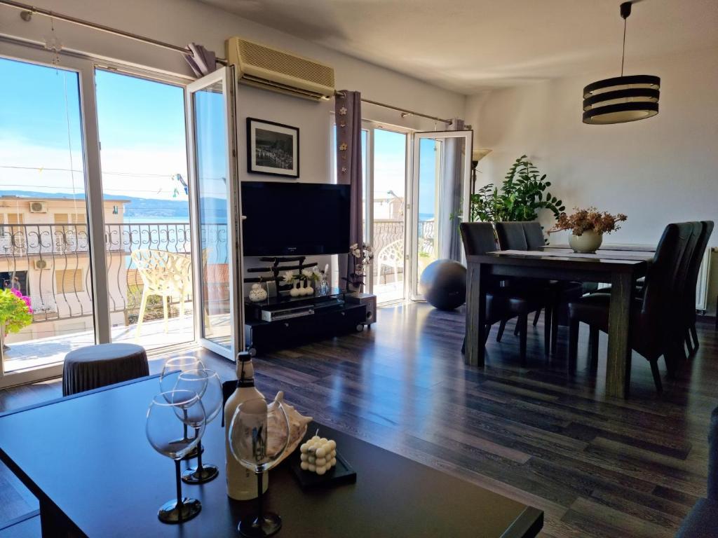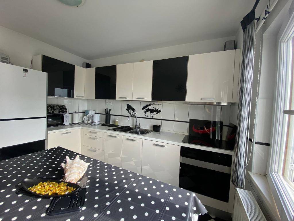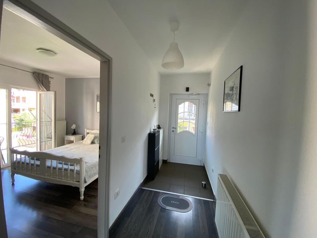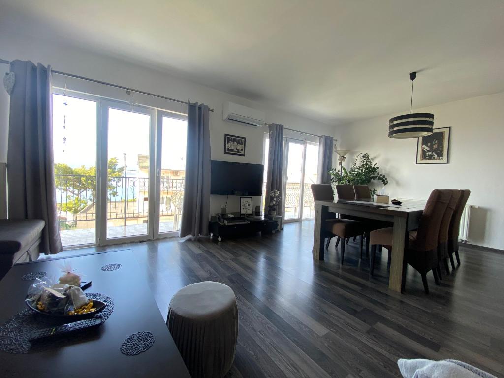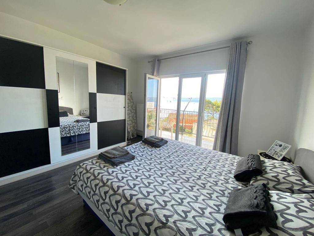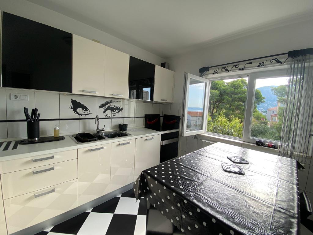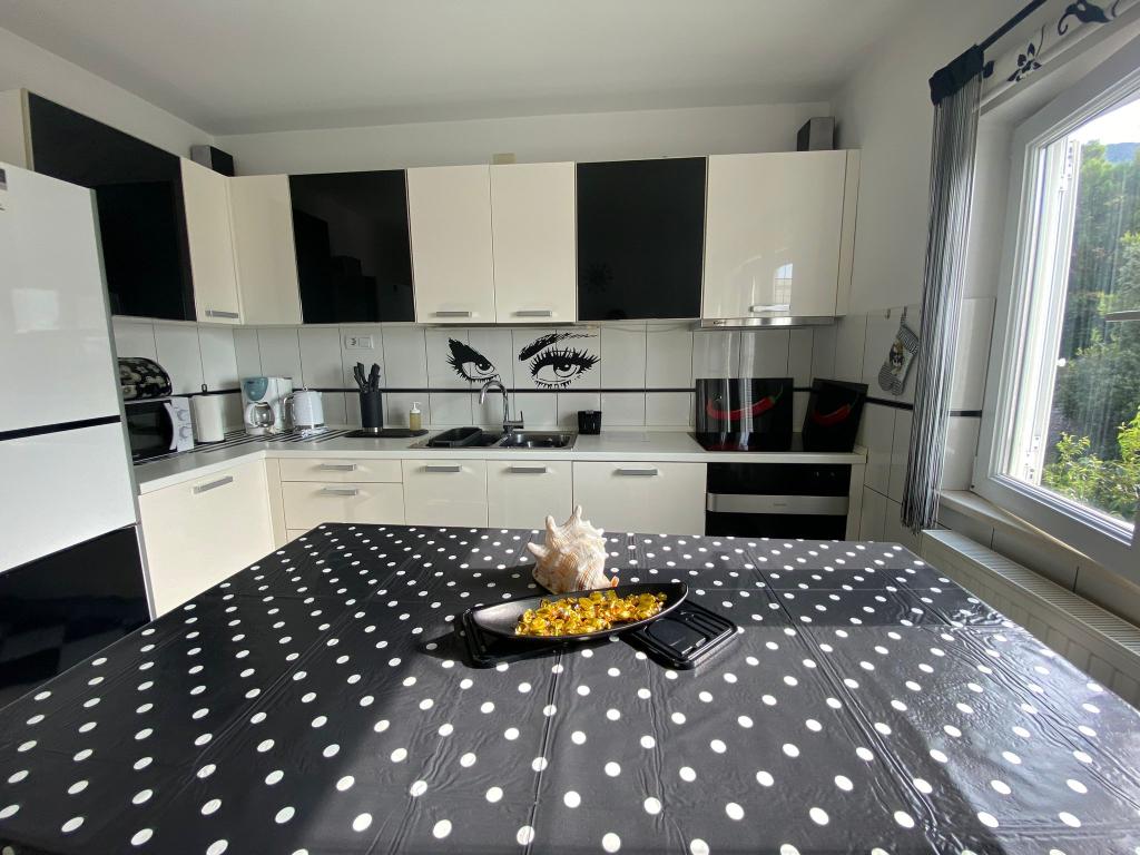 Apartment Black & White is a stylish two-bedroom apartment, located in Duce, close to the medieval old town of Omis, only a short walk (approximately 200 m) away from a breath-taking sandy beach. Nearby you can find shops, stores, restaurants, bars, excursion starting points and everything else you may need during your stay. Apartment Black & White can accommodate up to 4 persons in 2 bedrooms and approximately 100 m² of space (120 m² including balconies), and it’s a private apartment located on the second floor of a building. This apartment consists of two bedrooms with a double bed each. Additionally, the apartment offers a comfortable living room, a fully equipped kitchen with a dining area and a sitting area, one bathroom, one large balcony with a sea view and one smaller balcony as well. The kitchen is fully equipped and comes with a refrigerator with a freezing compartment, oven, stovetop, dishwasher, coffee machine, microwave, pots, pans, utensils and everything else you may nee