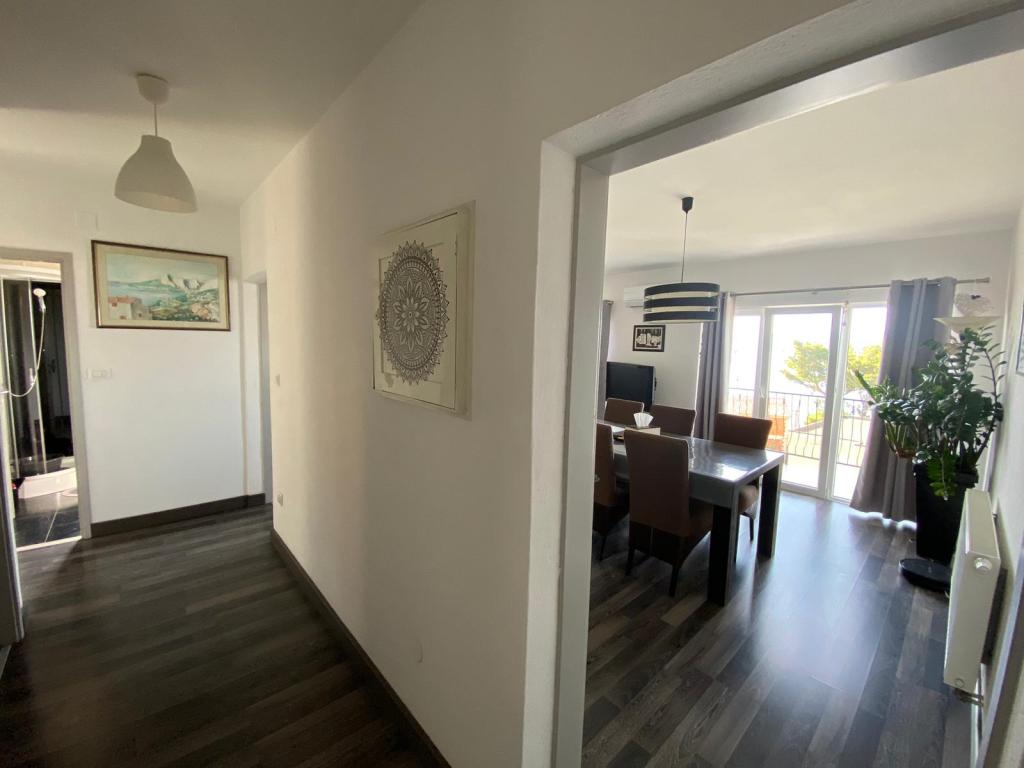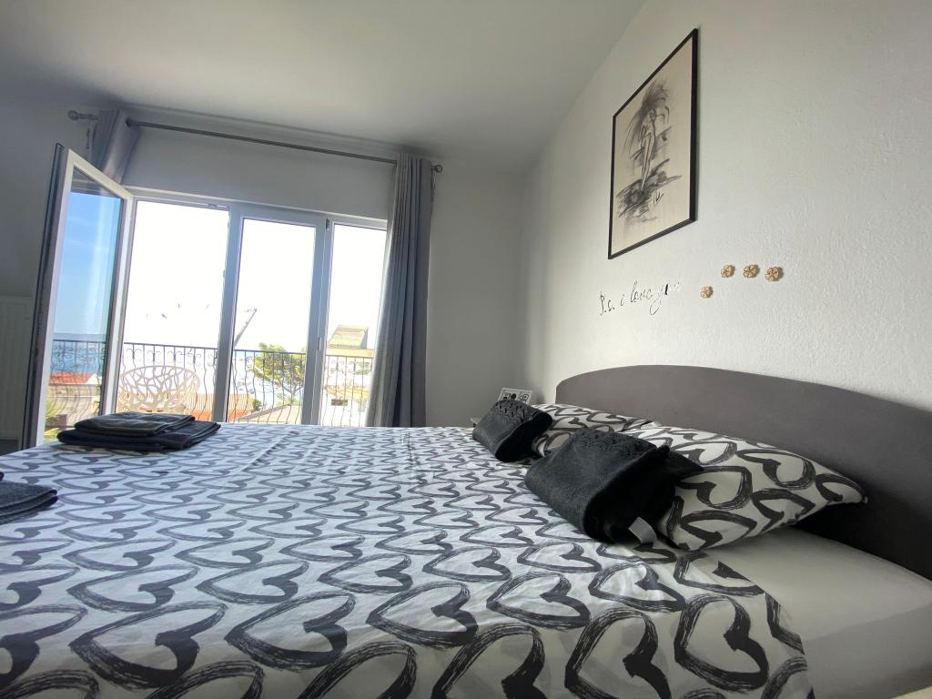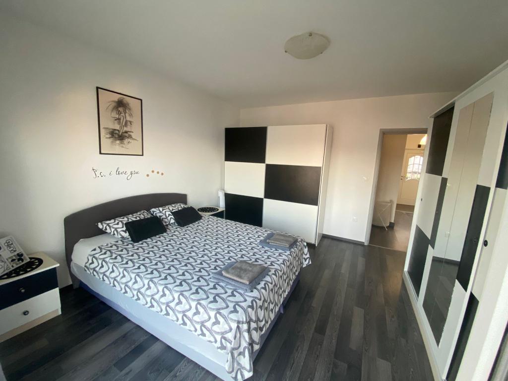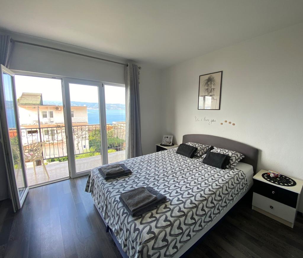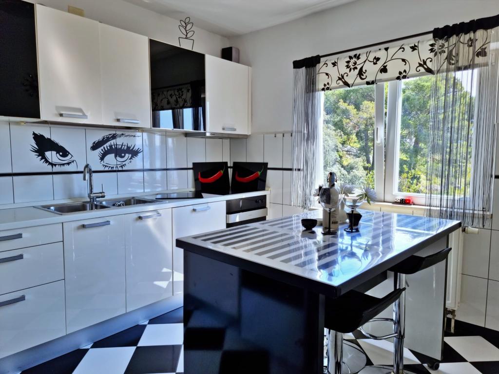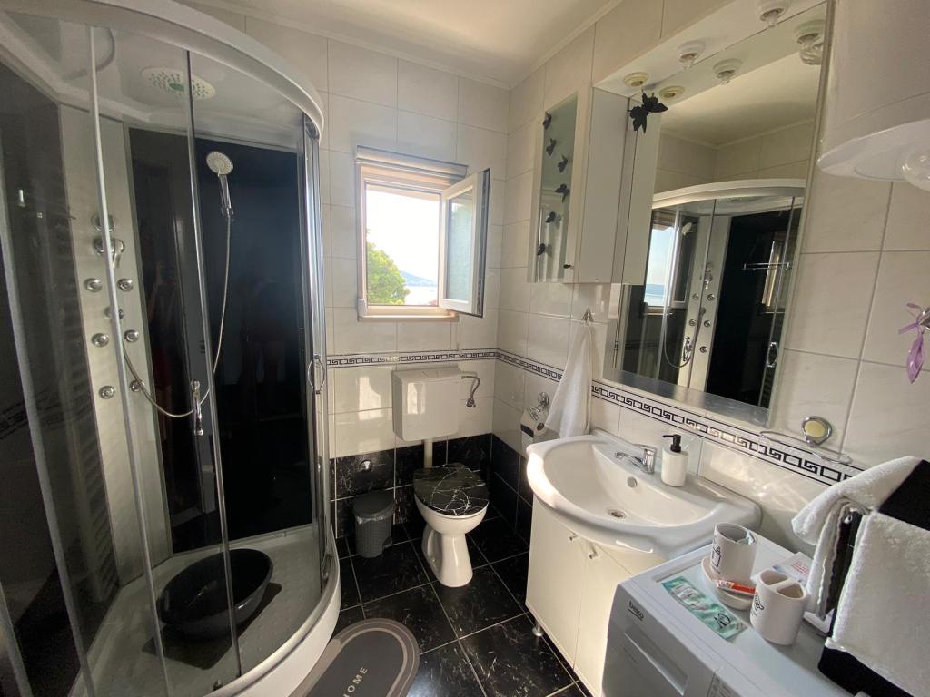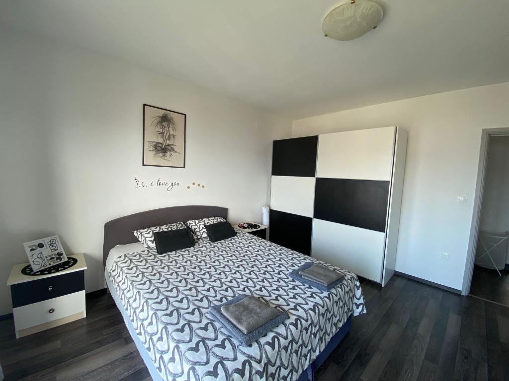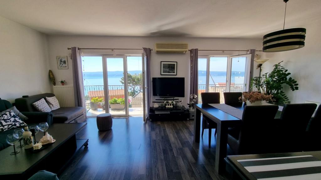 Apartment Black & White is a stylish two-bedroom apartment, located in Duce, close to the medieval old town of Omis, only a short walk (approximately 200 m) away from a breath-taking sandy beach. Nearby you can find shops, stores, restaurants, bars, excursion starting points and everything else you may need during your stay. Apartment Black & White can accommodate up to 4 persons in 2 bedrooms and approximately 100 m² of space (120 m² including balconies), and it’s a private apartment located on the second floor of a building. This apartment consists of two bedrooms with a double bed each. Additionally, the apartment offers a comfortable living room, a fully equipped kitchen with a dining area and a sitting area, one bathroom, one large balcony with a sea view and one smaller balcony as well. The kitchen is fully equipped and comes with a refrigerator with a freezing compartment, oven, stovetop, dishwasher, coffee machine, microwave, pots, pans, utensils and everything else you may nee