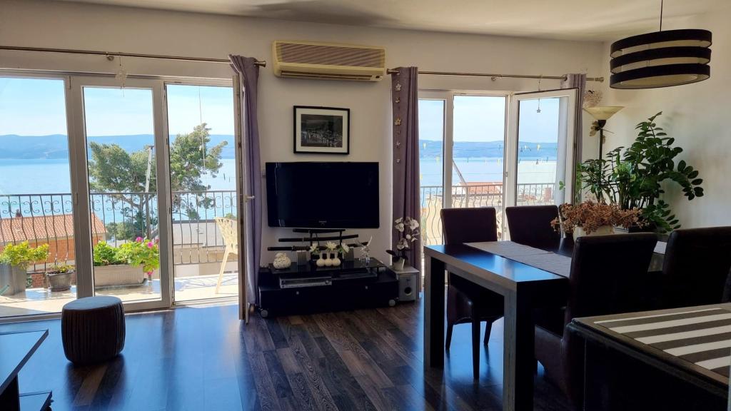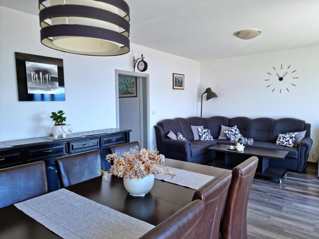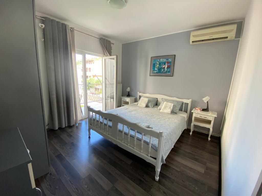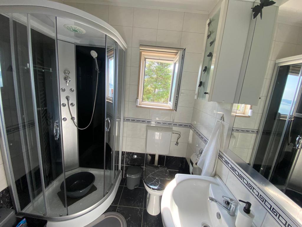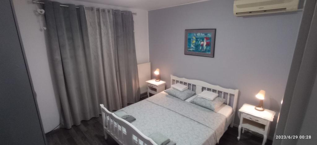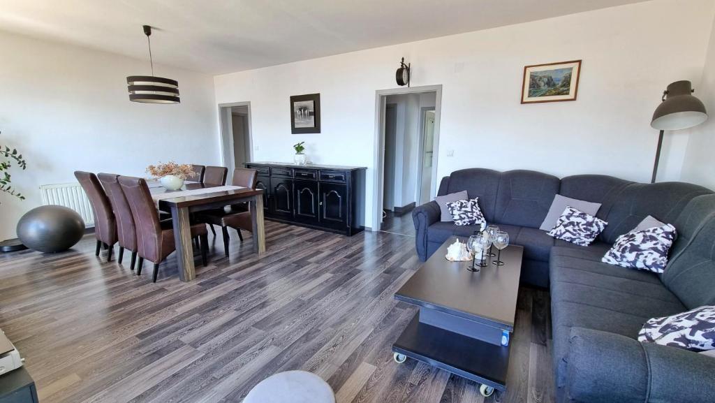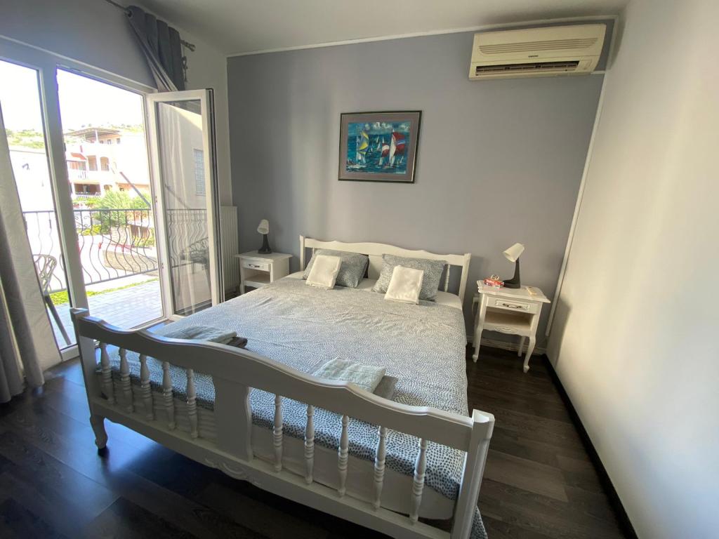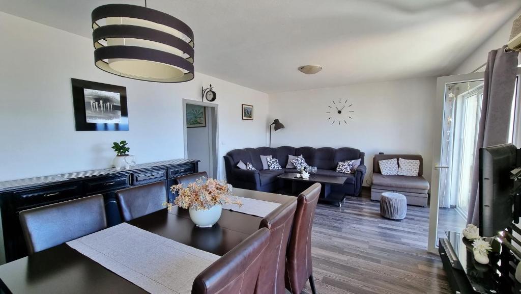 Apartment Black & White is a stylish two-bedroom apartment, located in Duce, close to the medieval old town of Omis, only a short walk (approximately 200 m) away from a breath-taking sandy beach. Nearby you can find shops, stores, restaurants, bars, excursion starting points and everything else you may need during your stay. Apartment Black & White can accommodate up to 4 persons in 2 bedrooms and approximately 100 m² of space (120 m² including balconies), and it’s a private apartment located on the second floor of a building. This apartment consists of two bedrooms with a double bed each. Additionally, the apartment offers a comfortable living room, a fully equipped kitchen with a dining area and a sitting area, one bathroom, one large balcony with a sea view and one smaller balcony as well. The kitchen is fully equipped and comes with a refrigerator with a freezing compartment, oven, stovetop, dishwasher, coffee machine, microwave, pots, pans, utensils and everything else you may nee