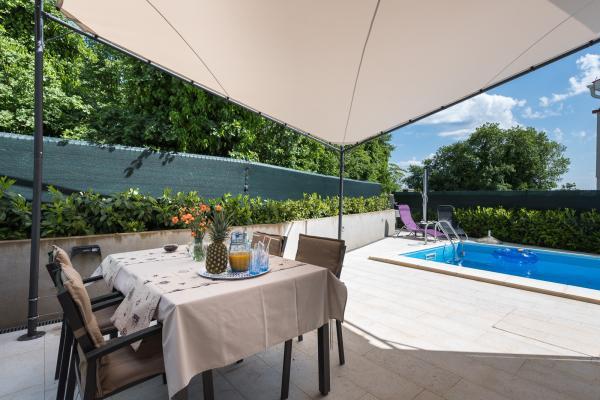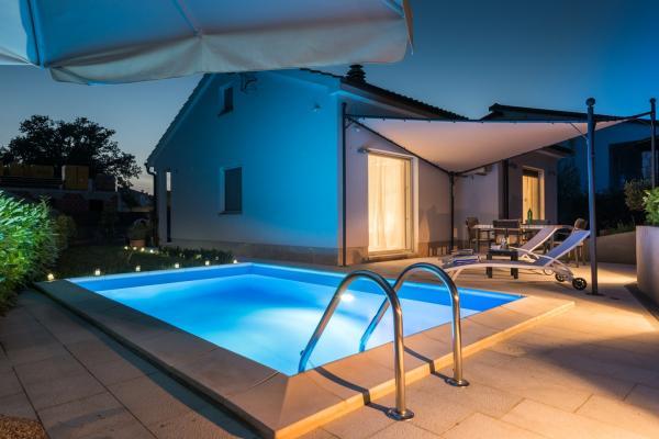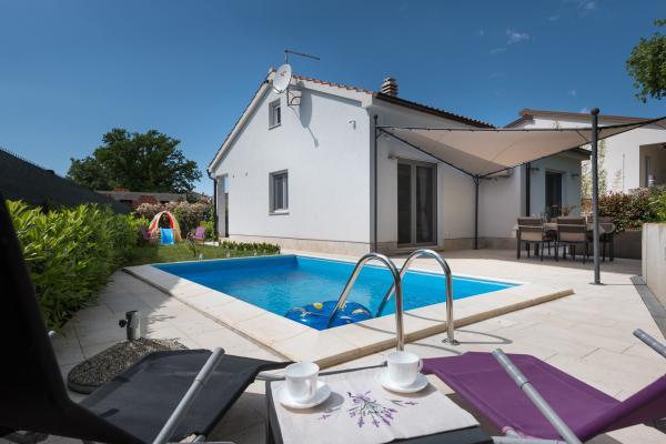 CASA DELPHIA is a modern detached house with a heated pool of 5 x 3 meters, in Šegotići, in the Marčana Municipality. It is located in a quiet and peaceful location and is an ideal choice for a complete holiday away from noise and crowds. Casa Delphia is for 4 people, it is located on a 315 m2 plot with 72 m2 of living space consisting of: kitchen, dining room and living room connected in one room, two bedrooms and bathroom and separate area with washing machine. The house is fully air-conditioned. From the living room you come out to a terrace where you can enjoy a morning coffee, prepare a delicious lunch on the grill, and in the evening with a lighted pool to sip a cocktail. They are waiting for you with comfortable sun loungers, table and chairs and a solar shower at the pool. If you want to spice your delicious meals, use spice herbs from a small Mediterranean garden. In front of the house there is a parking lot for cars, bicycles or scooters. The plot is completely fenced and closed.
