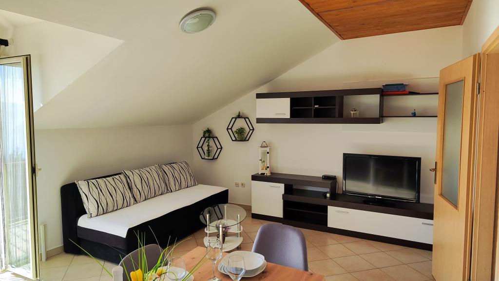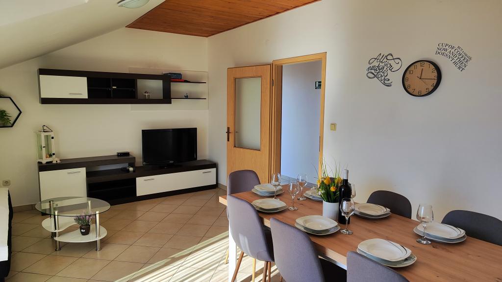 We stayed in apartment A2+2 FROM 08, -15,08,2024. Nice, neat and clean. Identical as in the ad. Modernly decorated. In front of the apartment is a large terrace that has shade throughout the day. A beautiful little lawn, greenery with flowers and a palm tree, it looks really nice. Of course, a view of the sea. The hosts are very kind and nice. Available if you need something, yet unobtrusive. The beach is beautiful and clean, there is both sun and shade. He can choose what he likes. It only took us some time to get used to walking up the hill after returning from the beach, but there are shortcuts, so we mastered that too, The location is great, you can reach Split and Omiš in 15-20 minutes. By bus or car. Recommendation for the restaurant Therapy on the beach.