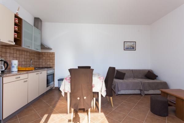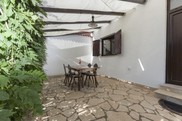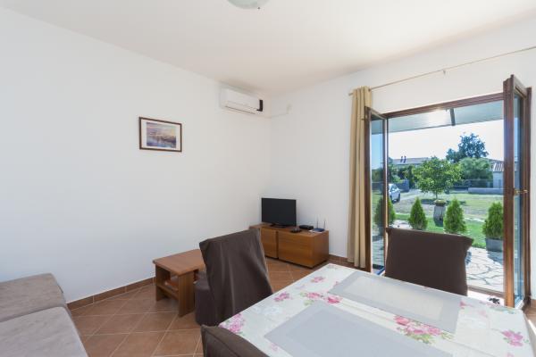 Apartment (40 m2) is located on the ground floor in a quiat area of Fazana, called Valbandon. It consists of one bedroom with a double bed, a living room with kitchen (with two extra sofa beds), bathroom with a shower and a large terrace. Near the house is pine forest with marked cycling and hiking trails. Free parking space in the yard. Air conditioning, free Wi-Fi and use of BBQ. Valbandon is part of Fazana, famous romantic fisherman\\s townfrom where you can take a boat trip and visit the national park Brijuni. Valbandon\\s beaches are equipped with many facilities for children.