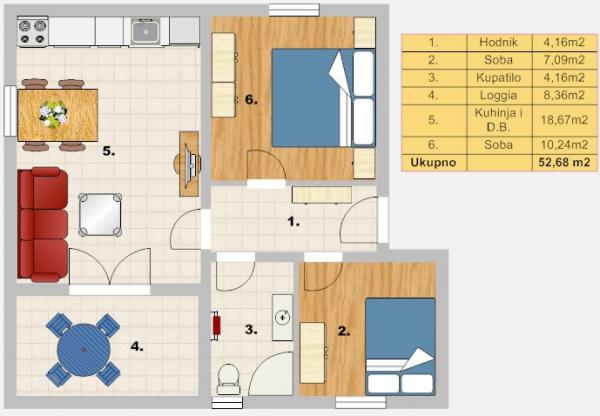 Modernly furnished new comfortable apartments 55m2, living room, dining room, kitchen, bedroom, children's room, bathroom, terrace, air conditioning, wi-fi, dishwasher, tv, new ... 5 minutes walk to the beautiful beach, 4 minutes to the store ...