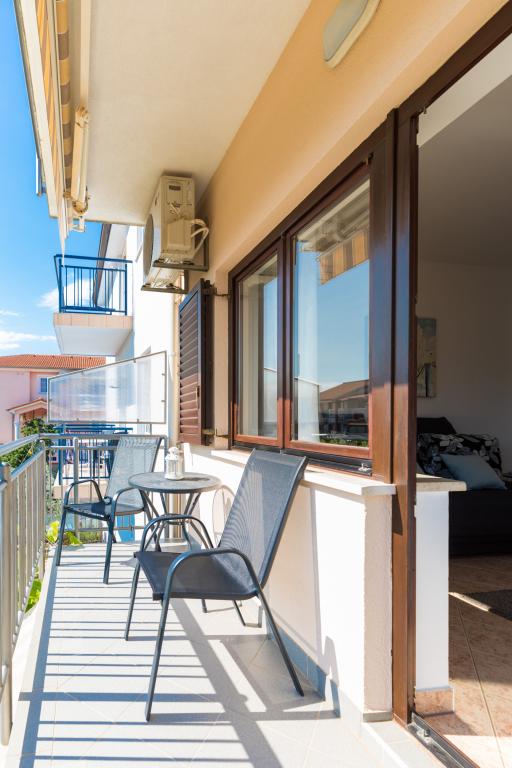 The apartment is on the 1st floor of a beautiful and well-kept house. The owners are very courteous and friendly. We were invited to a very great food with freshly caught grilled sea bass. The whole house and especially our apartment were very clean and nicely decorated. We had a comfortable kitchen, a large bathroom and a balcony over the entire house for the side south-west side with enough space for drying beach towels and bathing suits. The beach is about 200, the city center 350 m. Better we could not have hit. This landlord and the apartments are thoroughly recommended.