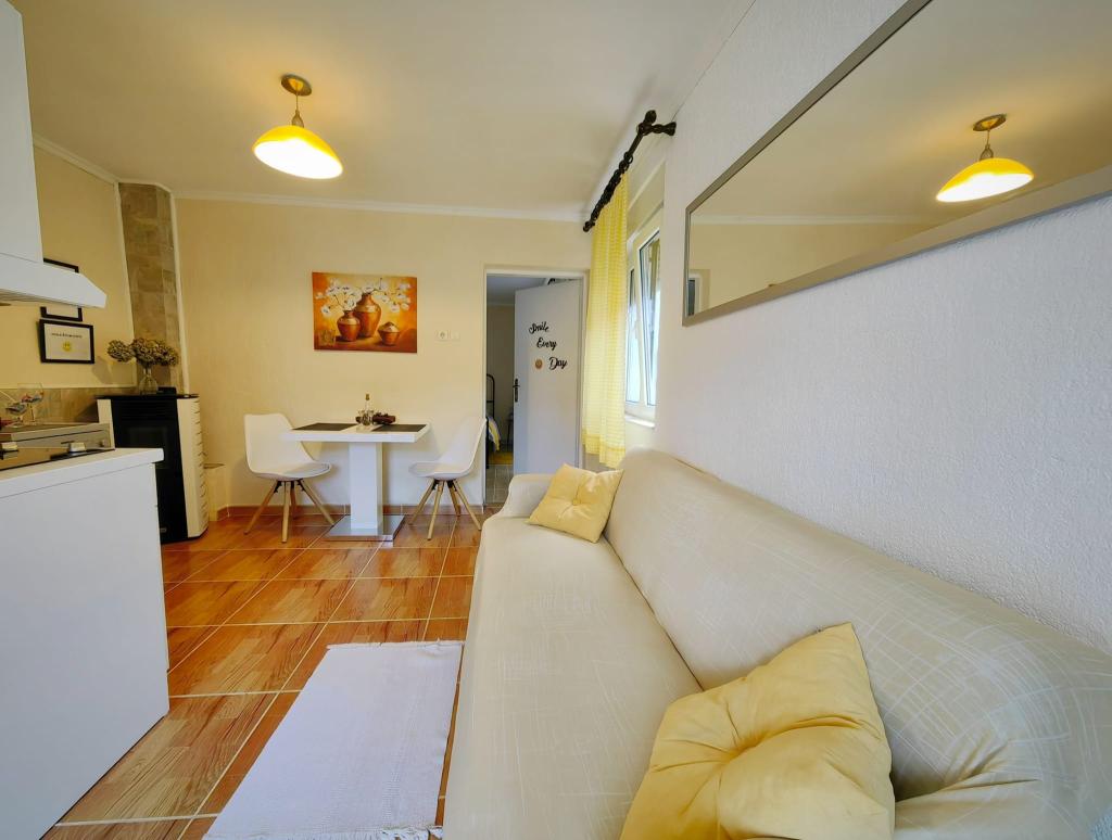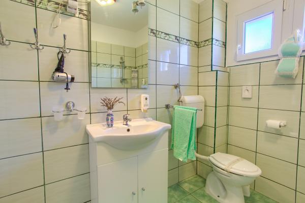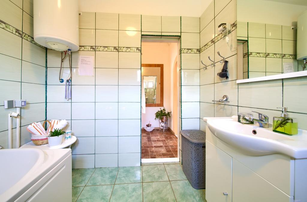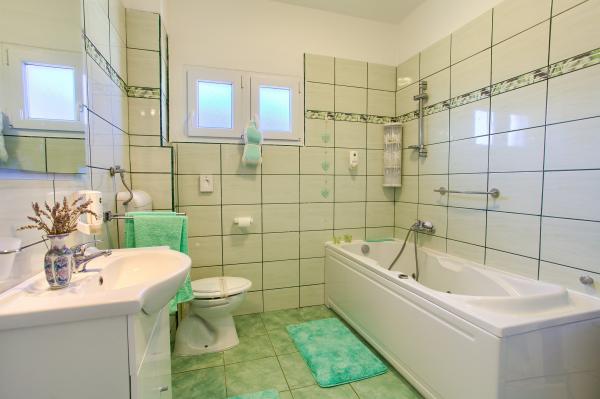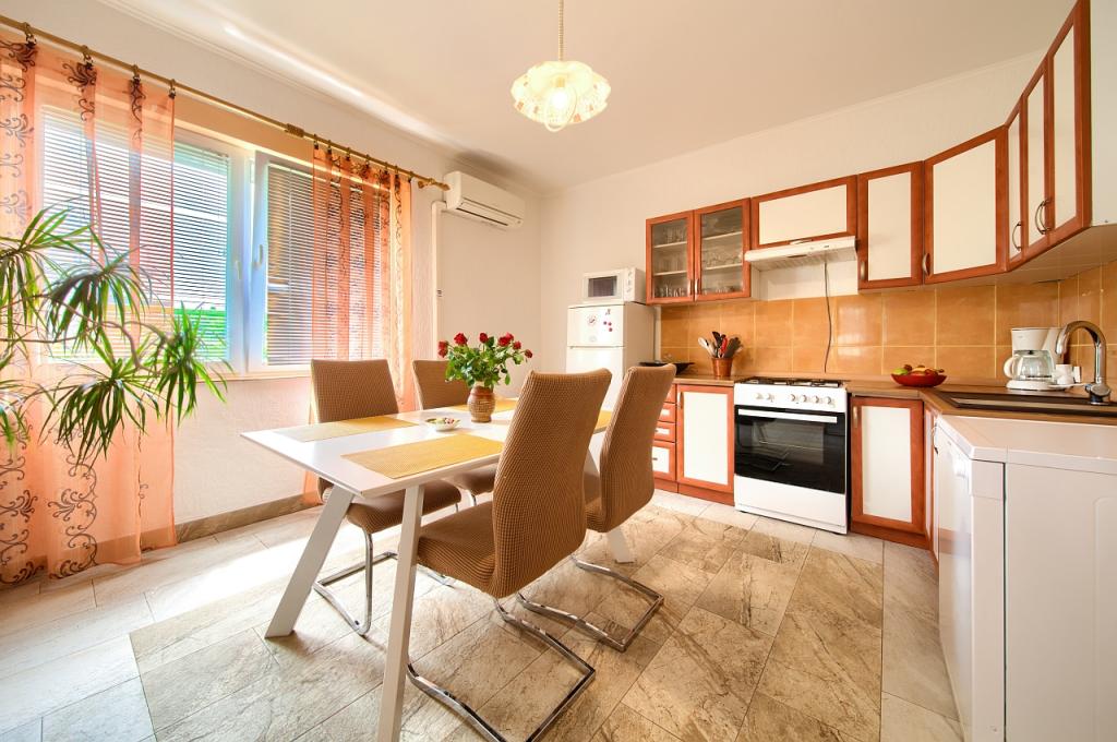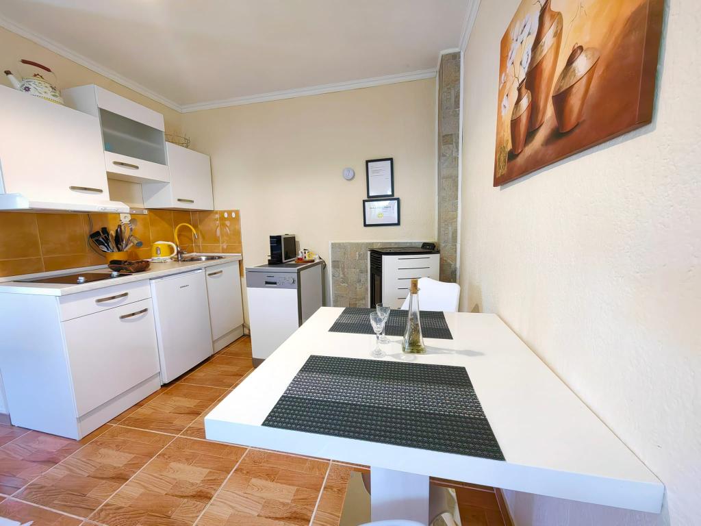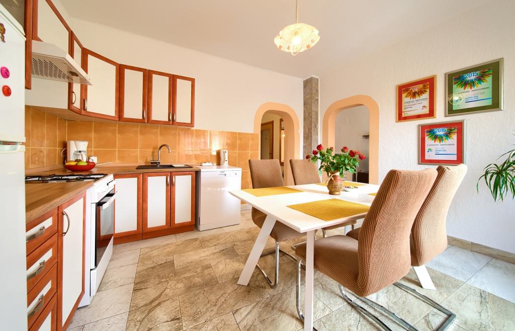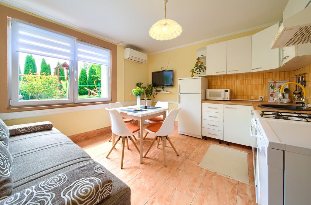 Residential tax is included in price.App. 2 2 is located on the ground floor and occupies an area of 55 m2. It consists of a hallway at the entrance, a fully equipped kitchen that you can use as a living room, bedroom and bathroom. In the bedroom there is a double bed and an extra bed. The couch in the kitchen / living room can also be used as an extra bed for two people. The spacious bathroom is equipped with a shower and a washing machine. App. 2 1 is located on the ground floor of the house with separate entrance consisting of a three-bed room kitchen with living room where there is a sofa used as an extra bed and a bathroom. Guests have at their disposal a barbeque with bbq, bicycles, winter garden furniture, free internet, and private parking space. There is also a welcome drink.