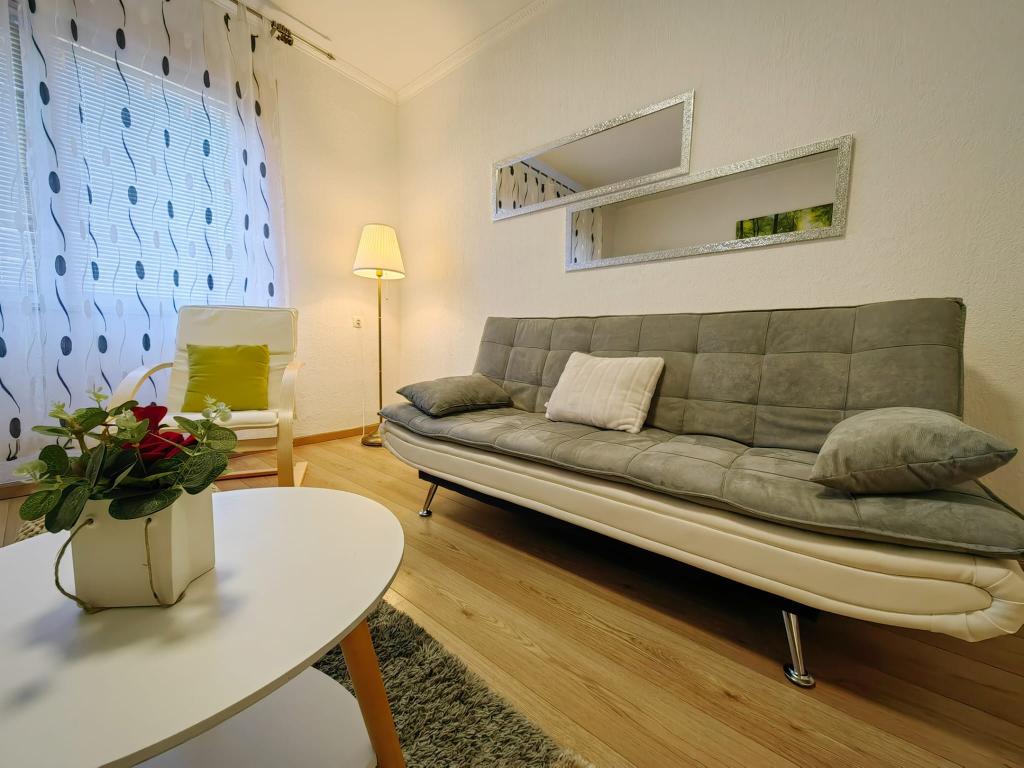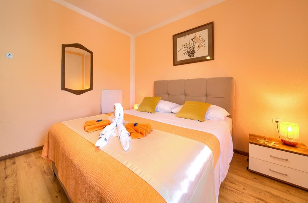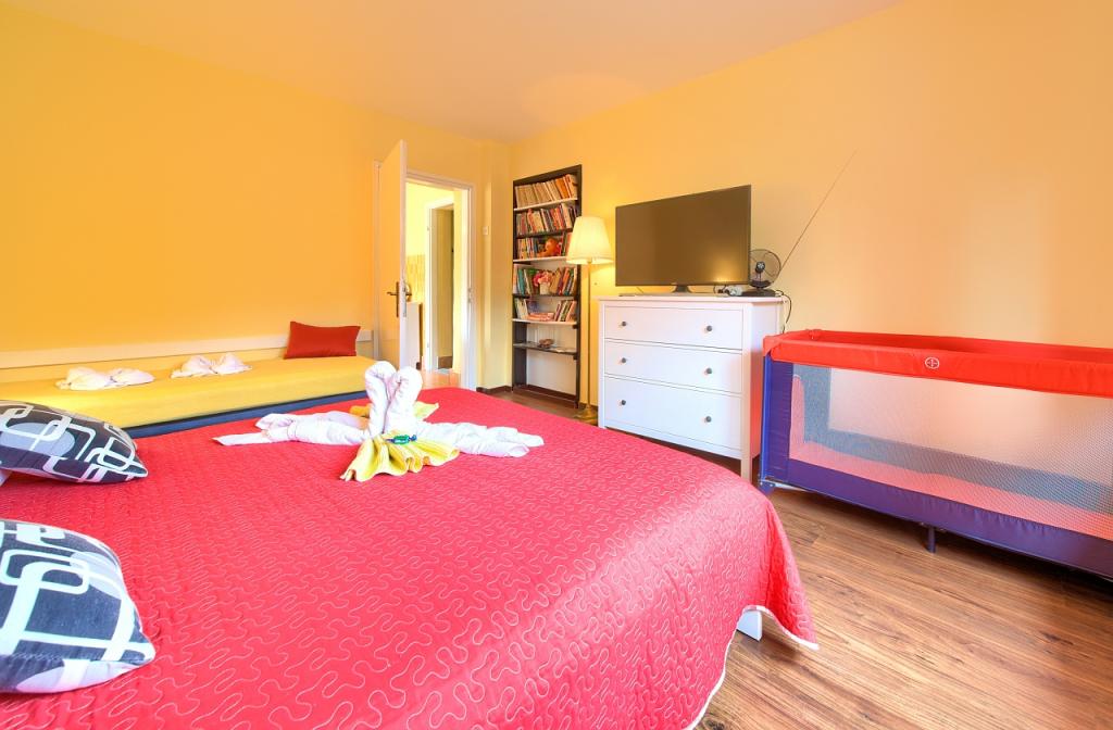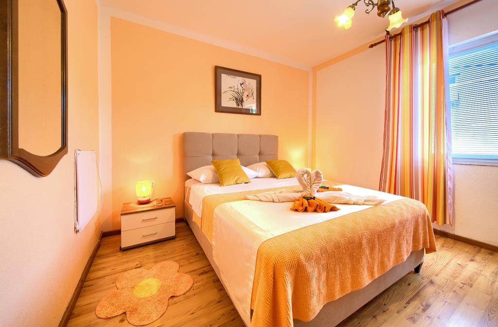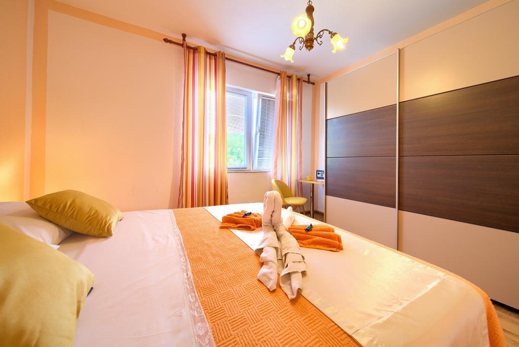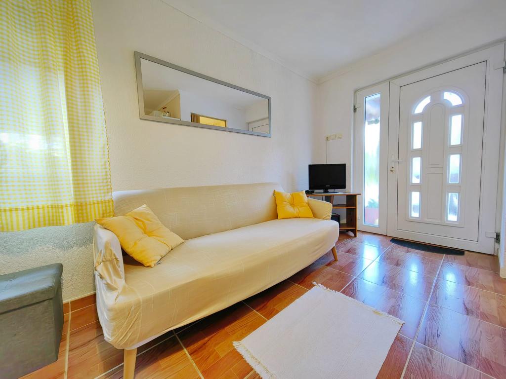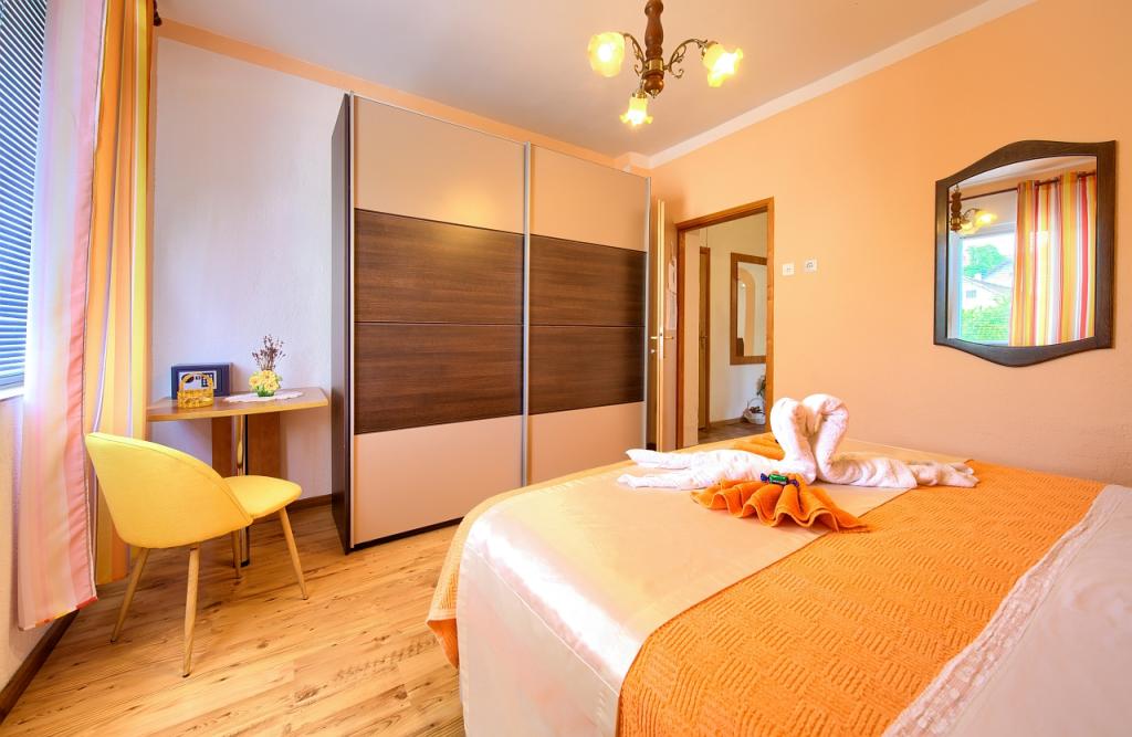 Residential tax is included in price.App. 2 2 is located on the ground floor and occupies an area of 55 m2. It consists of a hallway at the entrance, a fully equipped kitchen that you can use as a living room, bedroom and bathroom. In the bedroom there is a double bed and an extra bed. The couch in the kitchen / living room can also be used as an extra bed for two people. The spacious bathroom is equipped with a shower and a washing machine. App. 2 1 is located on the ground floor of the house with separate entrance consisting of a three-bed room kitchen with living room where there is a sofa used as an extra bed and a bathroom. Guests have at their disposal a barbeque with bbq, bicycles, winter garden furniture, free internet, and private parking space. There is also a welcome drink.