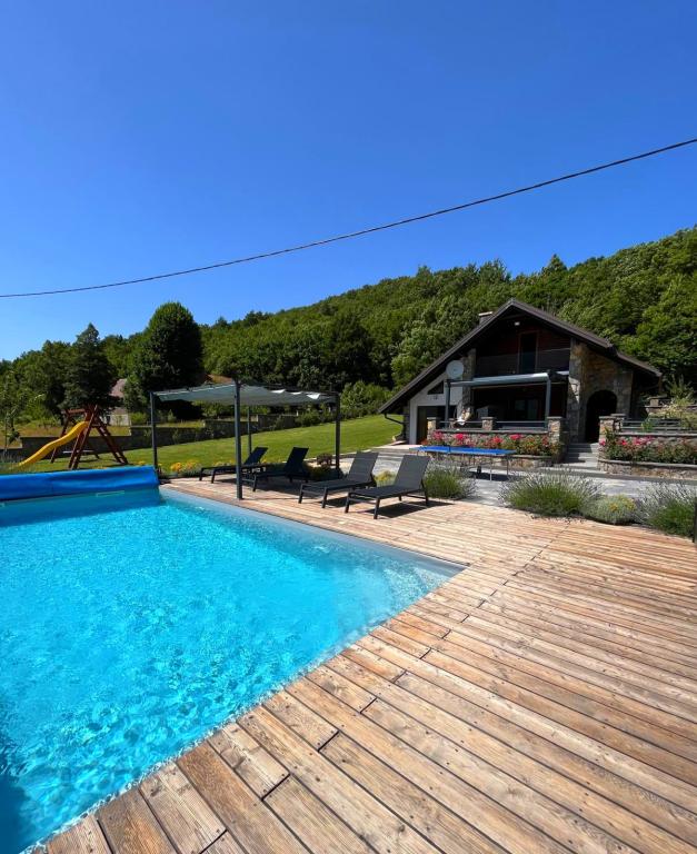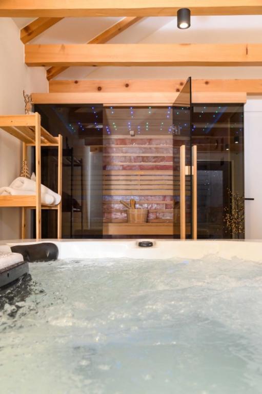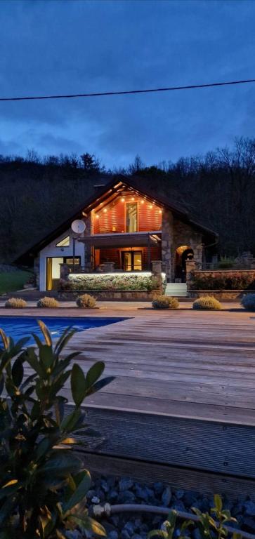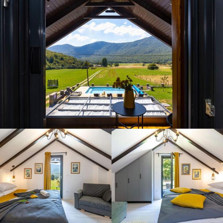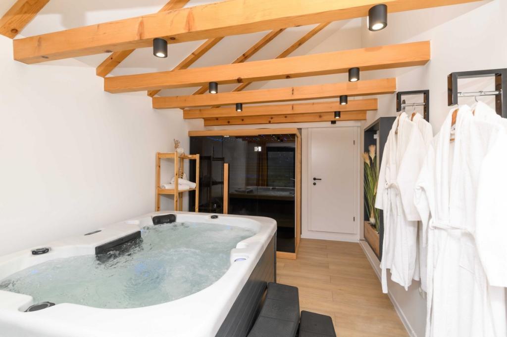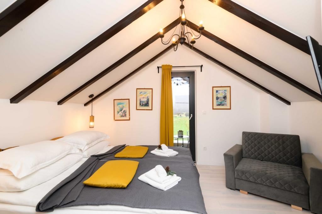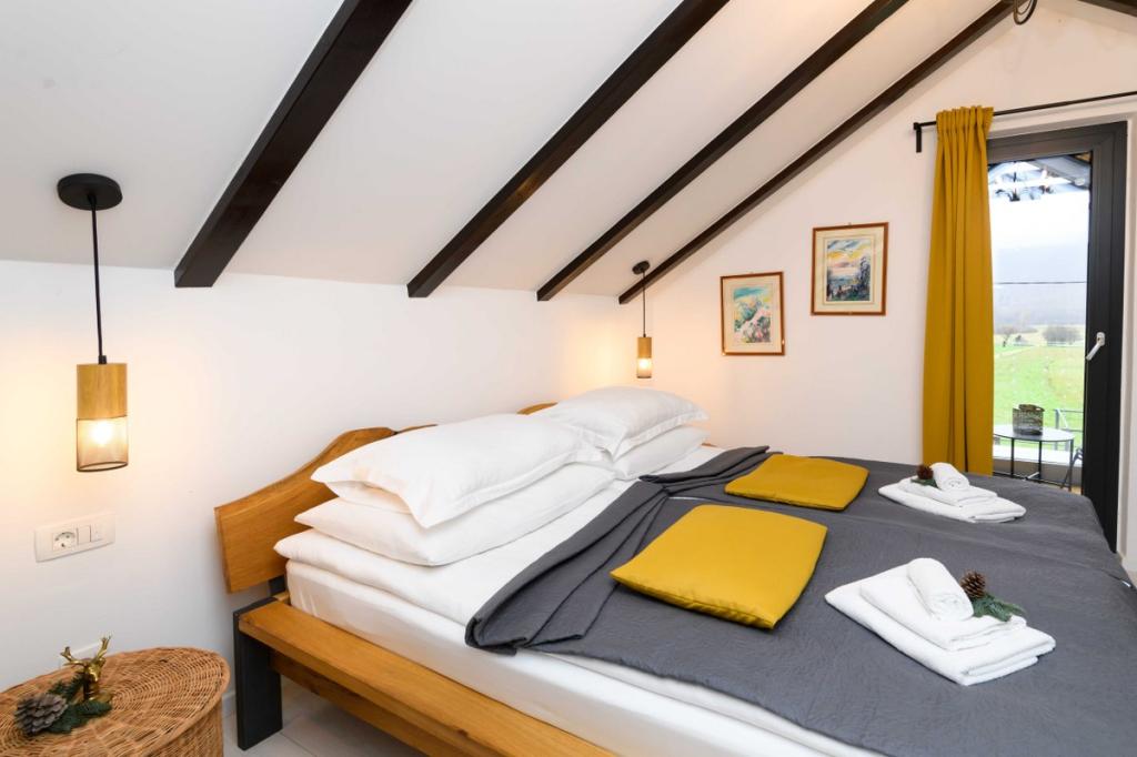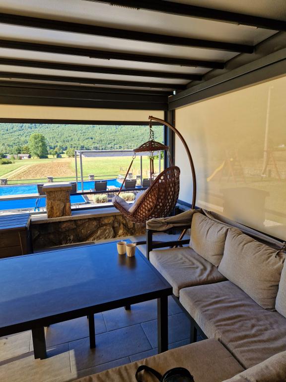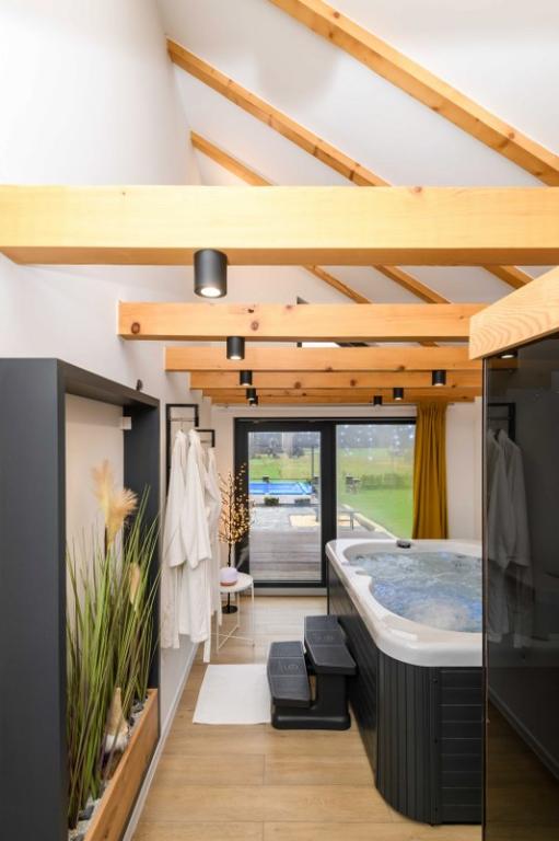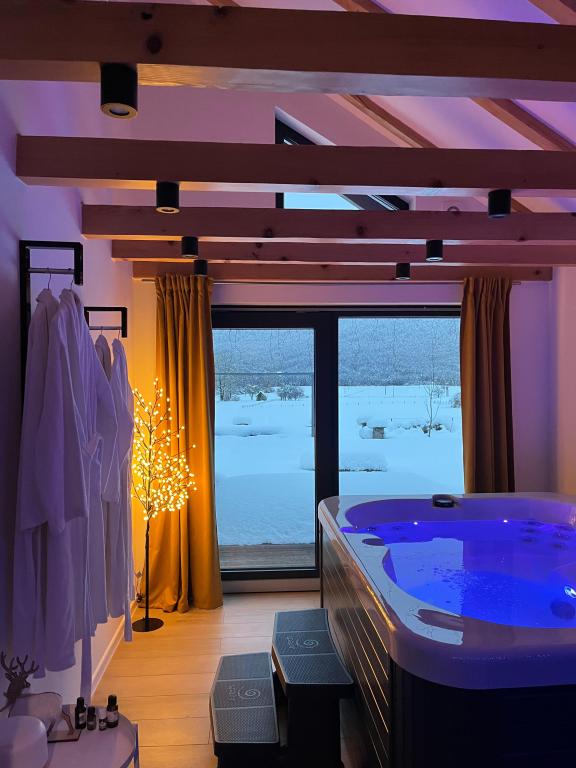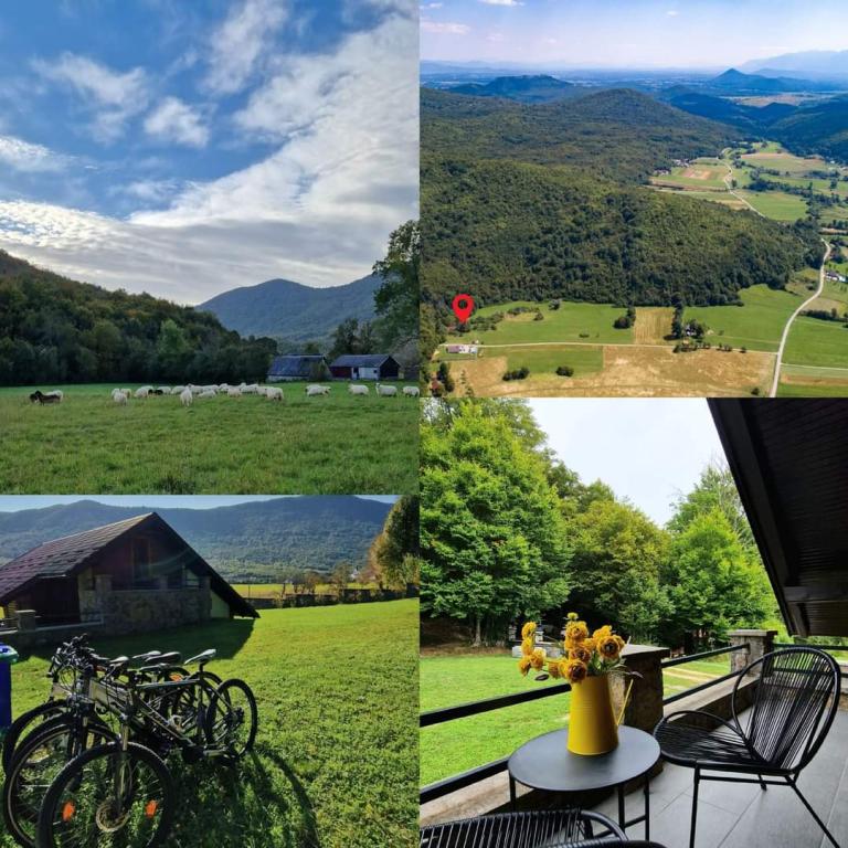 The Liko Diko holiday home is located in a clearing, on the edge of the forest (secluded), away from the road (300m) and is ideal for a holiday throughout the year. The combination of the warmth of tradition and modern amenities is the ideal combination for an authentic experience of nature. Whether you are looking for adventure, socializing with friends and family or complete relaxation, Liko Diko offers it all with its offer and location! With two rooms (each with 3 beds and each with its own balcony), two fully equipped bathrooms, a dining room and a kitchen with all the necessary appliances and basic groceries. A special experience is provided by the spa area with a glass wall and a view of the beautiful landscape - a jacuzzi for 4 people and a bio-salt sauna with Himalayan salt. Living room (if necessary, a sofa bed with a mattress topper can be pulled out) with a fireplace, a table football table (mini billiards), a children's corner, board games,.. Terrace covered with a pergola and a gas barbecue, outdoor pool (May-September), trampoline. table tennis table, children's playground, goals, bicycles for use,..