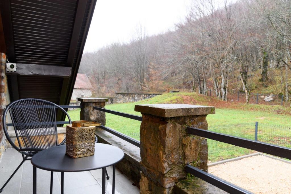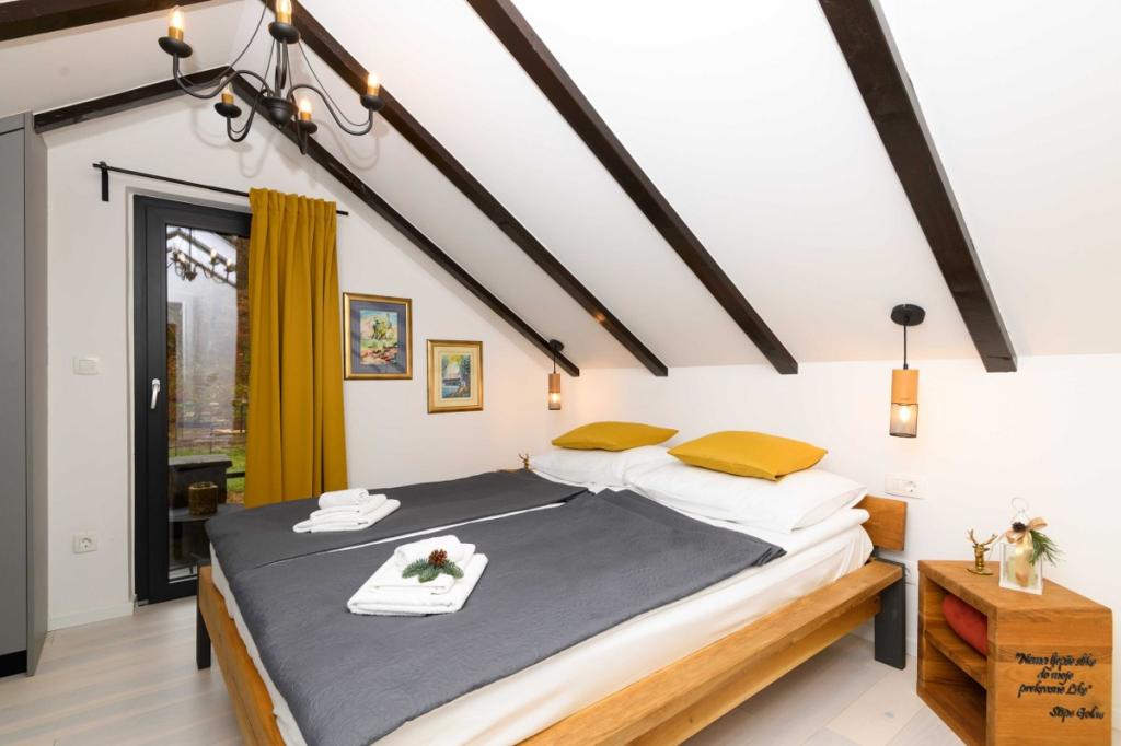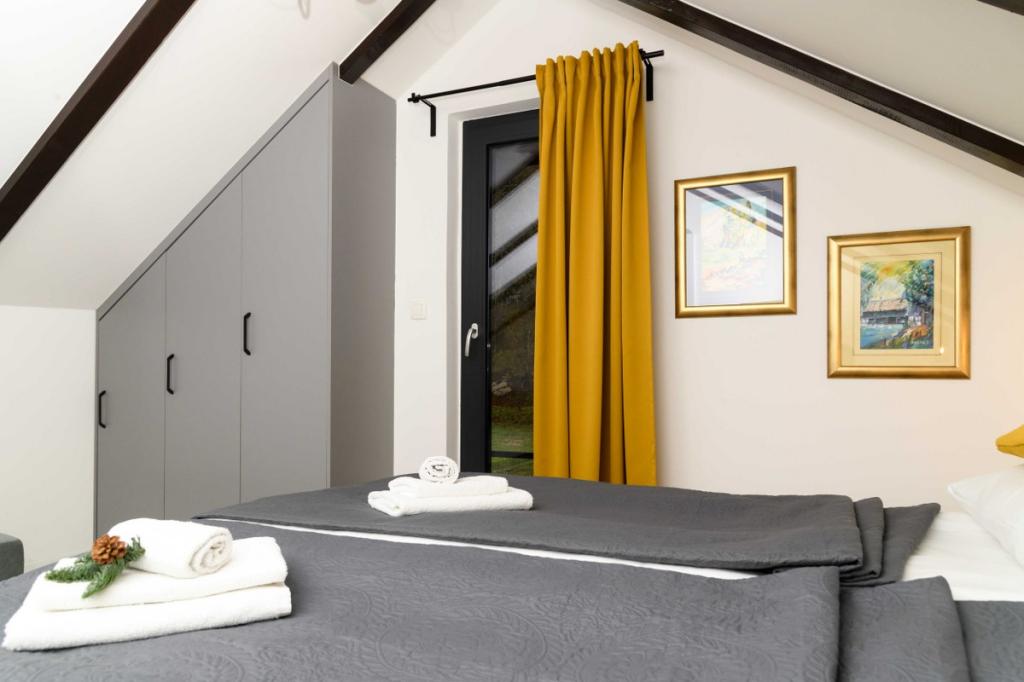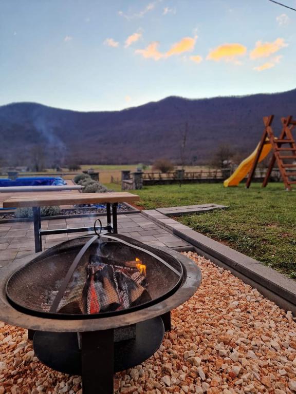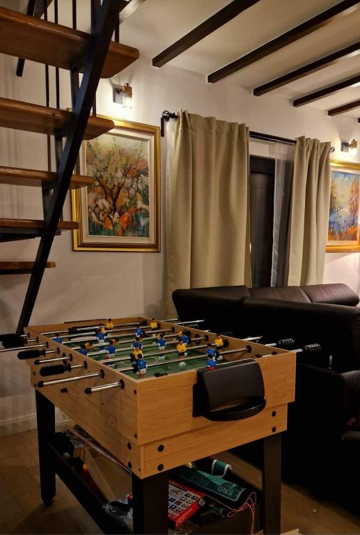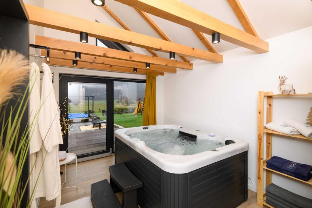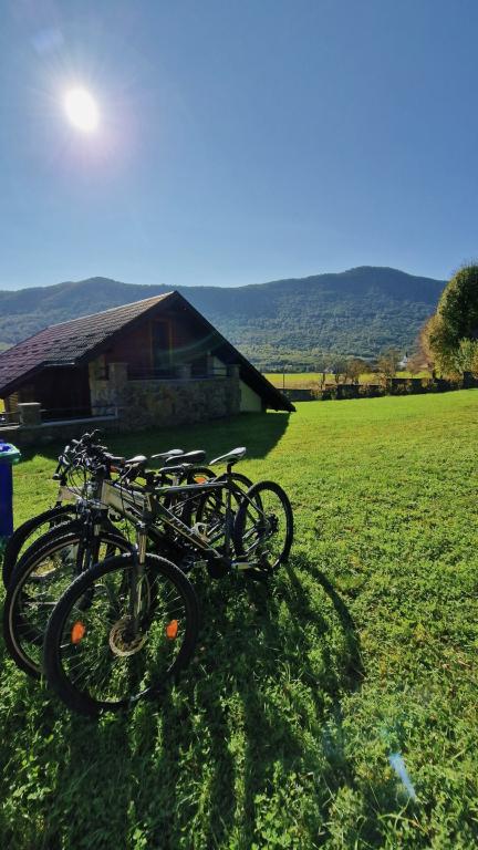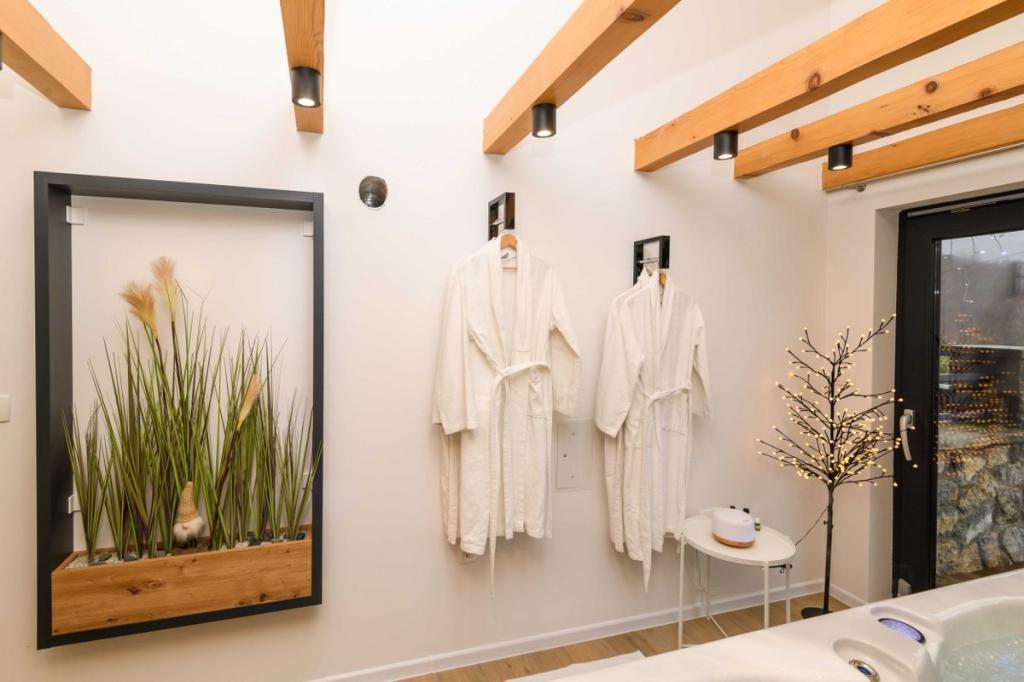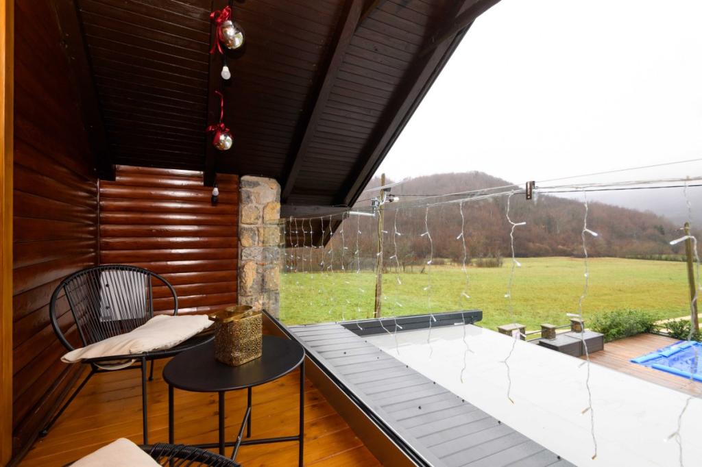 The Liko Diko holiday home is located in a clearing, on the edge of the forest (secluded), away from the road (300m) and is ideal for a holiday throughout the year. The combination of the warmth of tradition and modern amenities is the ideal combination for an authentic experience of nature. Whether you are looking for adventure, socializing with friends and family or complete relaxation, Liko Diko offers it all with its offer and location! With two rooms (each with 3 beds and each with its own balcony), two fully equipped bathrooms, a dining room and a kitchen with all the necessary appliances and basic groceries. A special experience is provided by the spa area with a glass wall and a view of the beautiful landscape - a jacuzzi for 4 people and a bio-salt sauna with Himalayan salt. Living room (if necessary, a sofa bed with a mattress topper can be pulled out) with a fireplace, a table football table (mini billiards), a children's corner, board games,.. Terrace covered with a pergola and a gas barbecue, outdoor pool (May-September), trampoline. table tennis table, children's playground, goals, bicycles for use,..