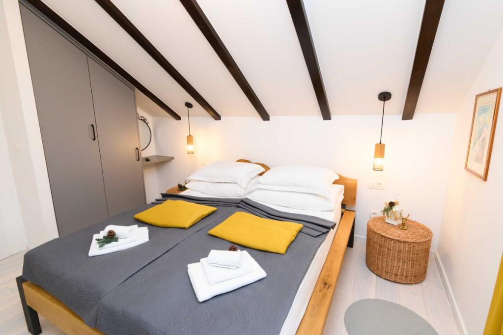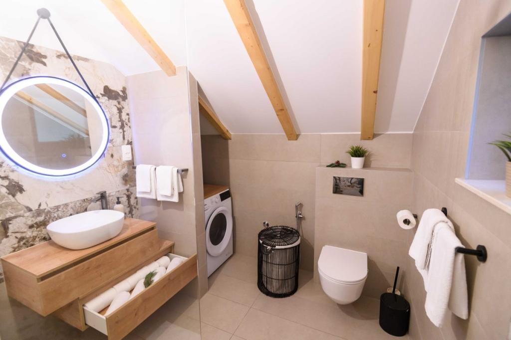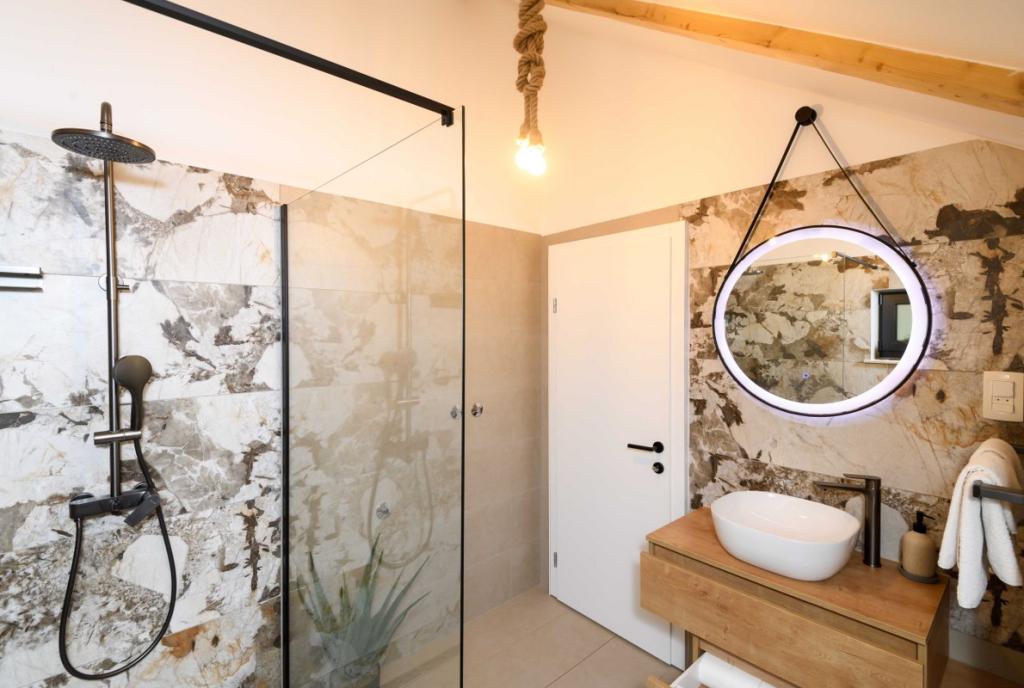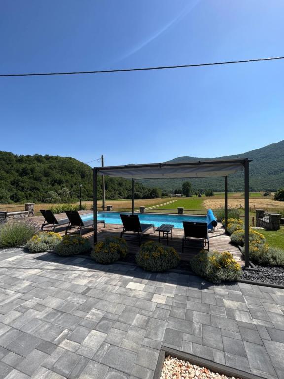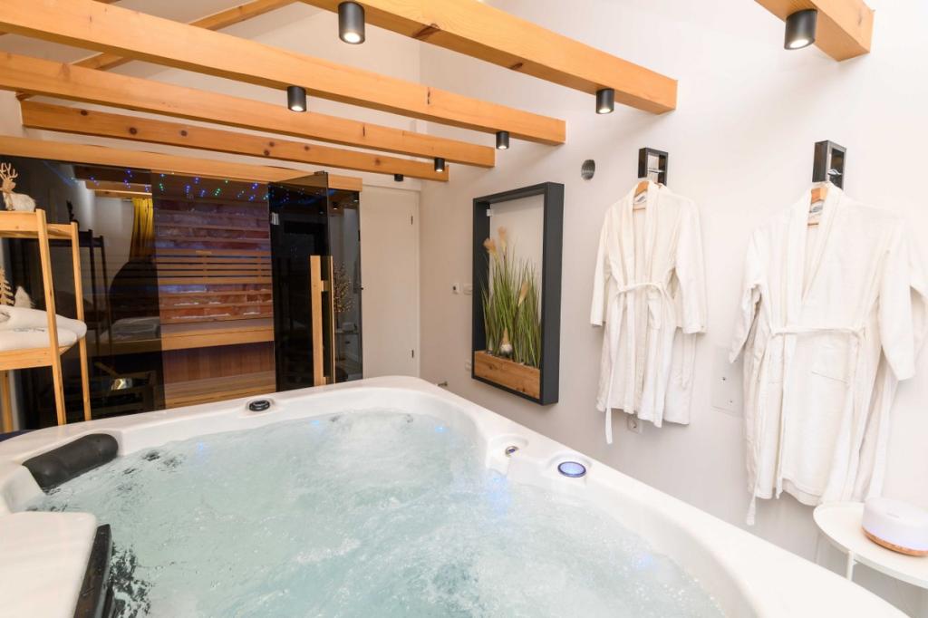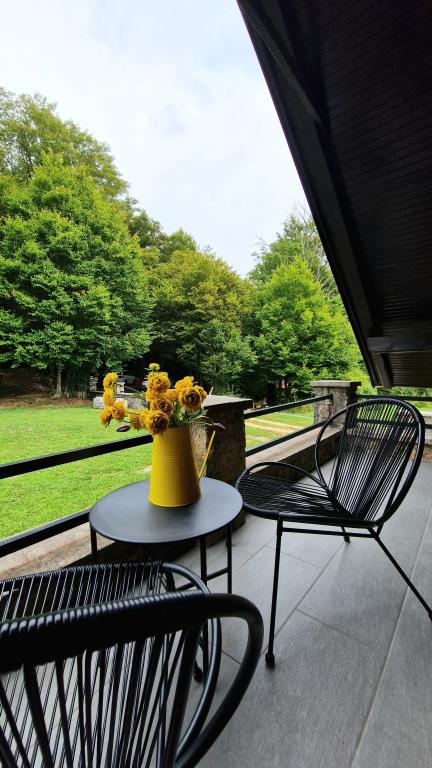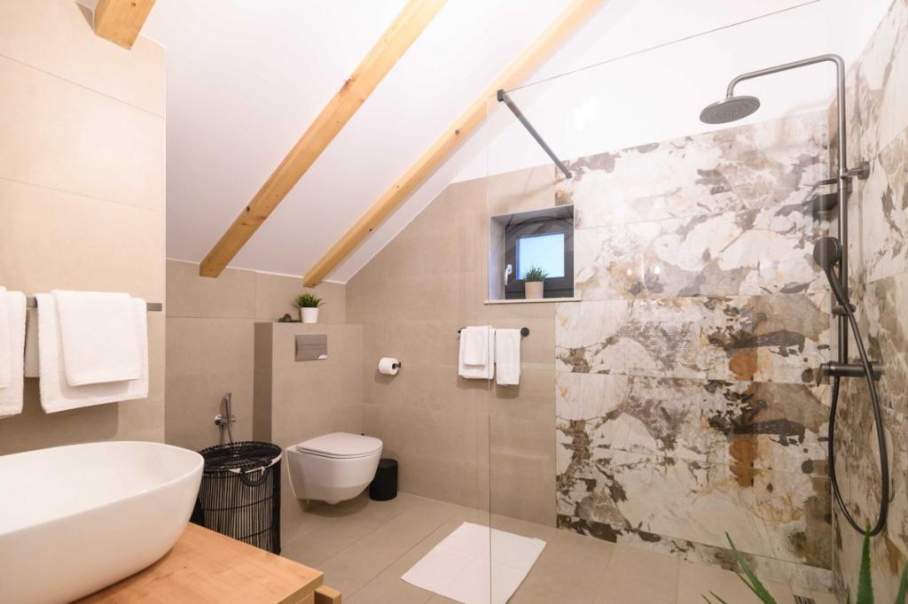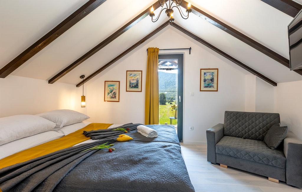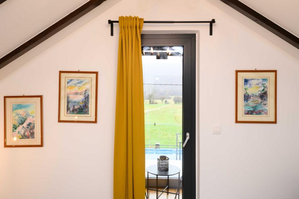 The Liko Diko holiday home is located in a clearing, on the edge of the forest (secluded), away from the road (300m) and is ideal for a holiday throughout the year. The combination of the warmth of tradition and modern amenities is the ideal combination for an authentic experience of nature. Whether you are looking for adventure, socializing with friends and family or complete relaxation, Liko Diko offers it all with its offer and location! With two rooms (each with 3 beds and each with its own balcony), two fully equipped bathrooms, a dining room and a kitchen with all the necessary appliances and basic groceries. A special experience is provided by the spa area with a glass wall and a view of the beautiful landscape - a jacuzzi for 4 people and a bio-salt sauna with Himalayan salt. Living room (if necessary, a sofa bed with a mattress topper can be pulled out) with a fireplace, a table football table (mini billiards), a children's corner, board games,.. Terrace covered with a pergola and a gas barbecue, outdoor pool (May-September), trampoline. table tennis table, children's playground, goals, bicycles for use,..