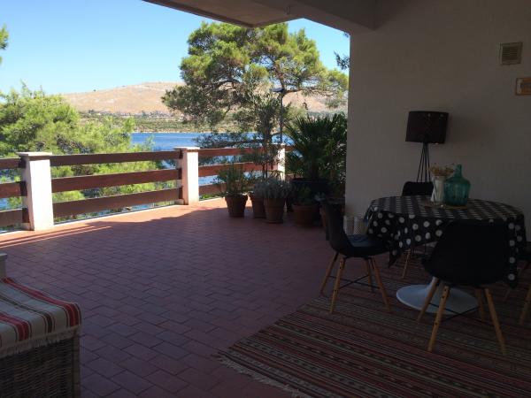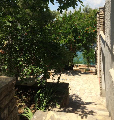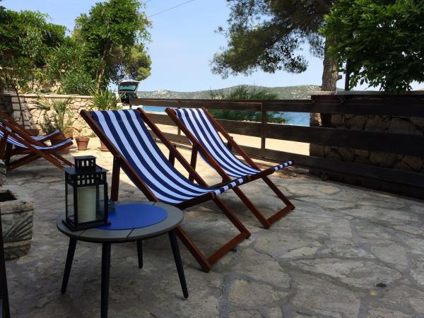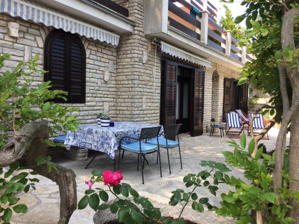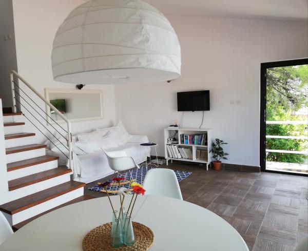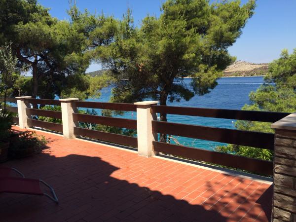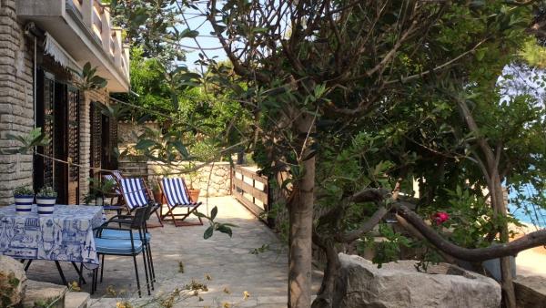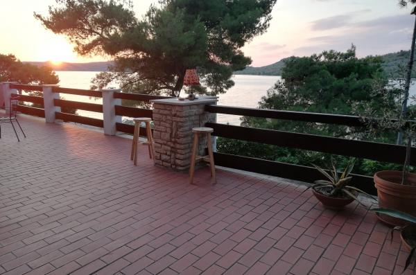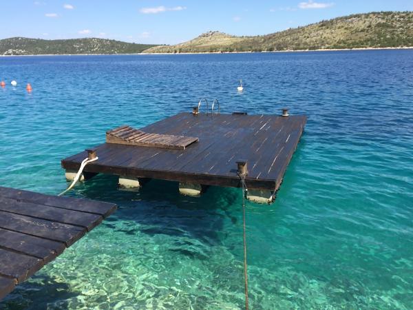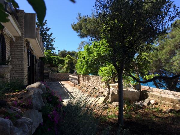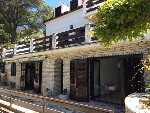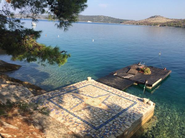 Completely and modernly equipped apartments in a quiet place Šparadići only 8 km from the center of Primošten. The house is located in the first and only row to the sea with a large garden in the green and pine forest. It is an architectural blend of modern and traditional Dalmatian houses with mosaics, stone sculptures and stone paths that lead through a spacious Mediterranean garden with local plant and tree plants such as fragrant lavender, rosemary, smell and olive trees, figs and lemons ... In our garden Guests can enjoy preparing meals on several outdoor barbecues and enjoy a pleasant companion on the spacious stone terrace with a large rustic stone table. The house, surrounded by woods and a Mediterranean garden with a crystal-clear, azure blue sea on the other hand, is an ideal place for unique moments of peace and relaxation. The sea is only 5 meters away from the house; private beach and shore approx. 60m mostly used only by our guests as stone mole with mosaic and a wooden floating pontoon in the extension.